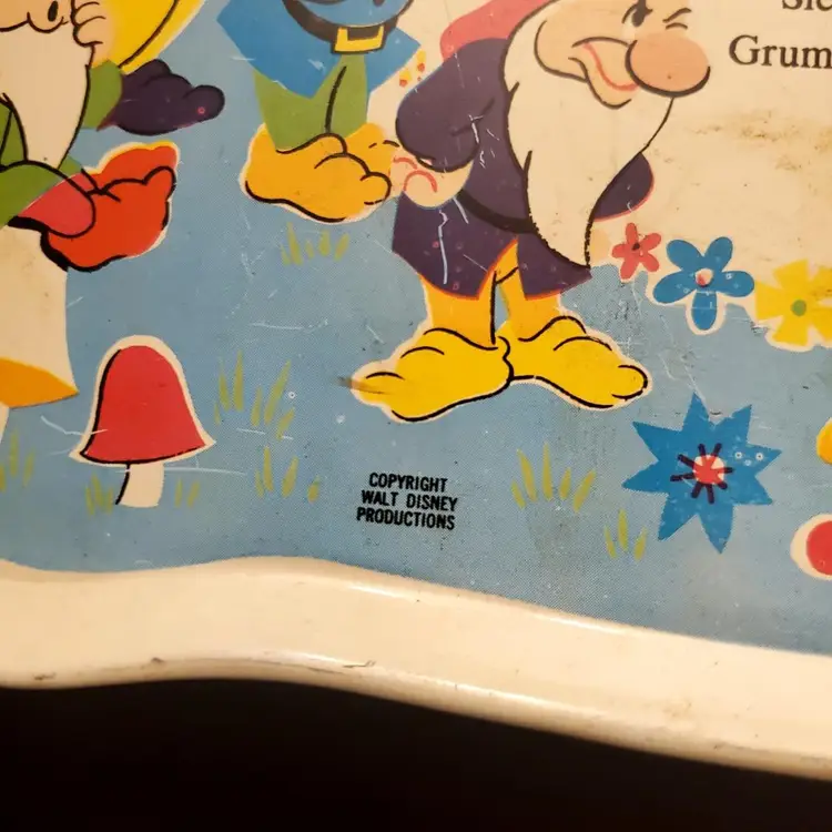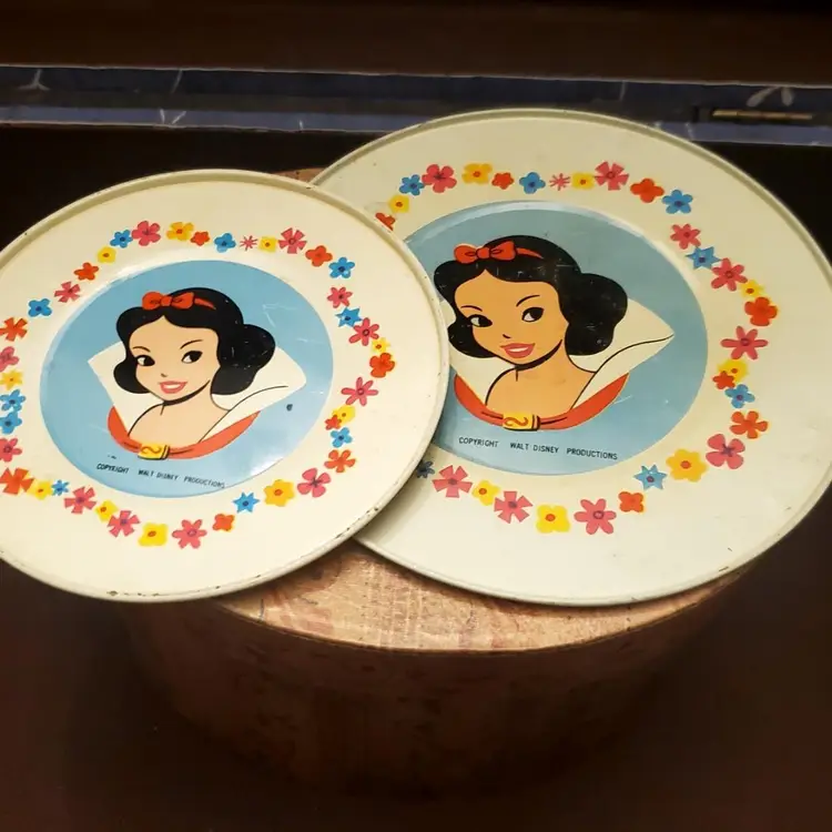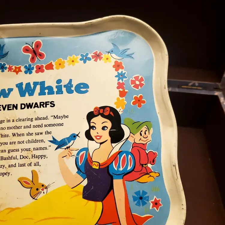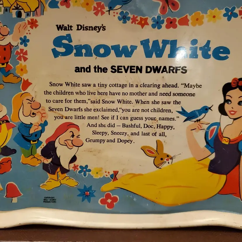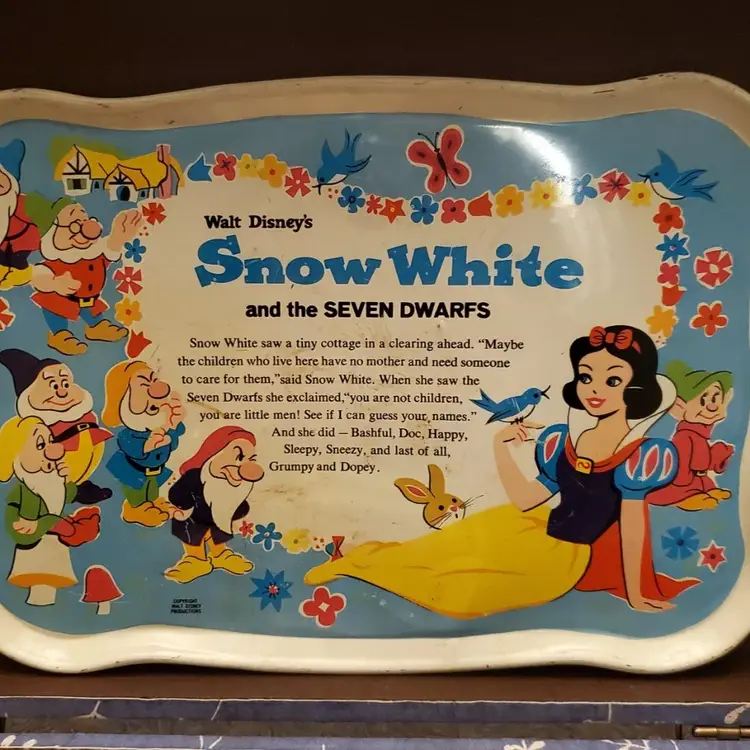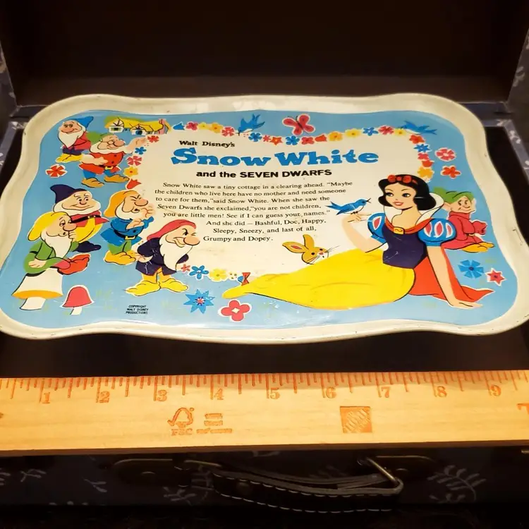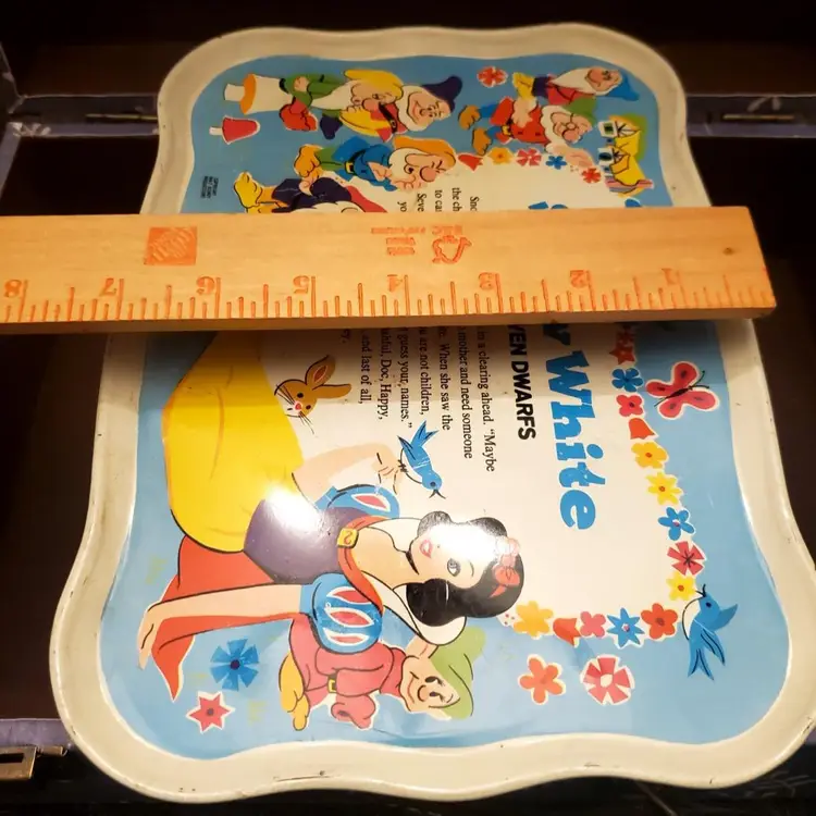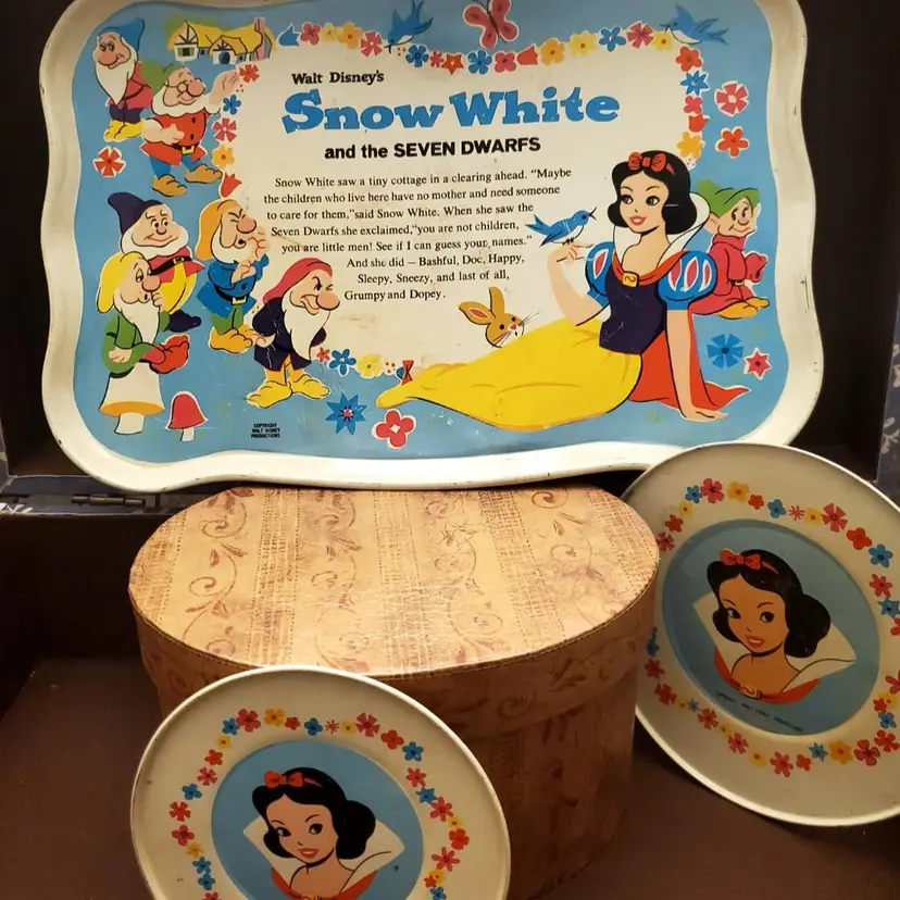 This is a cute vintage metal snow white tray. In great vintage condition, but does have some dings and scratches. Please review all photos. Approximate measurements in photos. Two small plates included.