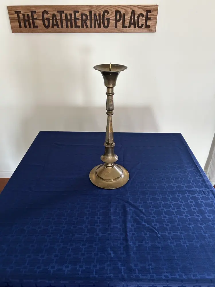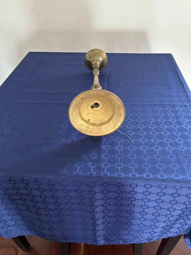 Elegant vintage brass candlestick holder. Perfect for adding a classic touch to any room. H 20 in diameter 8 in wt 3.7 #