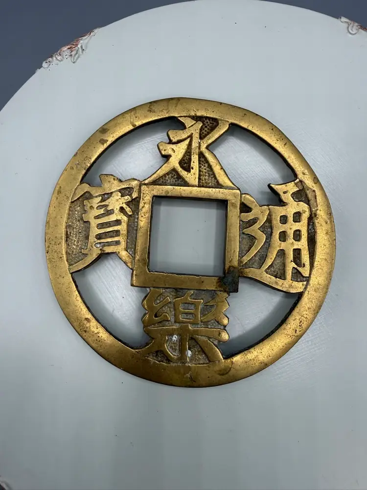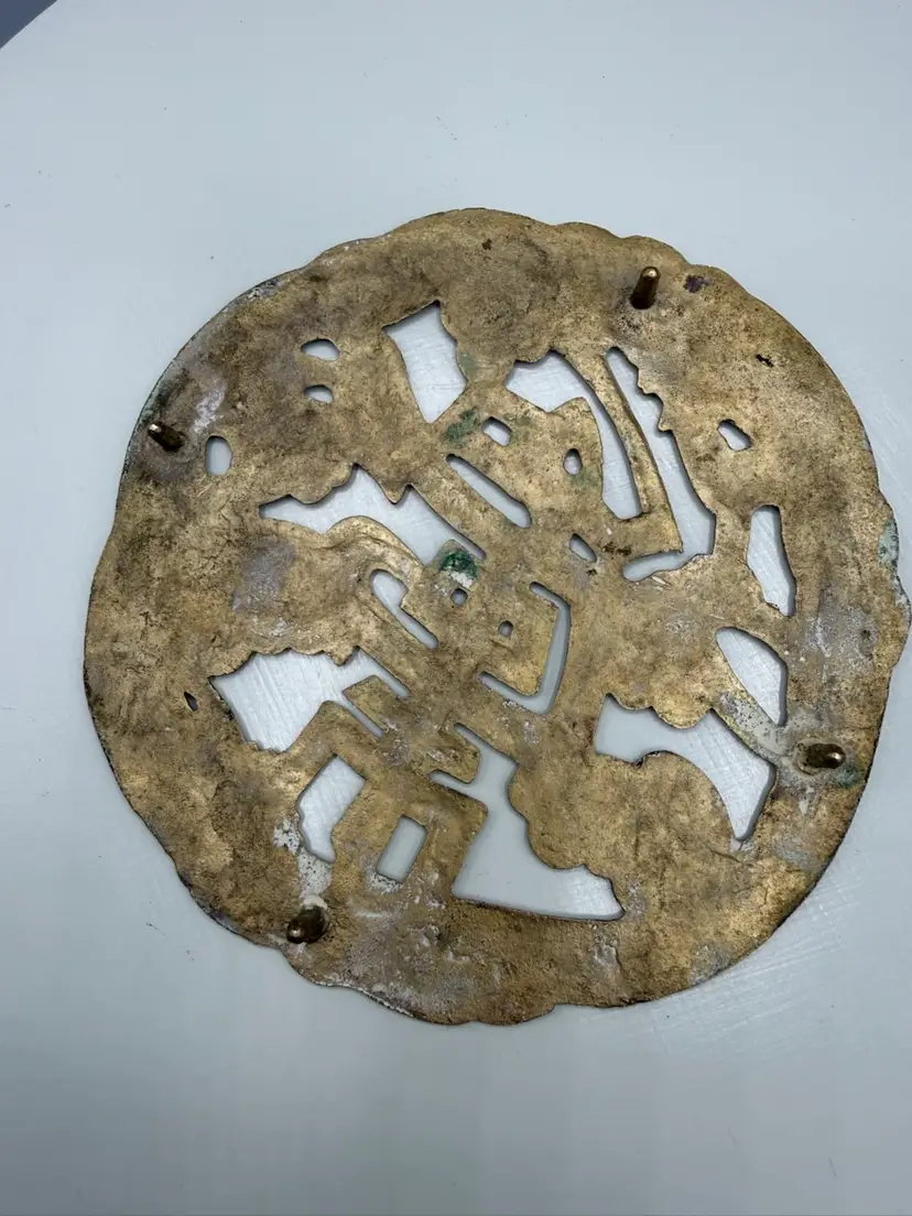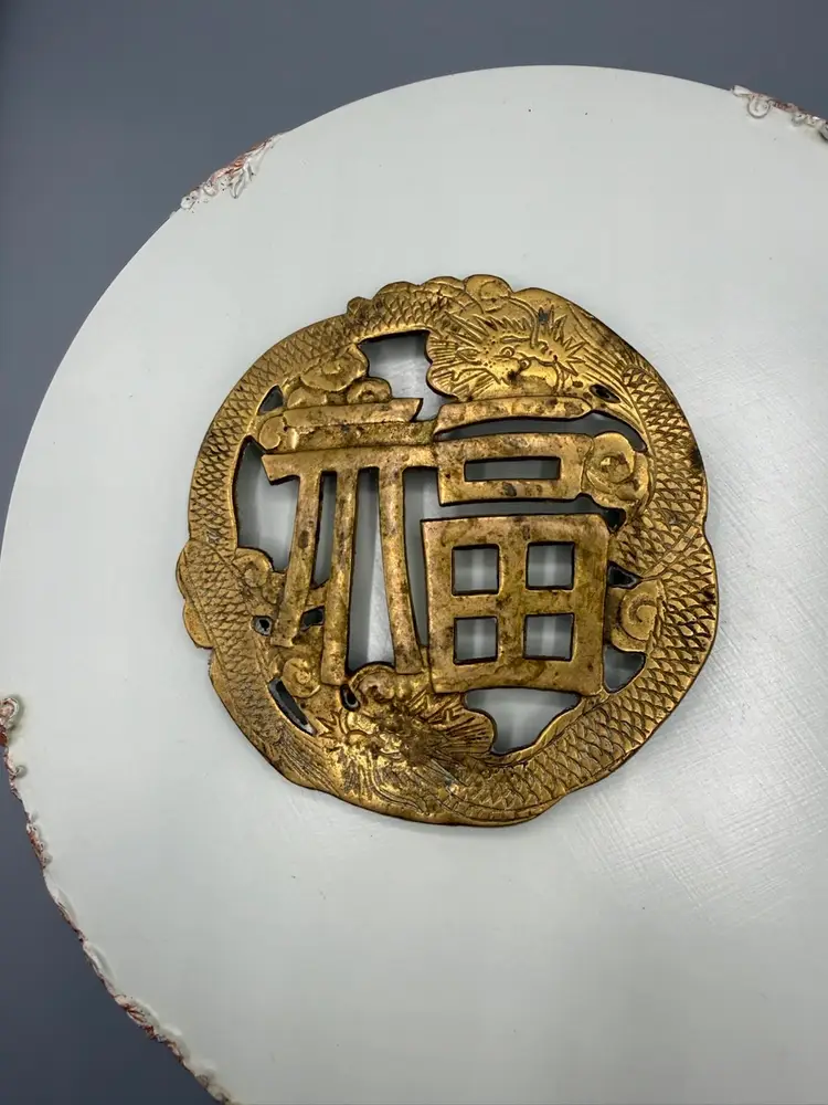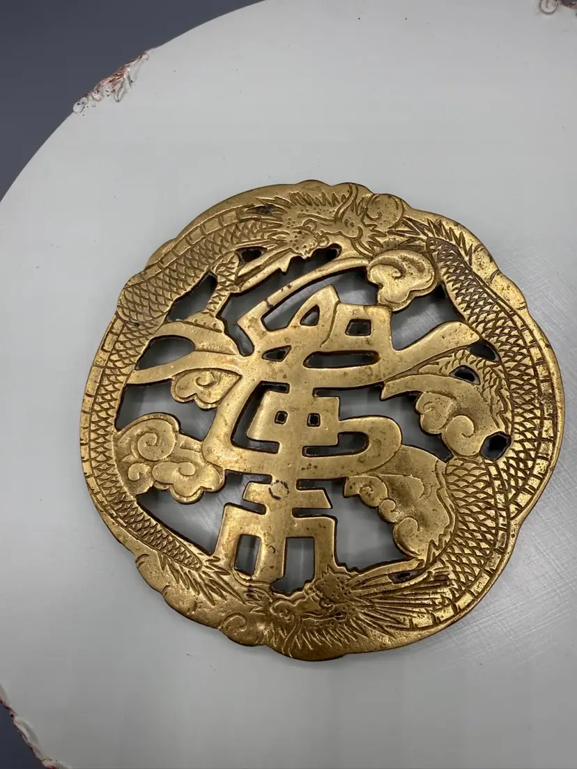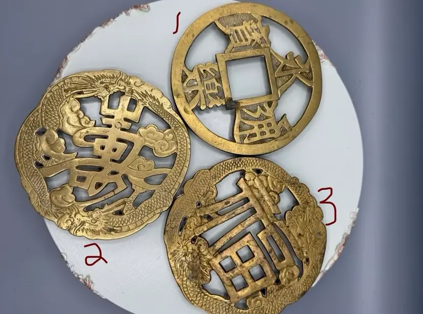 Beautiful collection of three vintage solid brass decorative items, each showcasing a unique, intricate Chinese character design surrounded by traditional motifs. Natural vintage patina w/light surface wear consistent with age. Shipping overtures over $1.00 will be refunded