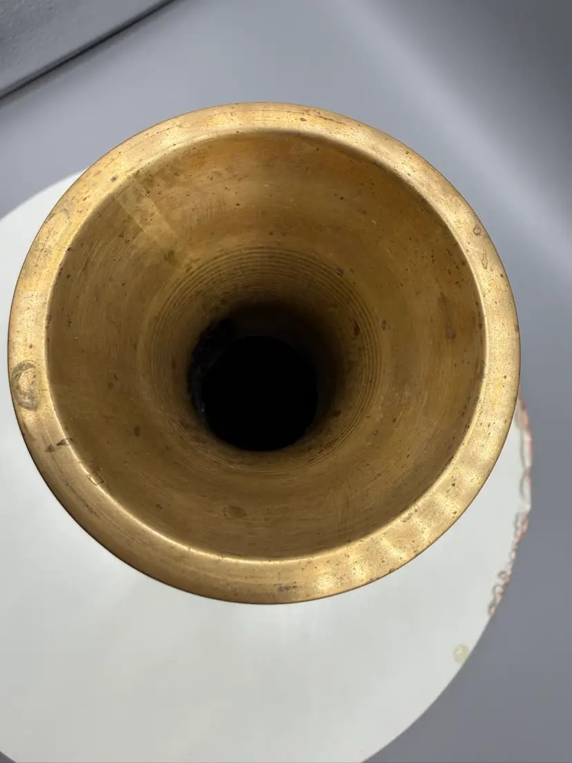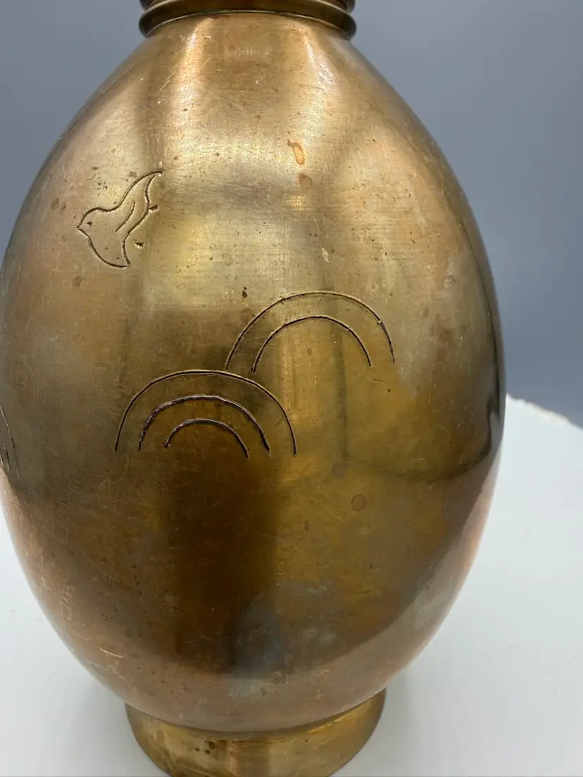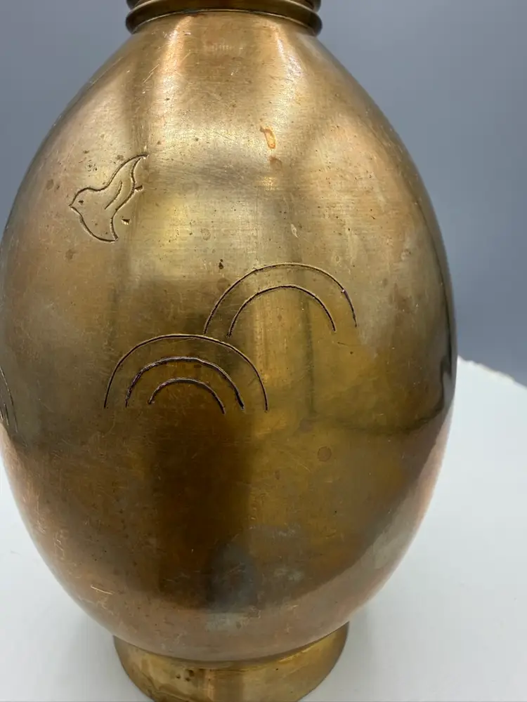 Unique egg-shaped body and a flared, ribbed neck. It is adorned with intricate, hand-etched designs of flying birds and stylized clouds, common motifs found in older, handcrafted pieces from India.