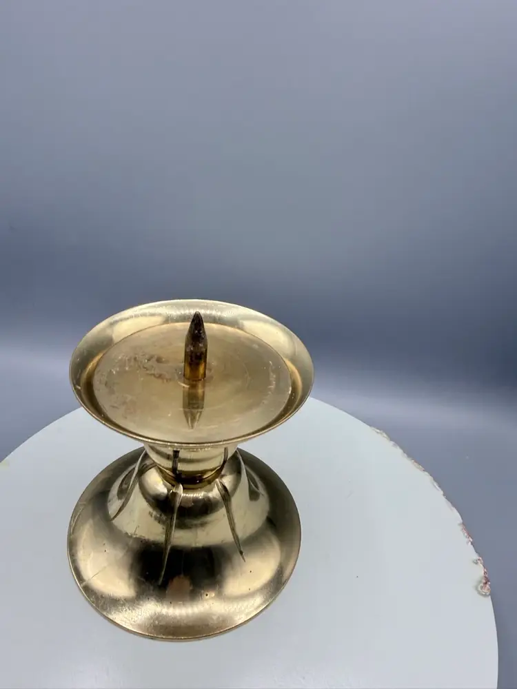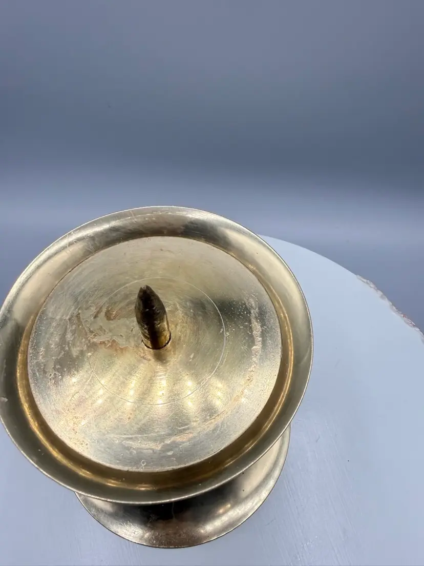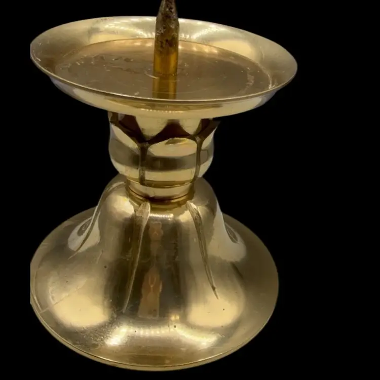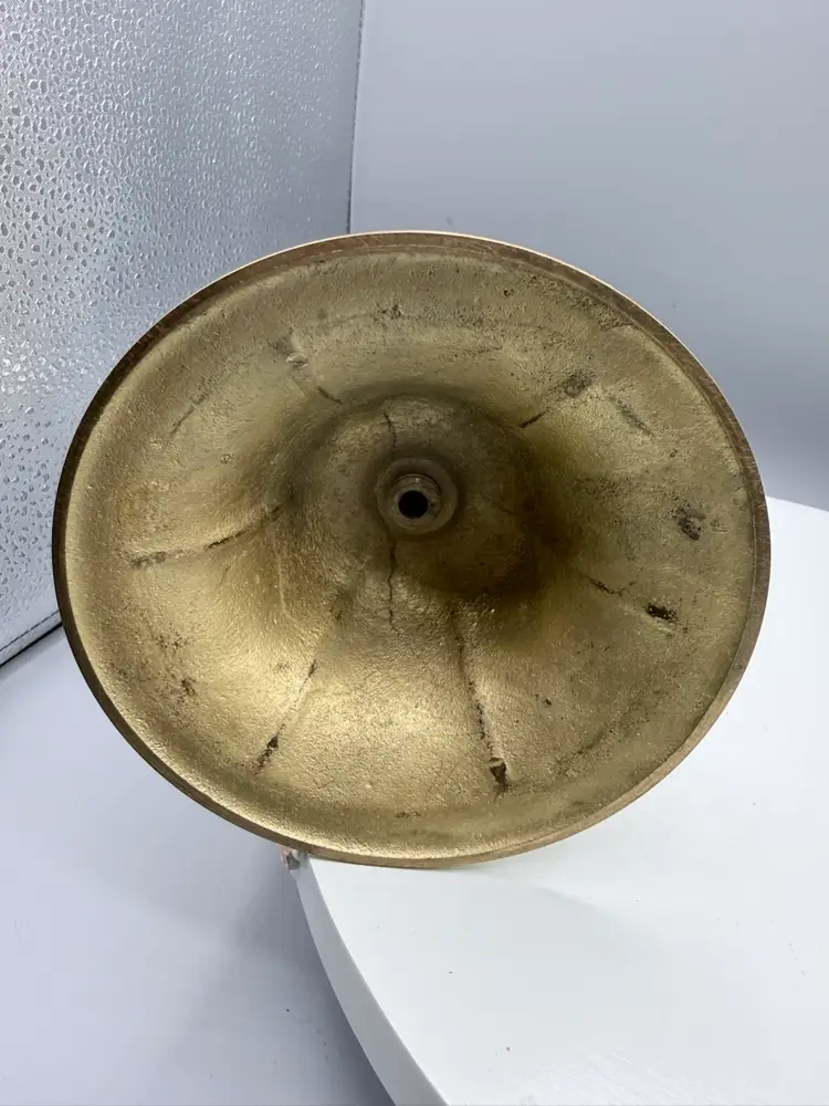 Features a distinctive lotus flower or leaf-inspired design surrounding the stem and a wide, flared, bell-shaped base. In a style popular during the Mid-Century Modern and Hollywood Regency eras.