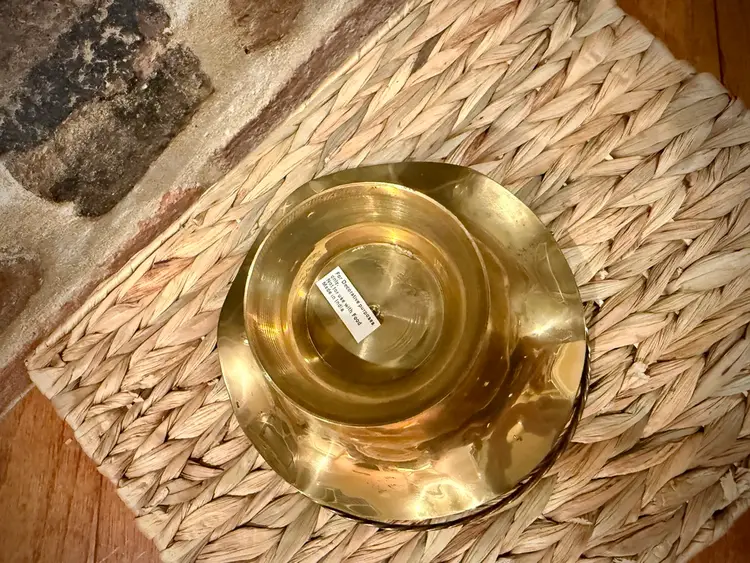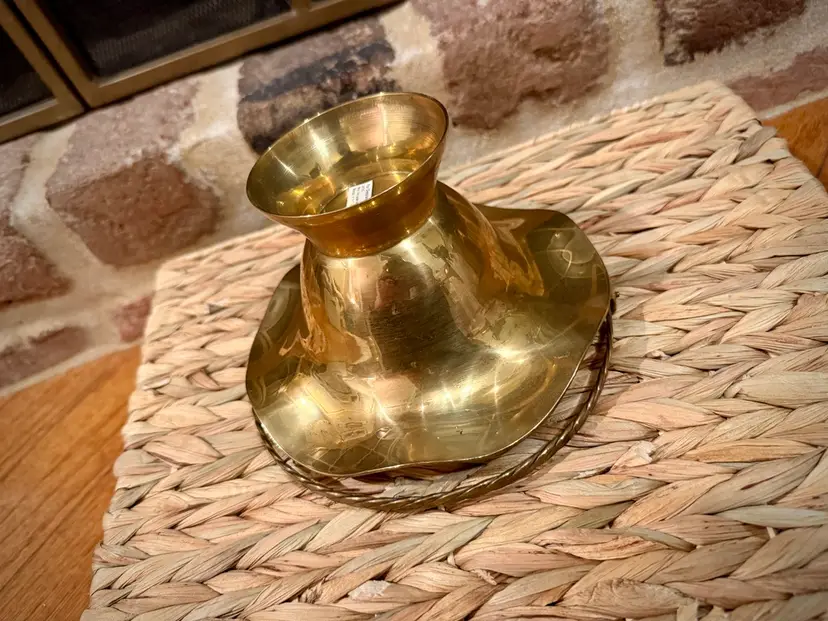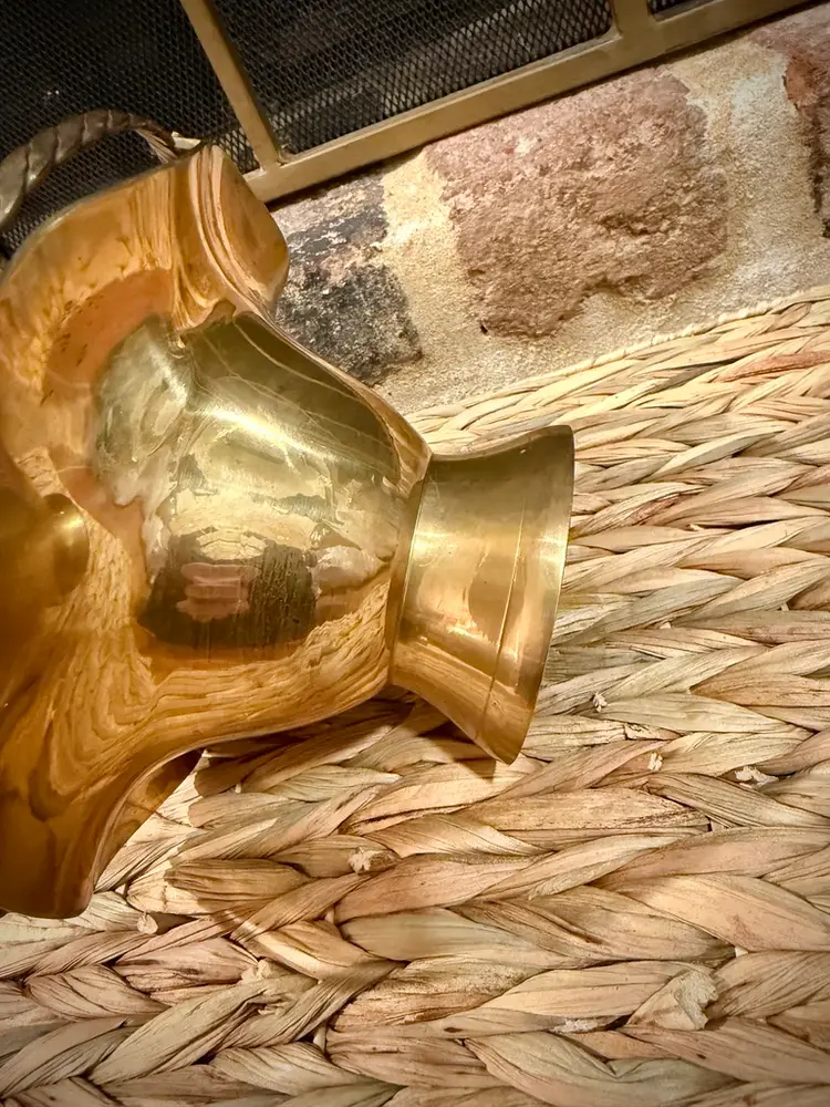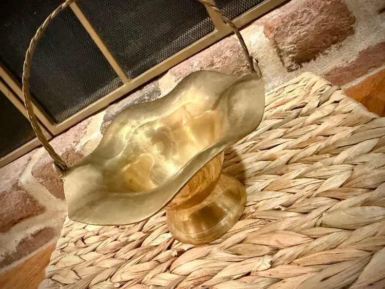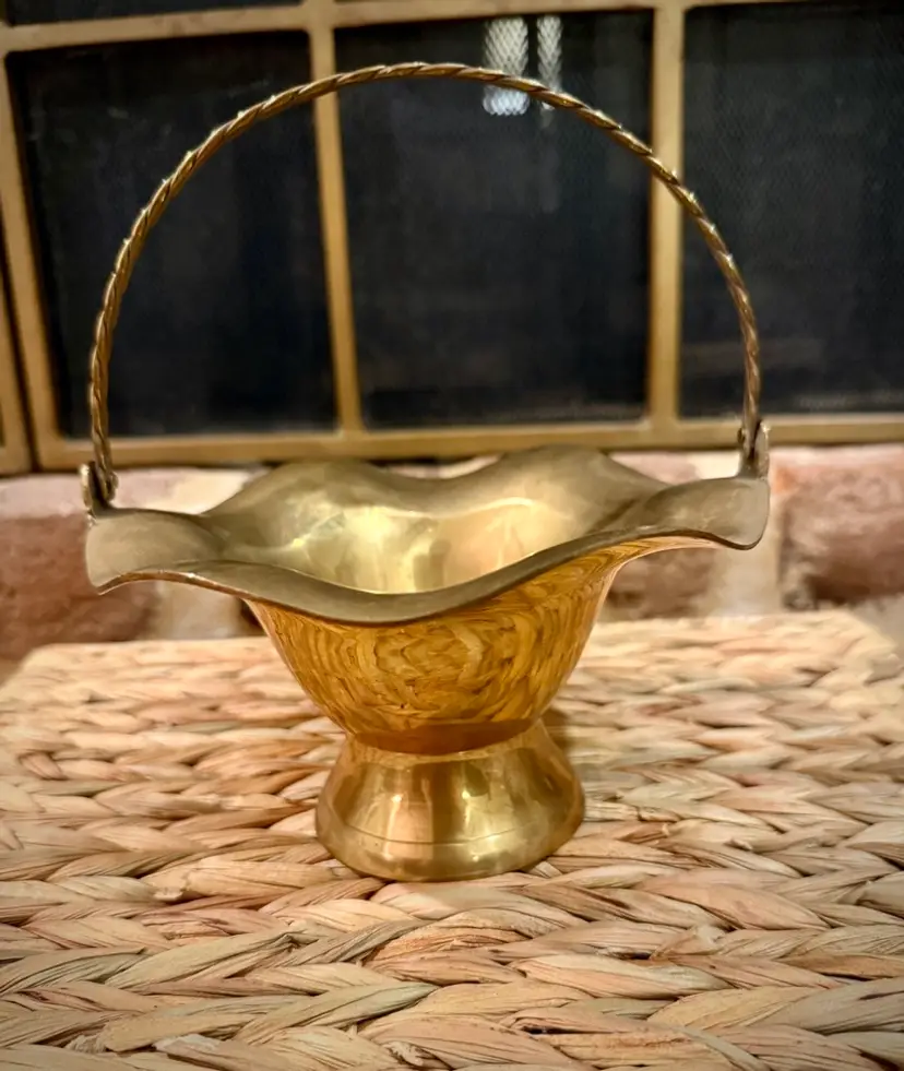Add a touch of timeless elegance to your space with this vintage solid brass pedestal basket. Handcrafted in India, it features a lovely scalloped edge, twisted brass handle, and flared pedestal base — a graceful combination of curves and shine. Perfect as a candy dish, trinket holder, or small floral accent piece.