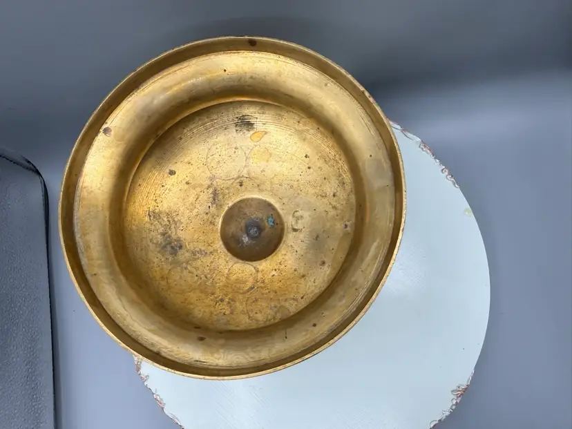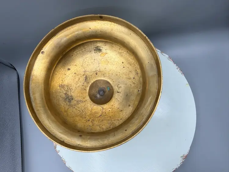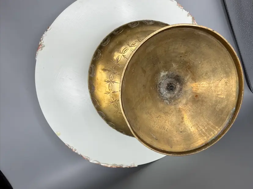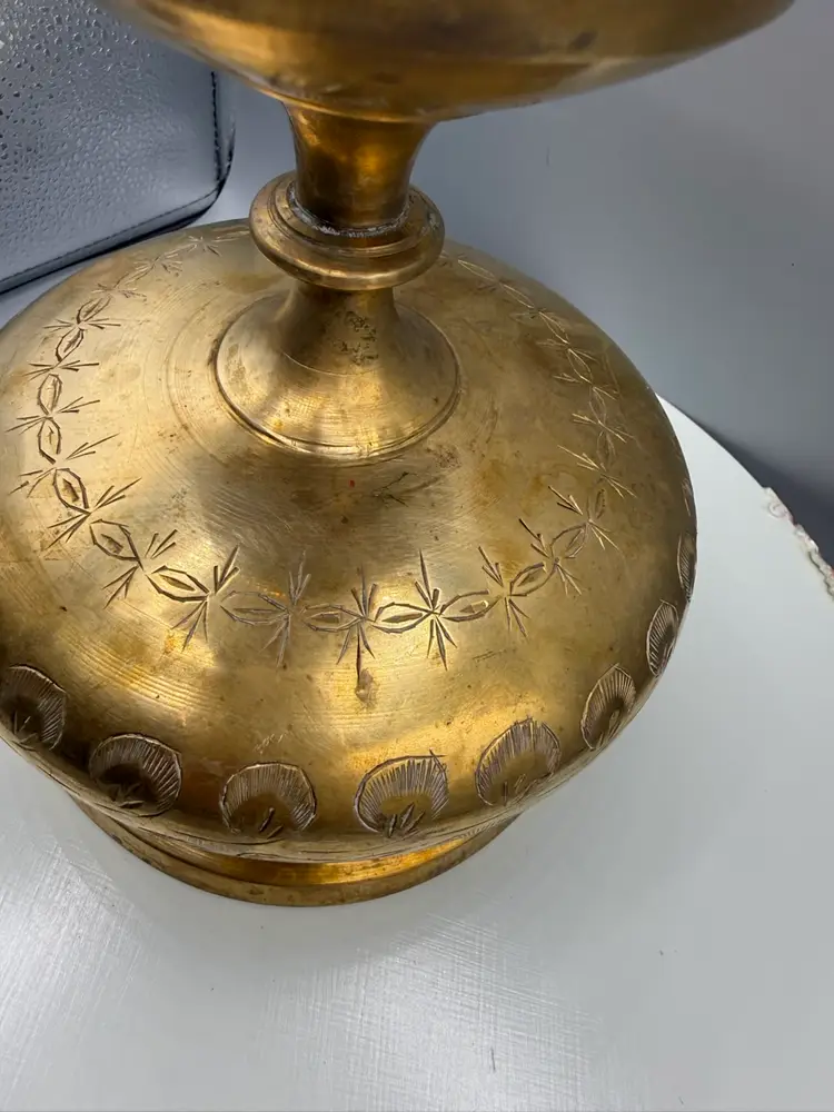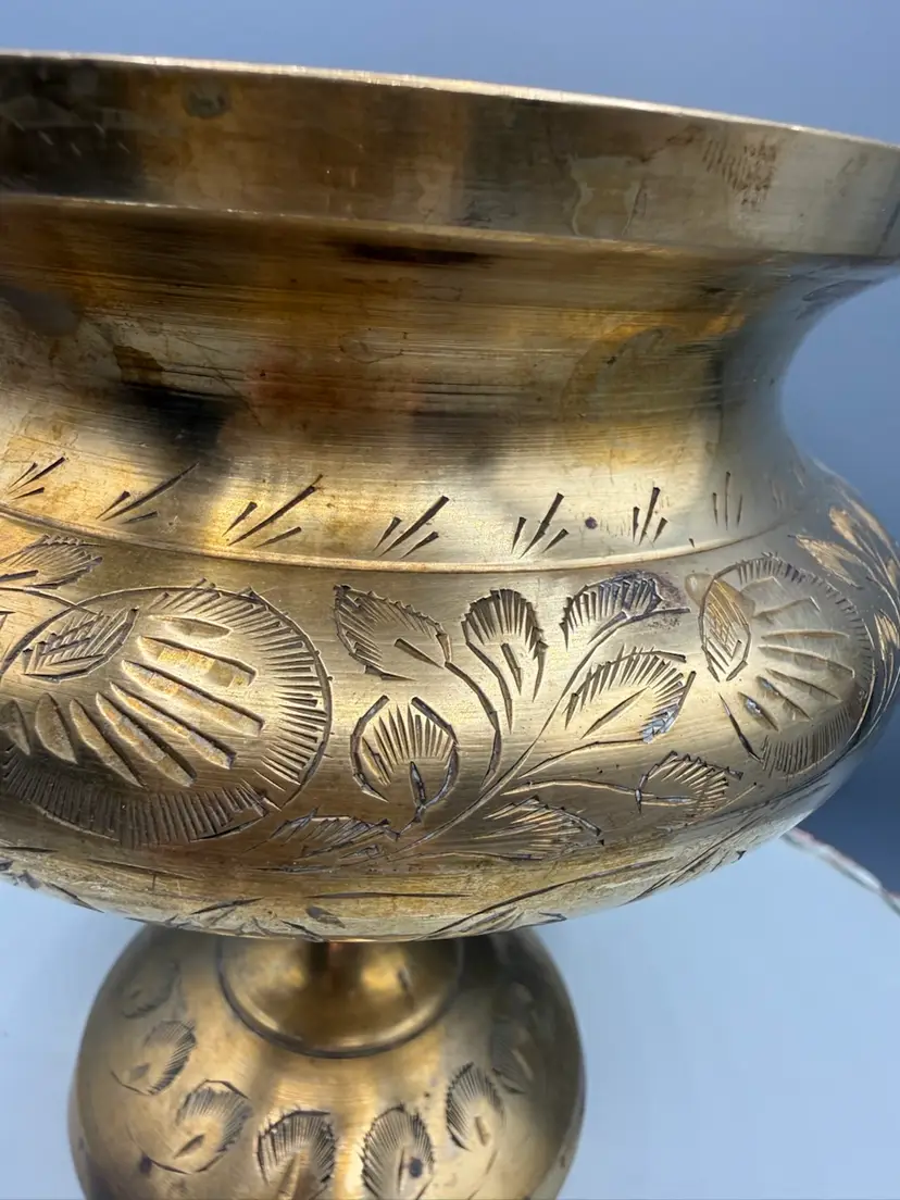 Vintage solid brass pedestal bowl featuring hand-etched floral and leaf motifs around the body and base. The bowl has a wide flared rim and a classic raised pedestal, giving it an elegant, balanced silhouette.
