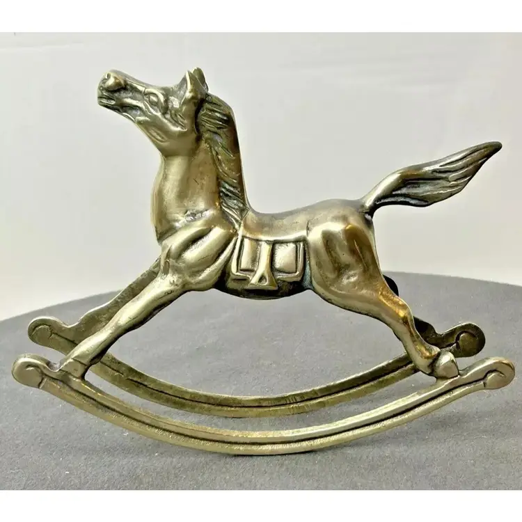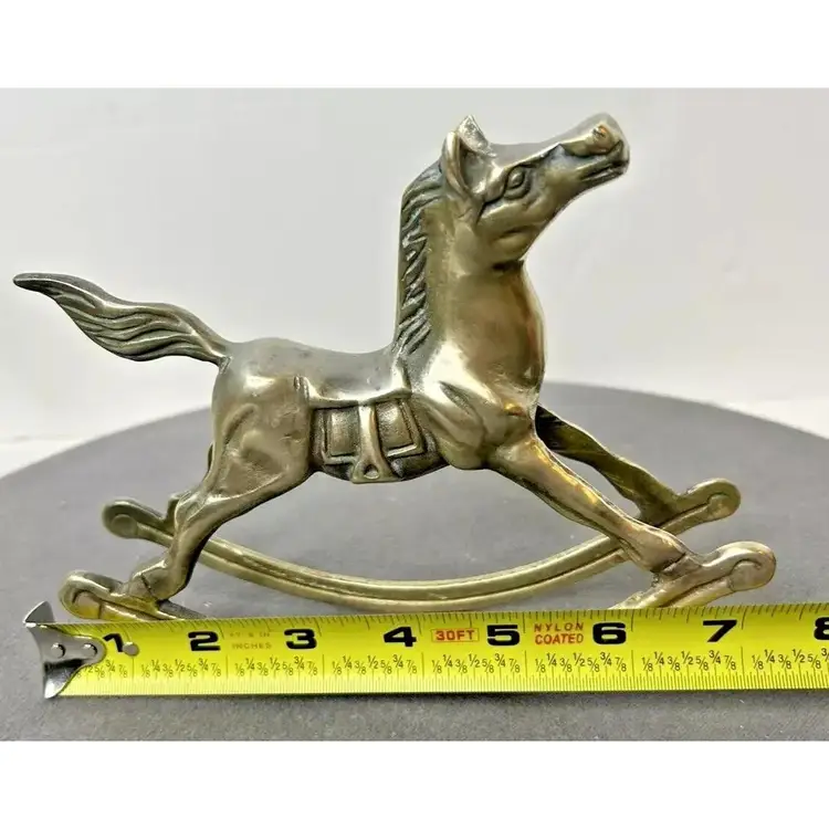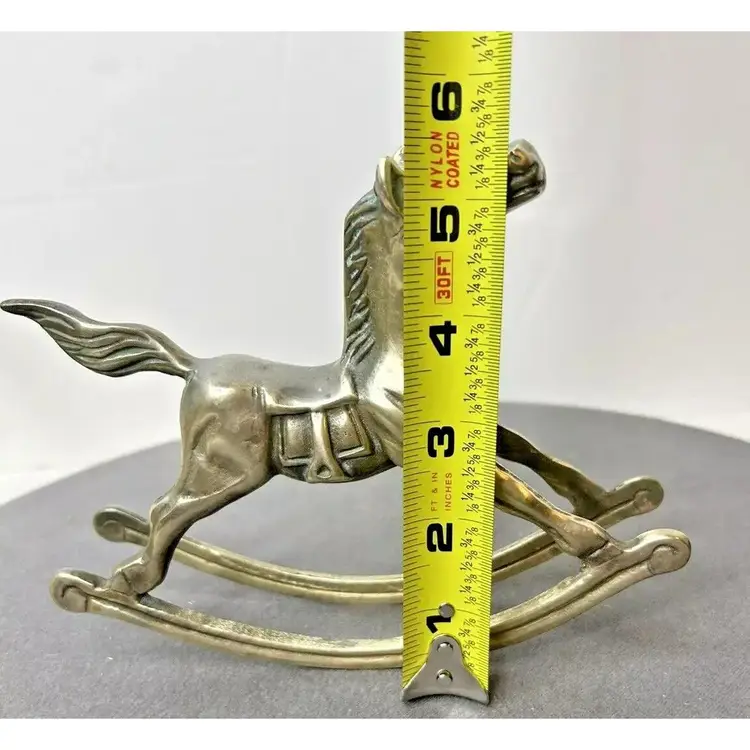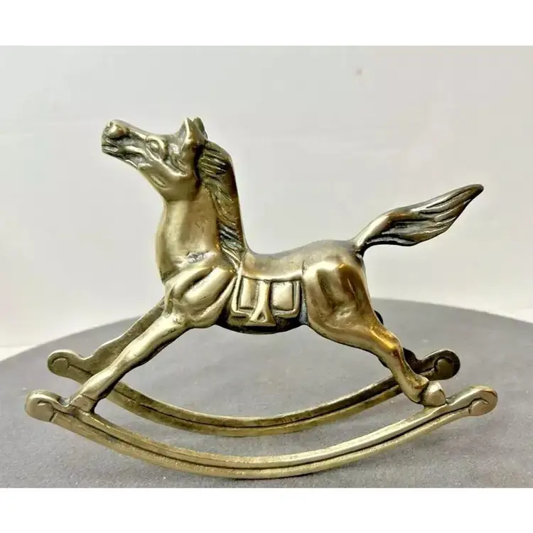 Add a touch of vintage charm to your desk or paperweight collection with this beautiful brass rocking horse figurine. Crafted from solid brass, this piece exudes elegance and style. Measuring 5.5" inches tall, it is the perfect size to display on any surface. The intricate details of this figurine make it a true collector's item. This piece is not only a stunning desk décor, but also a great conversation starter.