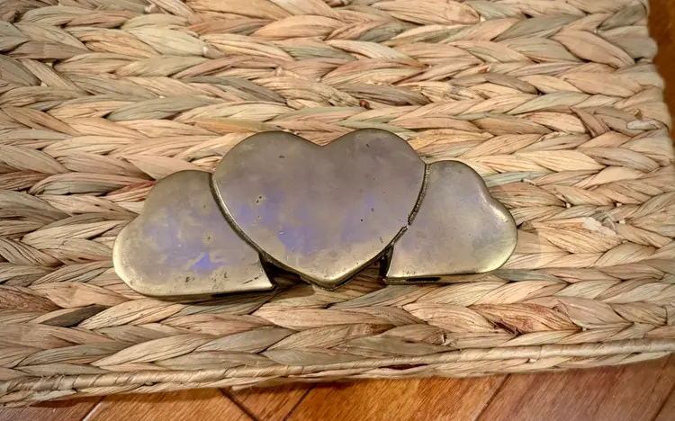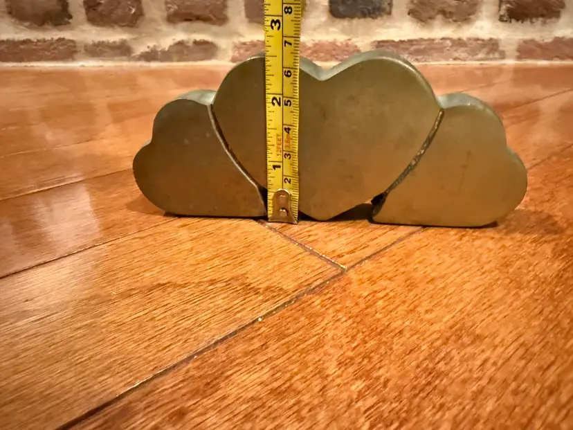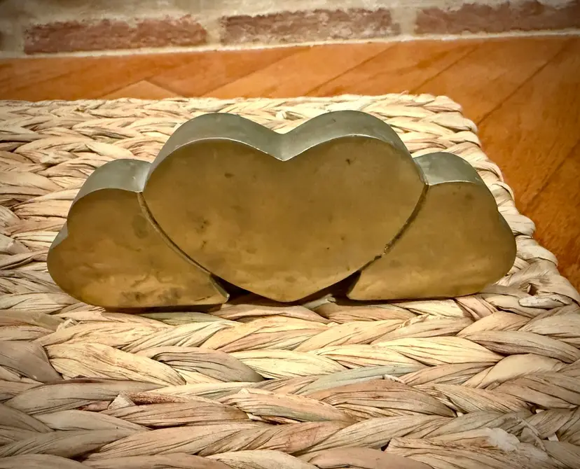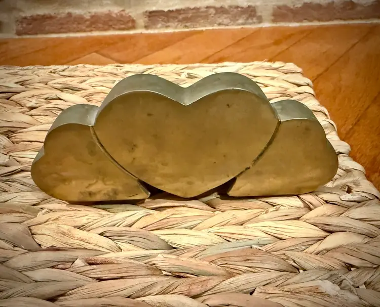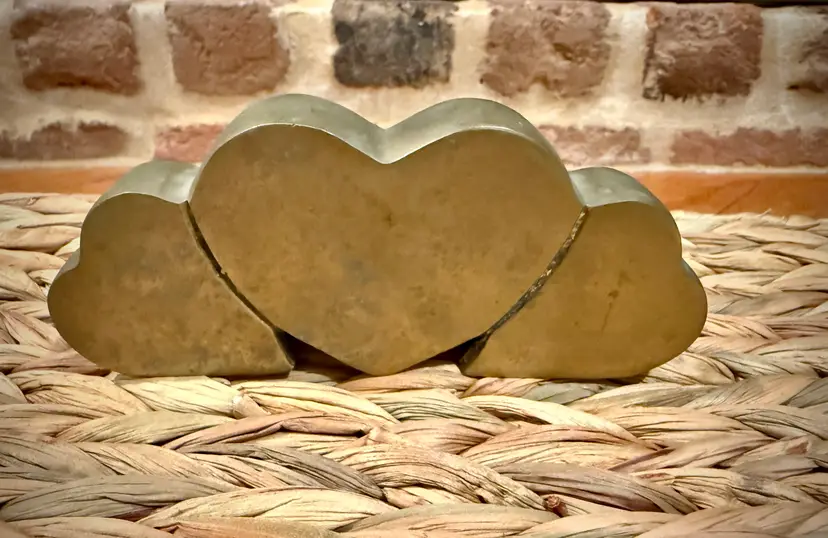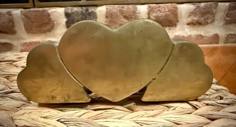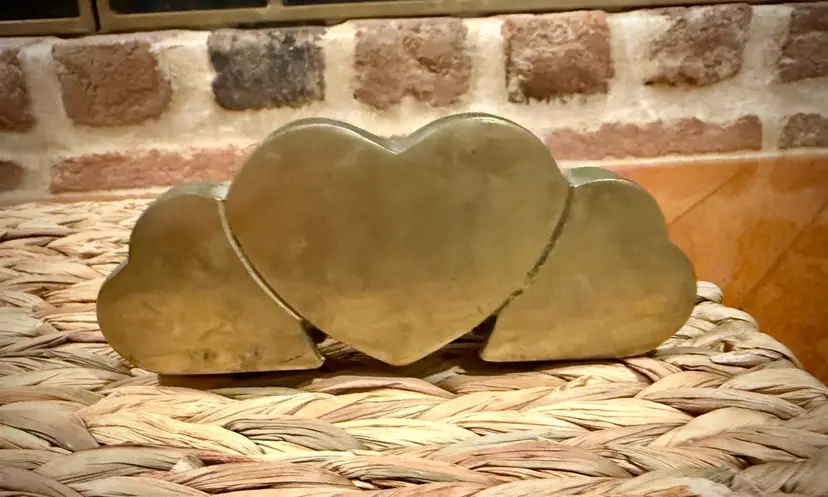 This charming vintage brass sculpture features three overlapping hearts, beautifully cast in a minimalist mid-century style. Crafted from solid brass with a warm golden tone, it offers a smooth, weighty feel and versatile function — perfect as a decorative accent, bookend, or paperweight. The trio of hearts adds a timeless romantic touch, making it an ideal gift for Valentine’s Day, weddings, anniversaries, or simply as a symbol of love and connection.