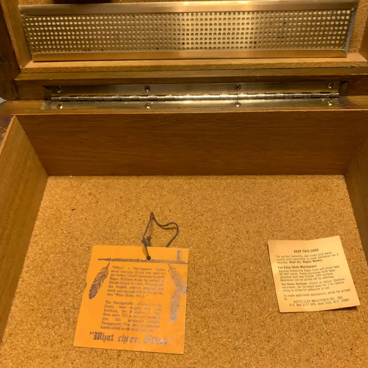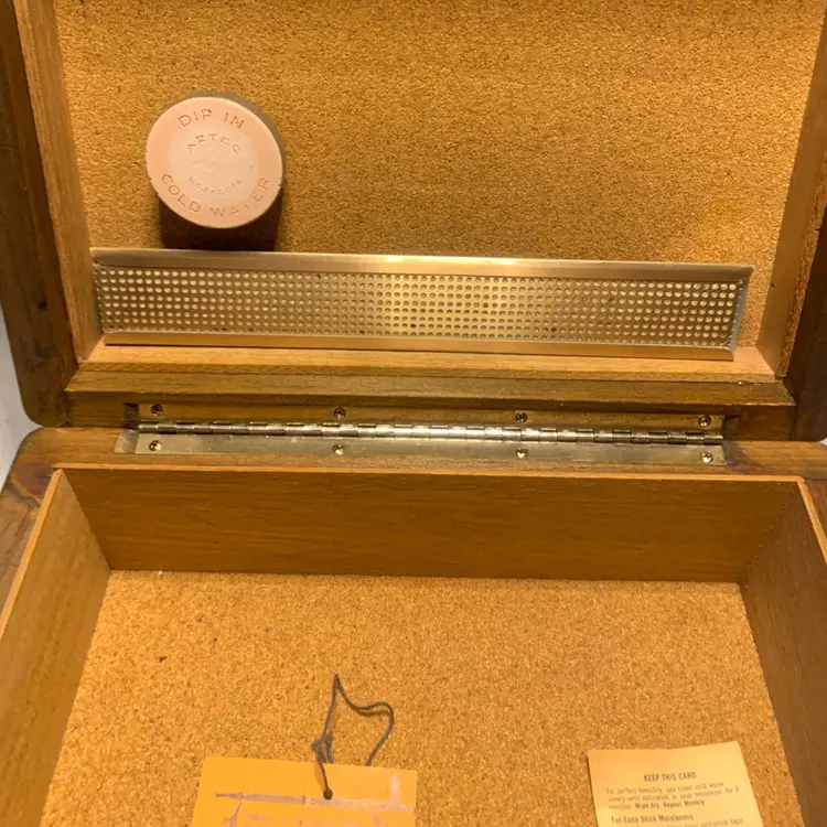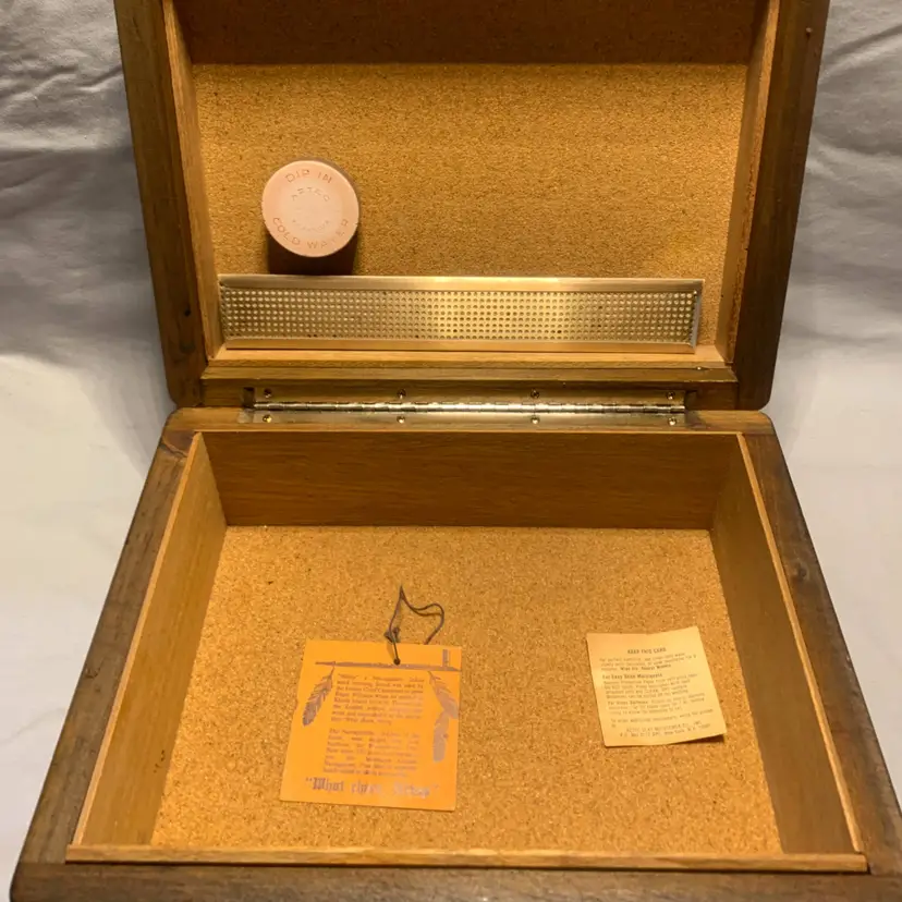 This vintage solid wood cigar box set includes a Xikar cutter and a 1984 Zippo lighter, making it a collectible item for cigar enthusiasts. The box measurements are 11" x 8" x 3.5 ". The combination of high-quality materials and unique pieces from different eras adds a touch of nostalgia and sophistication to this set. Perfect for those who appreciate antique and vintage tobacciana items as well as fine craftsmanship.