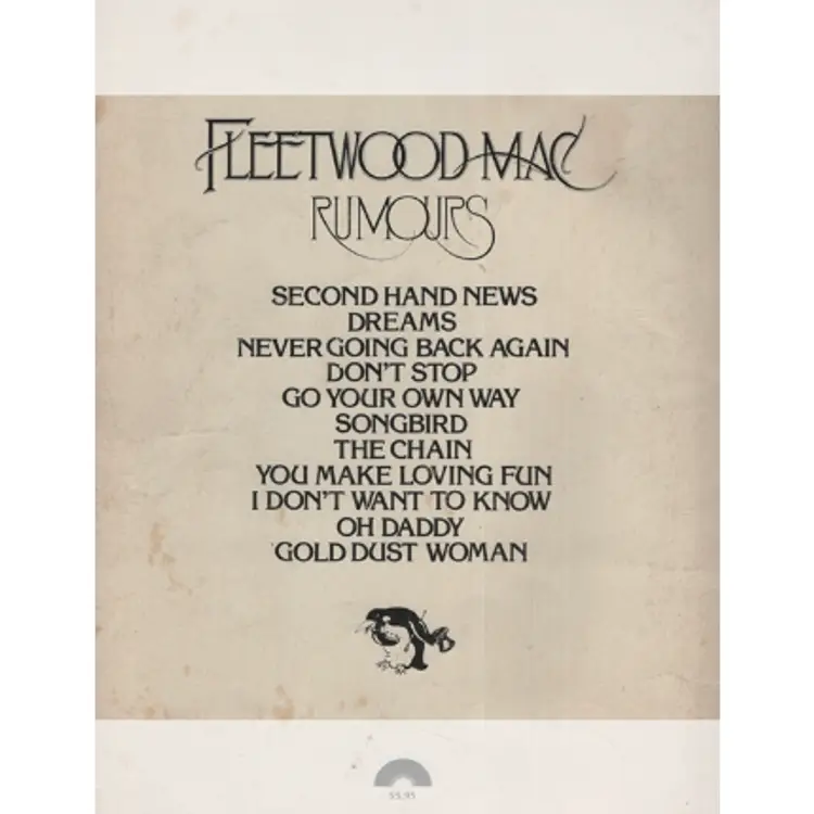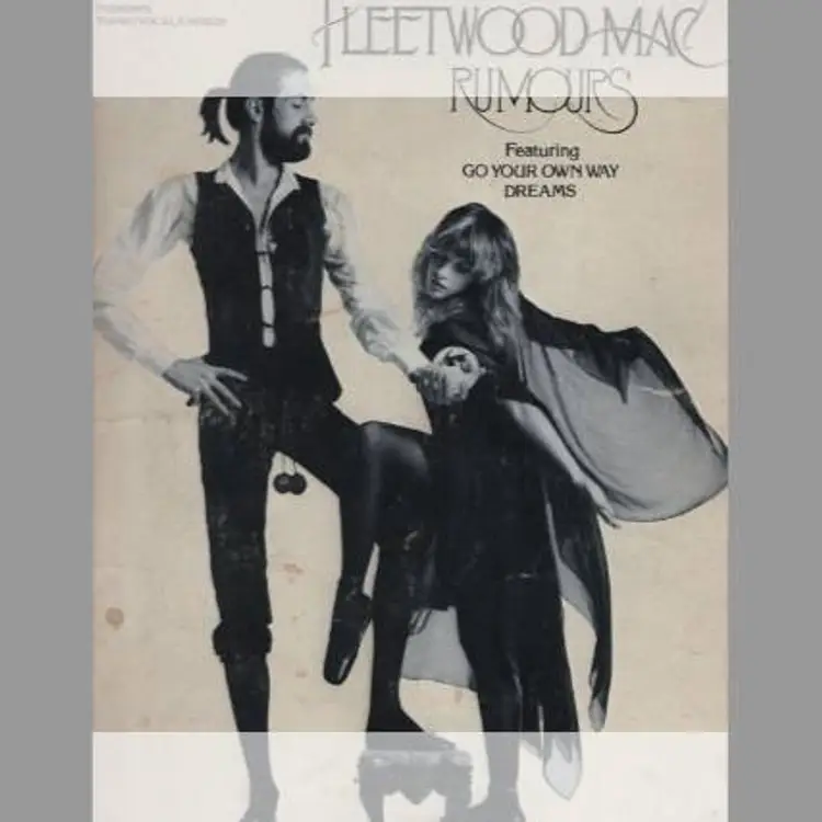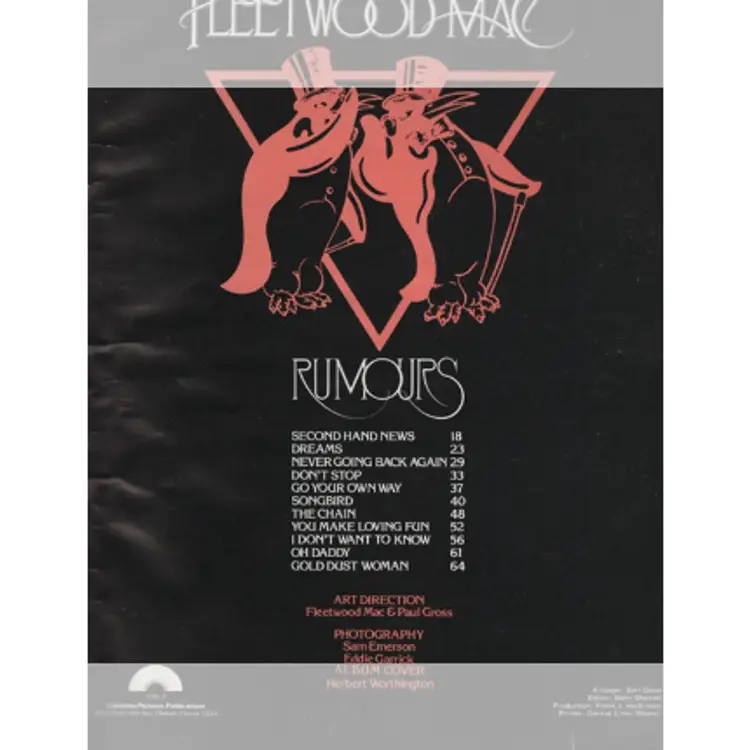 Vintage song book to Fleetwood Mac's album Rumors. Contains lyrics and music, black and white photos, and color photos.