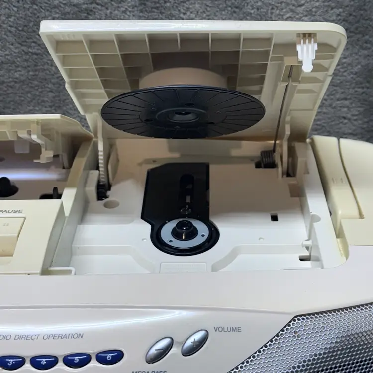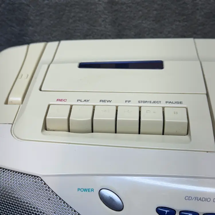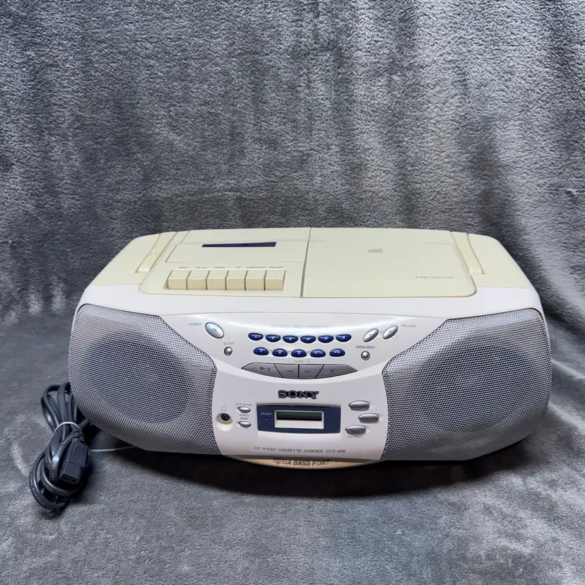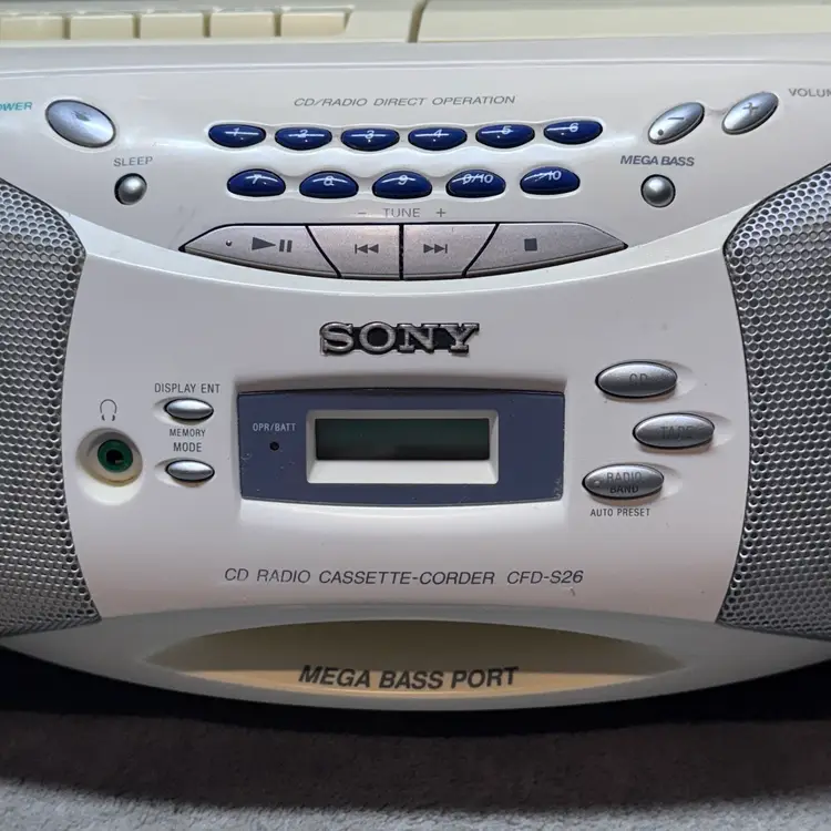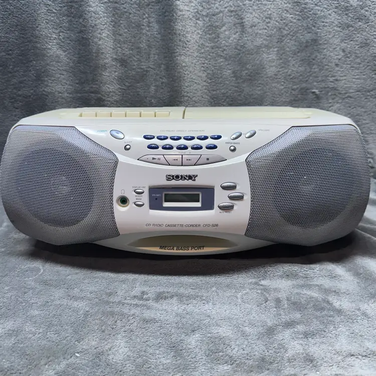 The Vintage Sony CFD-S26 Boombox is a classic audio device featuring AM/FM radio, CD player, and cassette recorder. With Mega Bass technology, it delivers powerful sound quality. This beige-colored boombox includes a headphone jack for private listening and a CD recorder for creating your own music compilations. The model CFD-S26 has a single CD changer capacity, making it easy to switch between different discs. Ideal for those seeking a nostalgic audio experience with modern features.