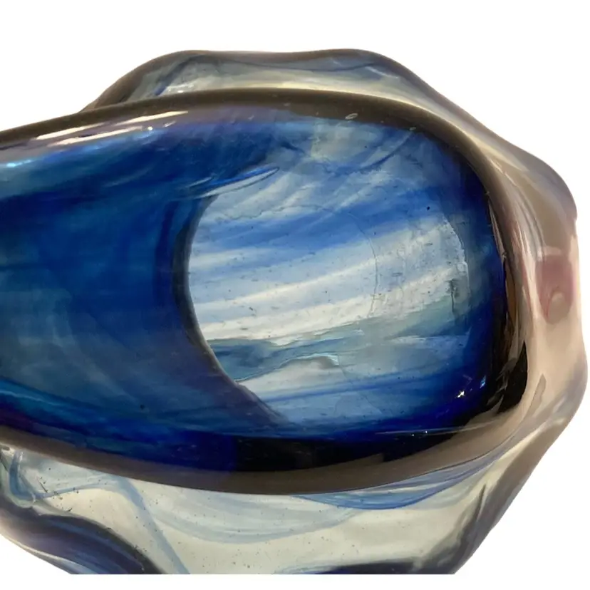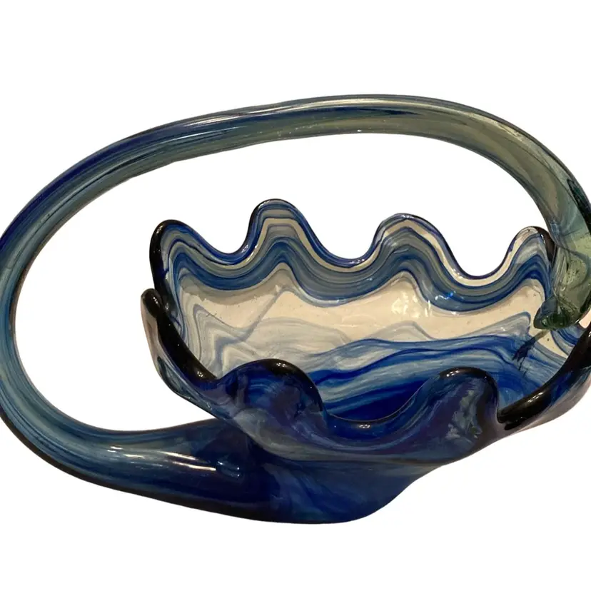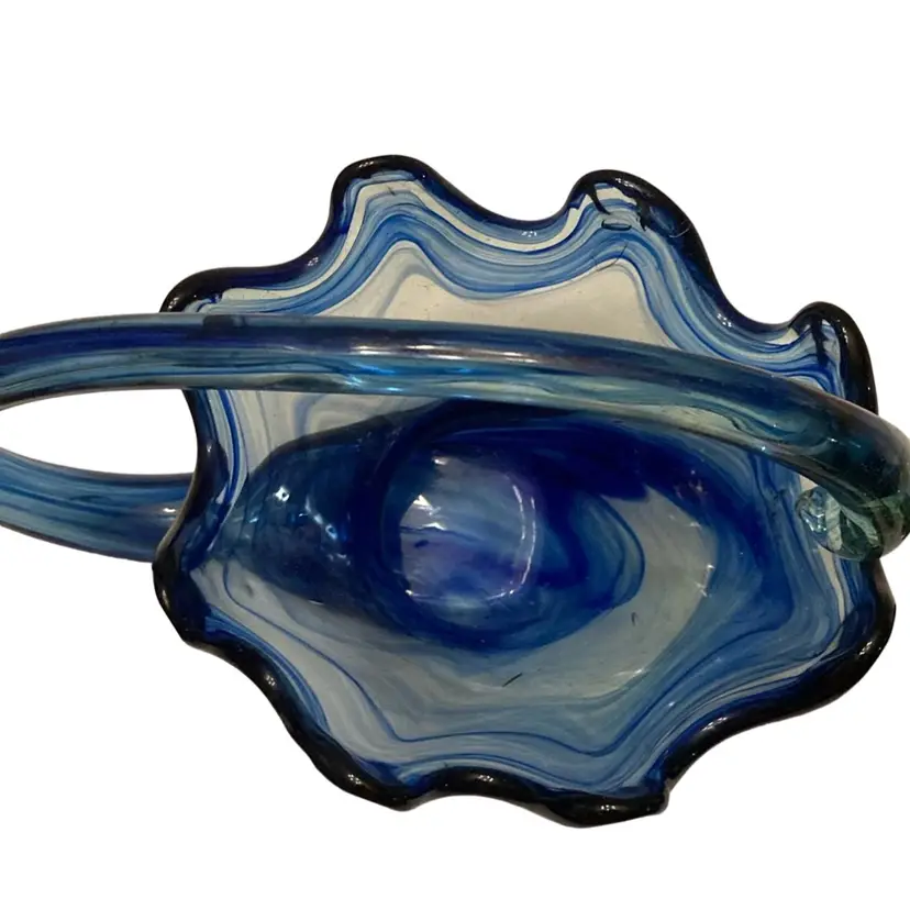 This beautiful blue swirl glass bowl has a handle that wraps around in a usual way. It is 6.25” tall and 8” long. No cracks or chips.