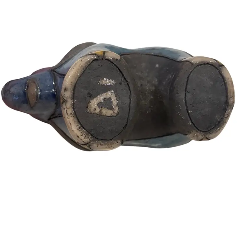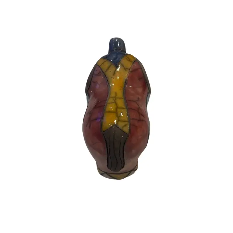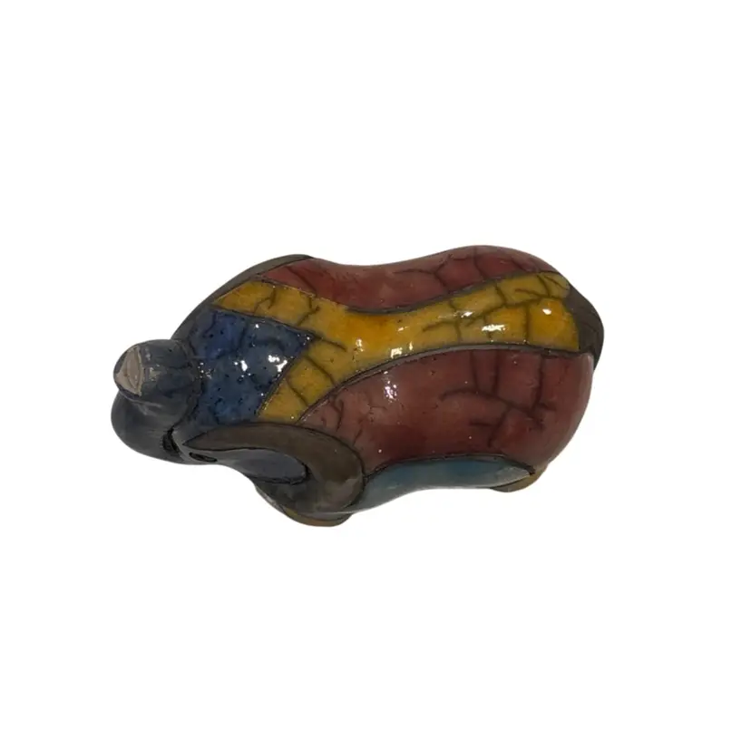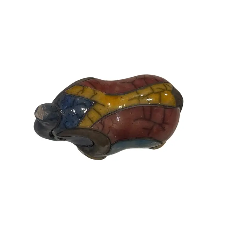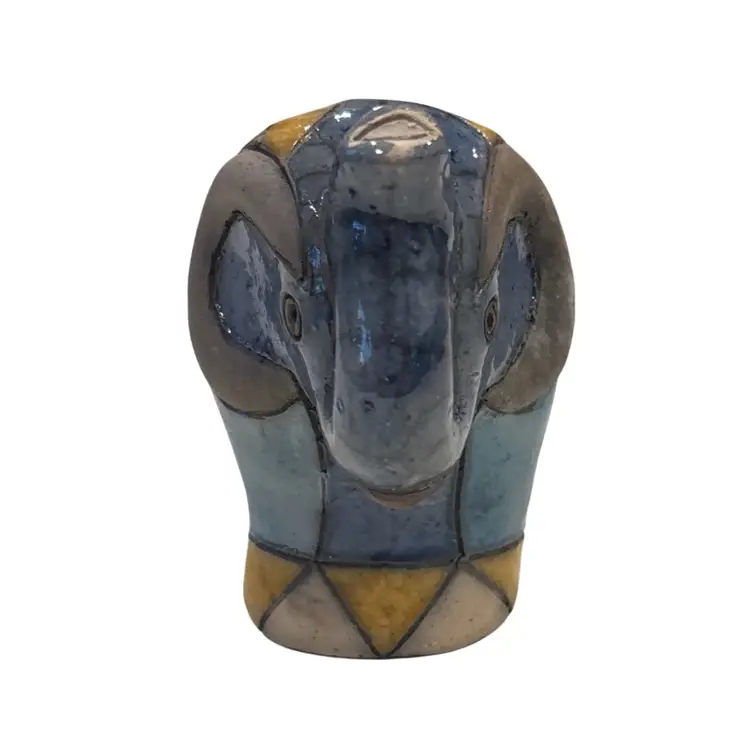 This vintage South African Raku Elephant figurine is a hand-crafted piece of pottery that showcases intricate patchwork patterns in multicolor. Standing at approximately 5.5 inches tall, this decorative item features a unique Raku style finish with a glazed exterior. Signed by the artist, this original artwork captures the essence of South African artistry and craftsmanship, making it a standout piece for collectors or those who appreciate colorful and eclectic decor. Made from clay using traditional pottery techniques, this figurine exudes a sense of authenticity and charm that reflects the rich cultural heritage of South Africa. Beautiful piece no chips or cracks, some crazing. See pics.