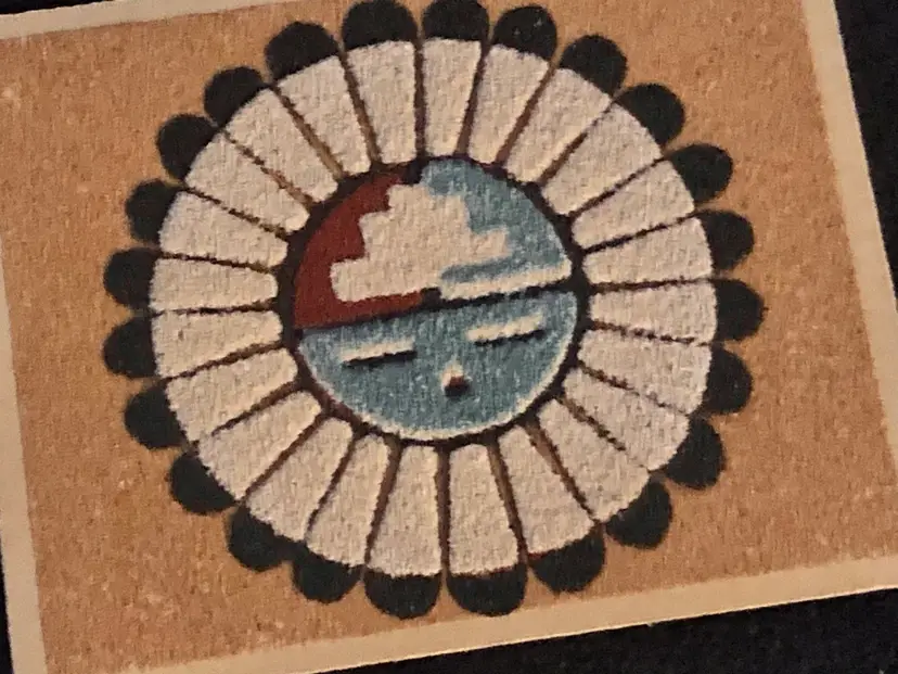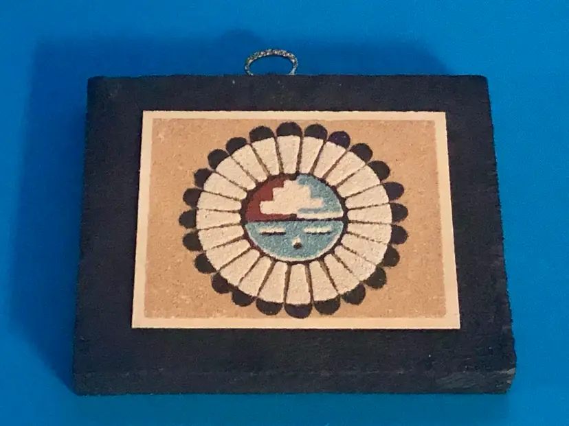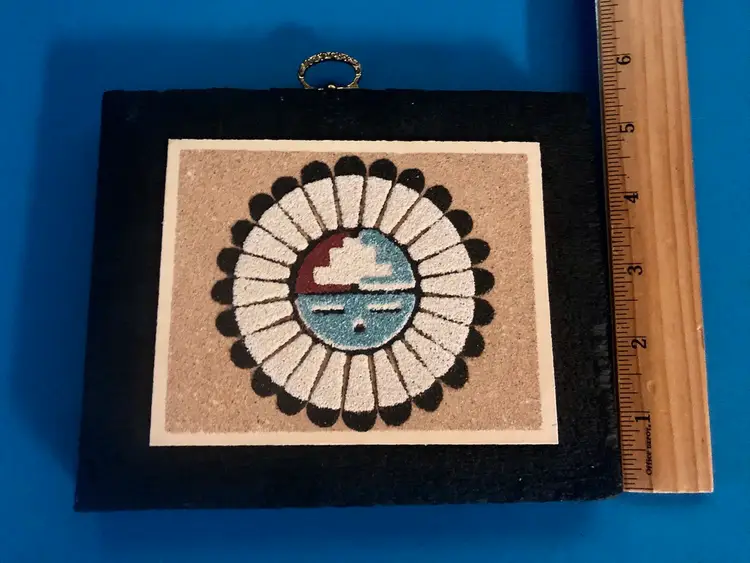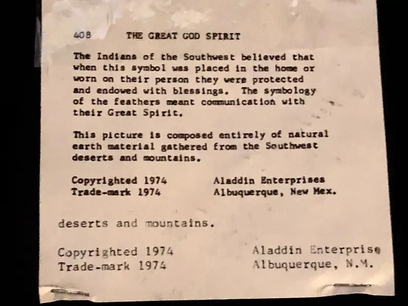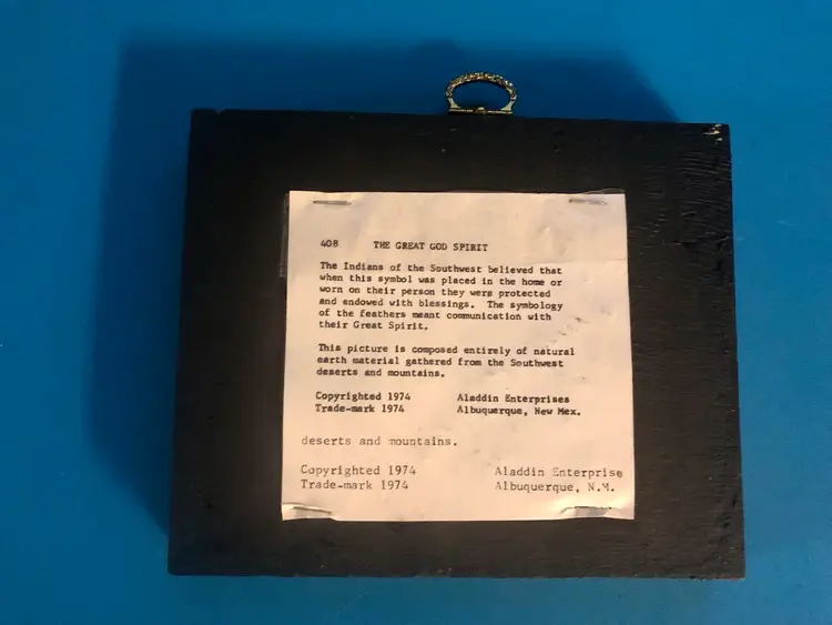 Here we have a Vintage Southwest Native American SAND ART Plaque of The Great God Spirit. This plaque has a typewritten description on the back telling the history and making of the item and dates it to 1974 by Aladdin Enterprises, Albuquerque, New Mex.