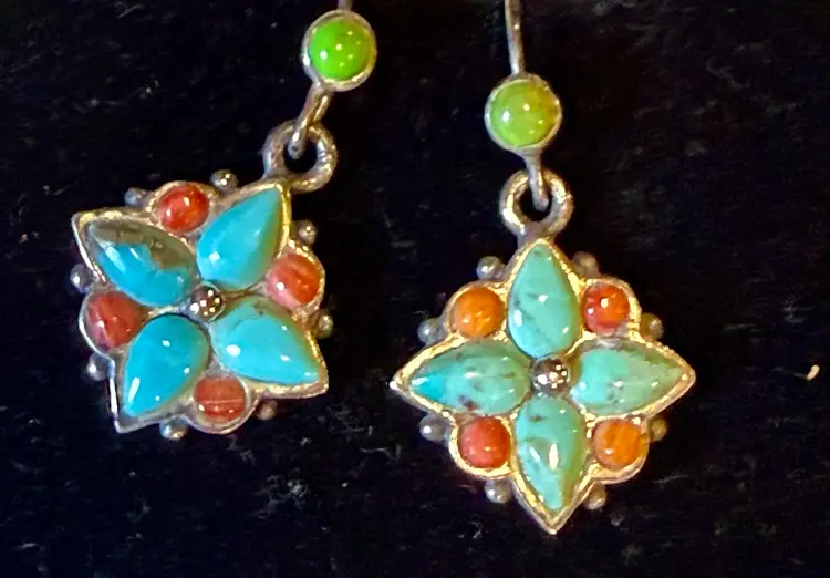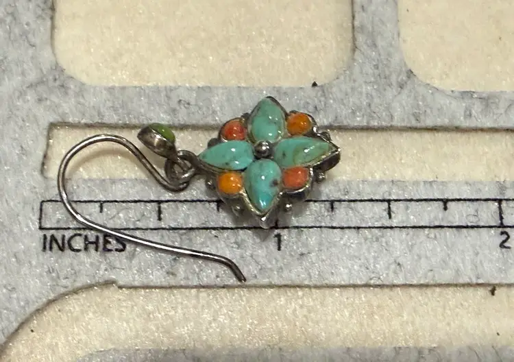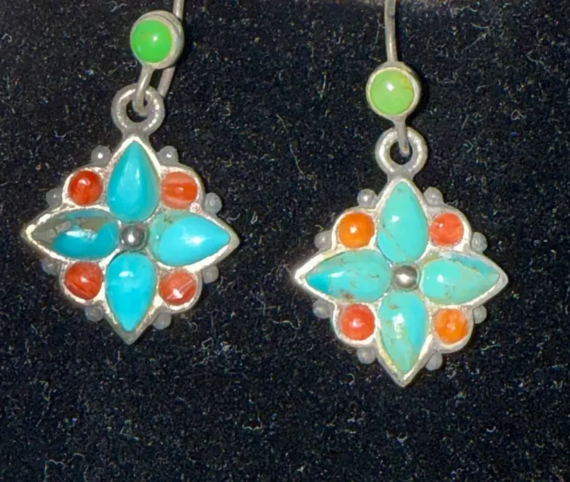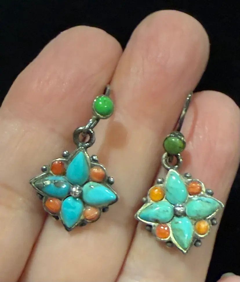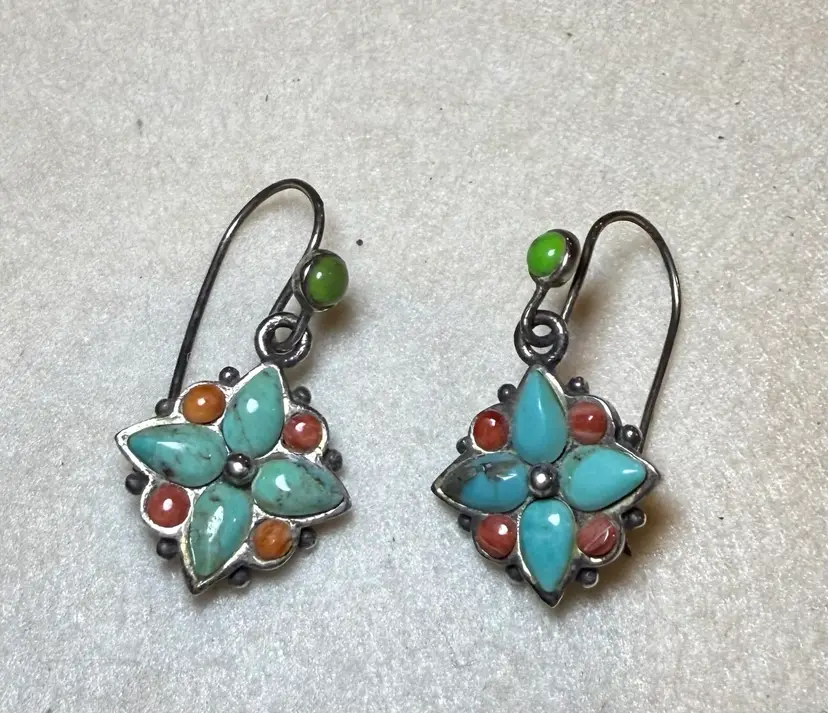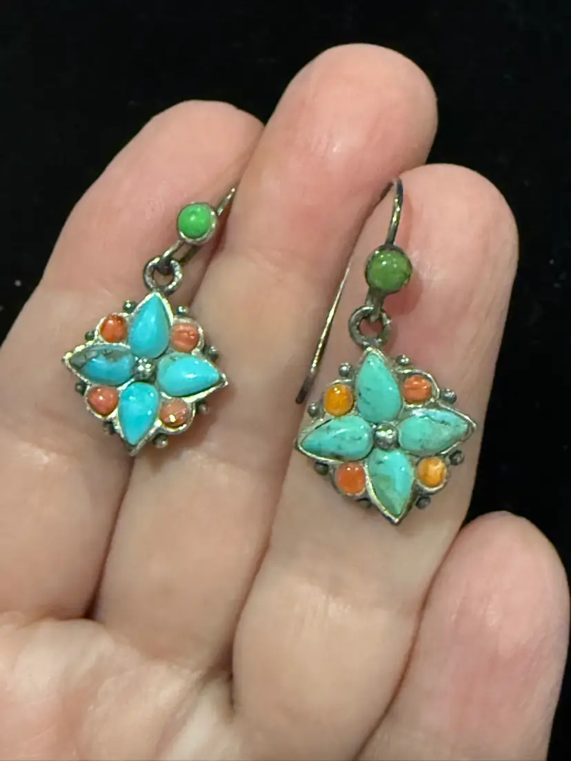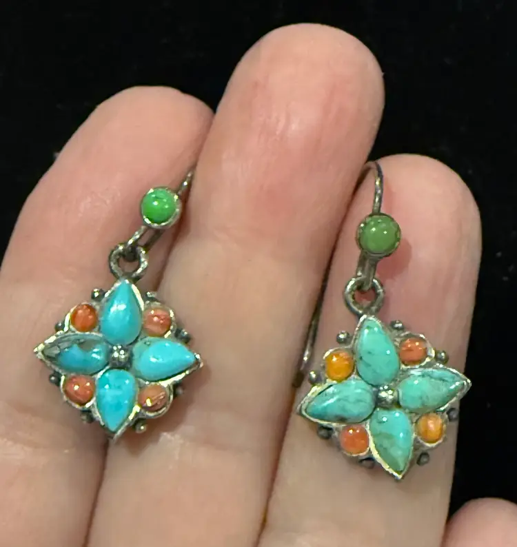 These vintage Southwest sterling silver turquoise and coral dangle earrings feature a Southwestern design, with a vibrant turquoise and orange color scheme. The earrings are signed, showcasing the craftsmanship of the piece. Made from sterling silver and turquoise with a secondary stone of coral, these earrings are a unique and stylish addition to any jewelry collection. The dangle/drop style adds movement and interest to the earrings, making them a standout accessory for any outfit.