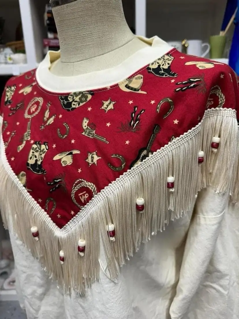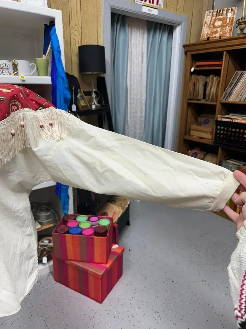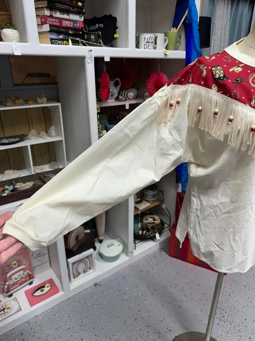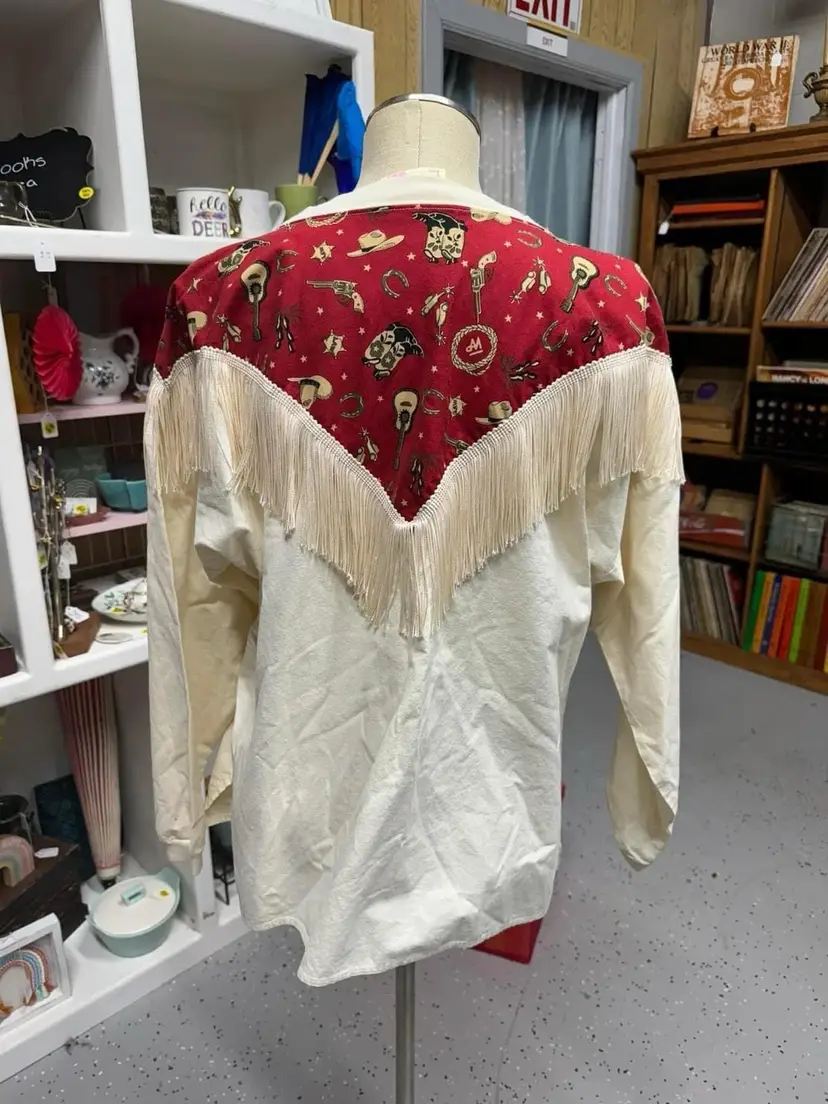 Cream shirt accented with cute retro western print , lined with beaded fringe