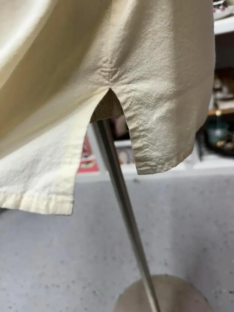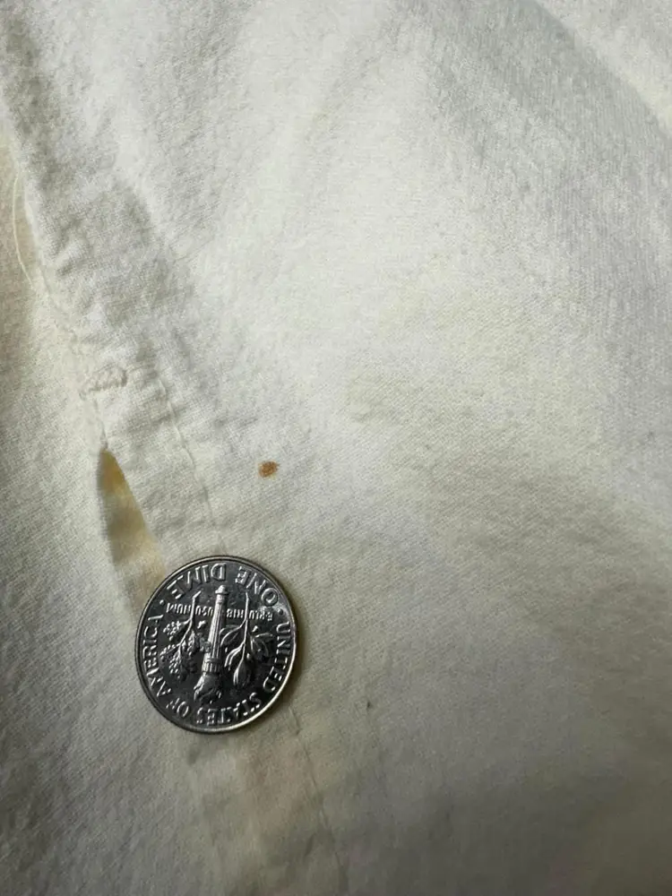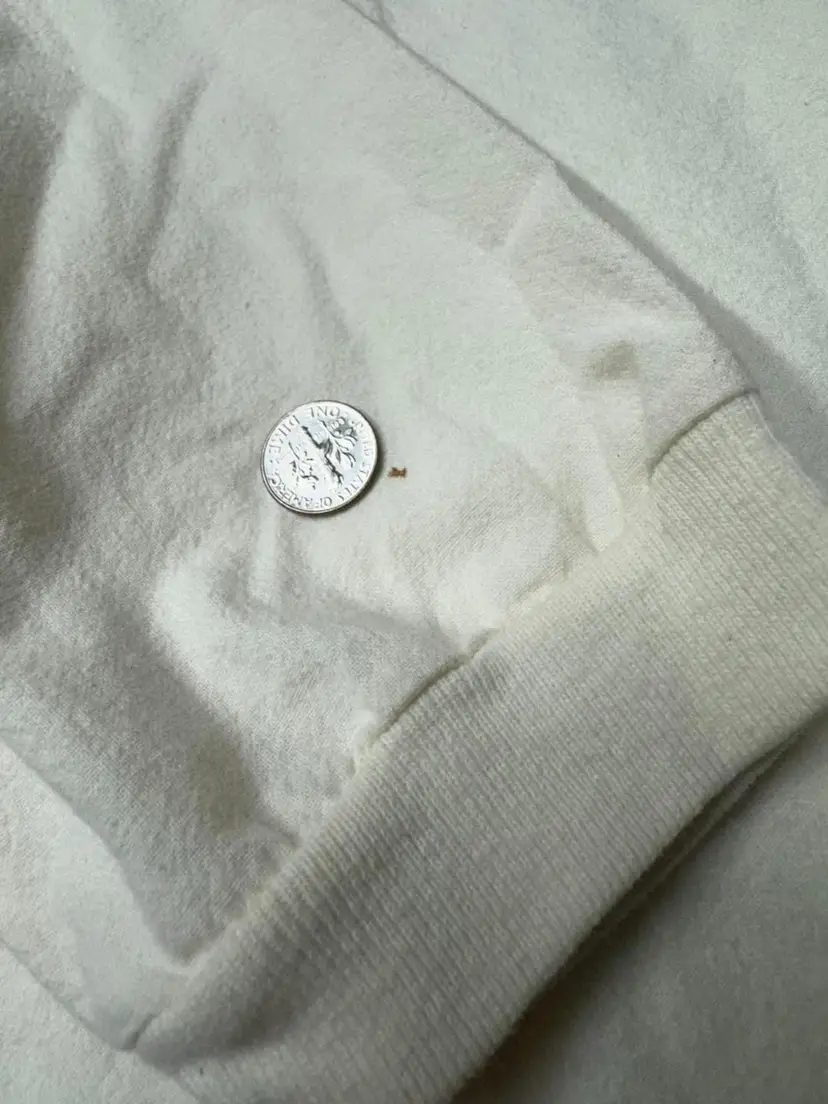 Located on left sleeve near cuff, left back side 3” from hem, and one very faded on center right back . Photos provided with dime for size reference