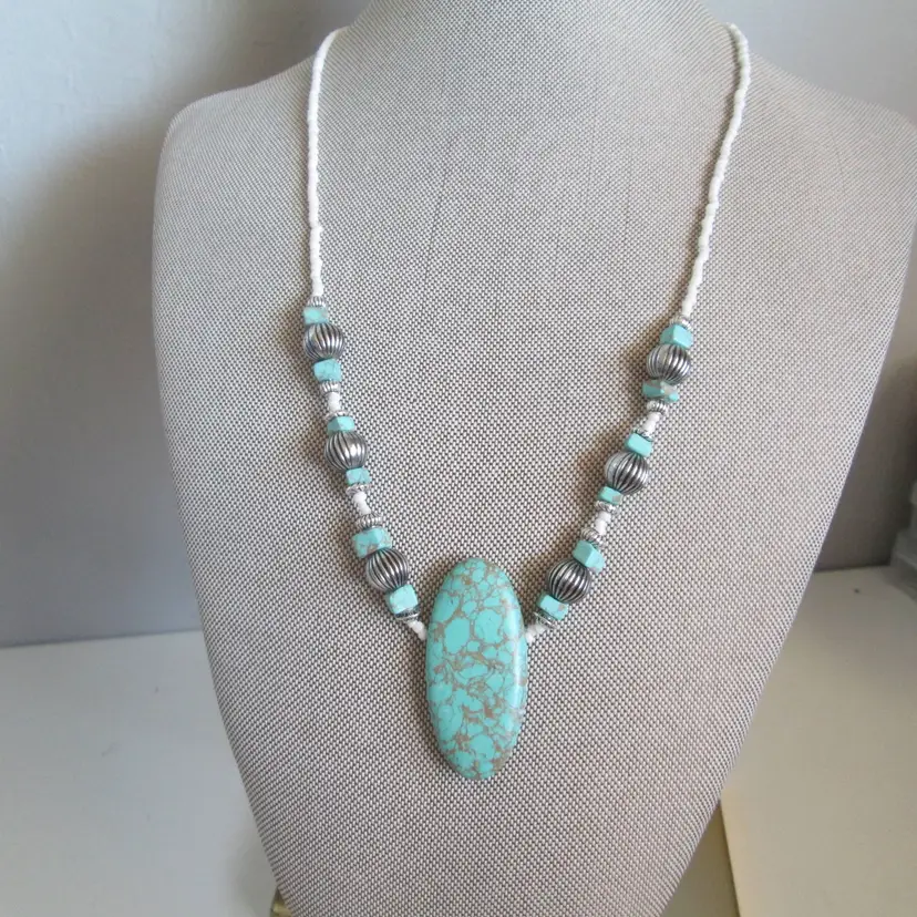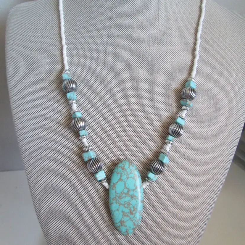 Southwestern genuine Turquoise, blue Howlite, silver tone metal and glass beaded necklace. This is an upcycled design using vintage beads and findings. The necklace measures 20" to 22" with adjustment.