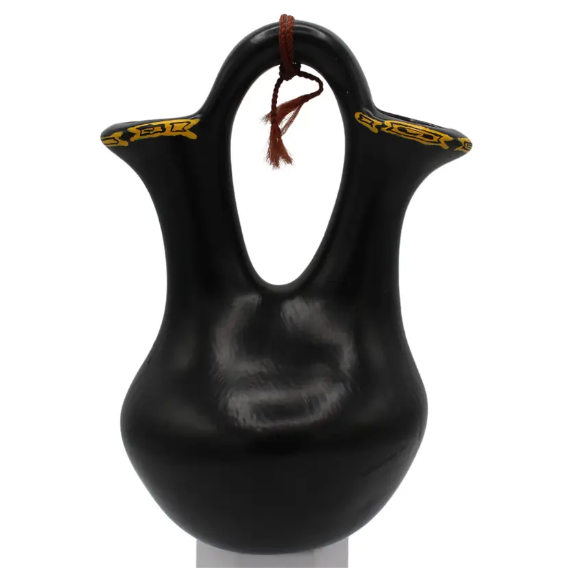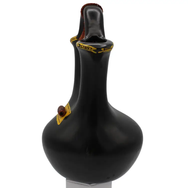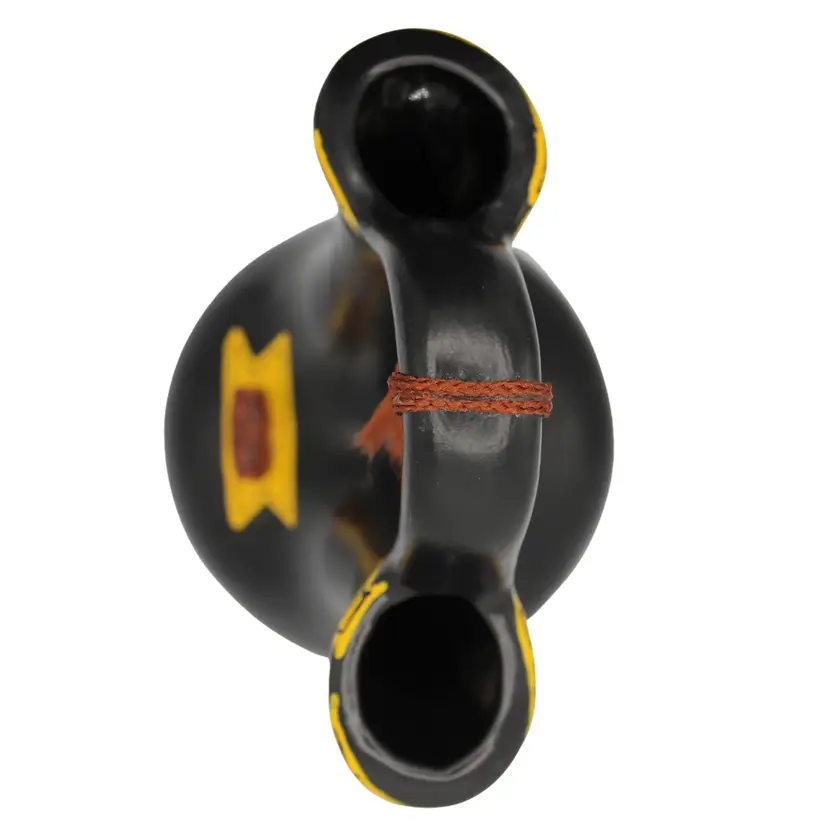 Hand-painted black ceramic with yellow symbolic details Decorative raised button accent Dual spouts with braided cord accent Perfect for Southwestern, rustic, or boho décor Collectible pottery piece, ideal for display