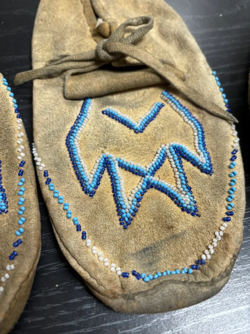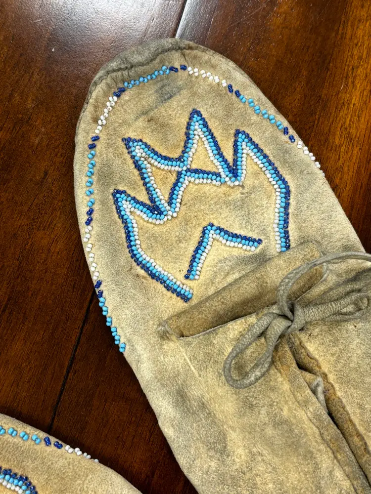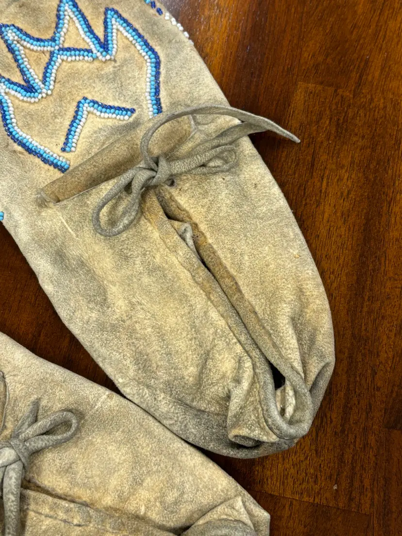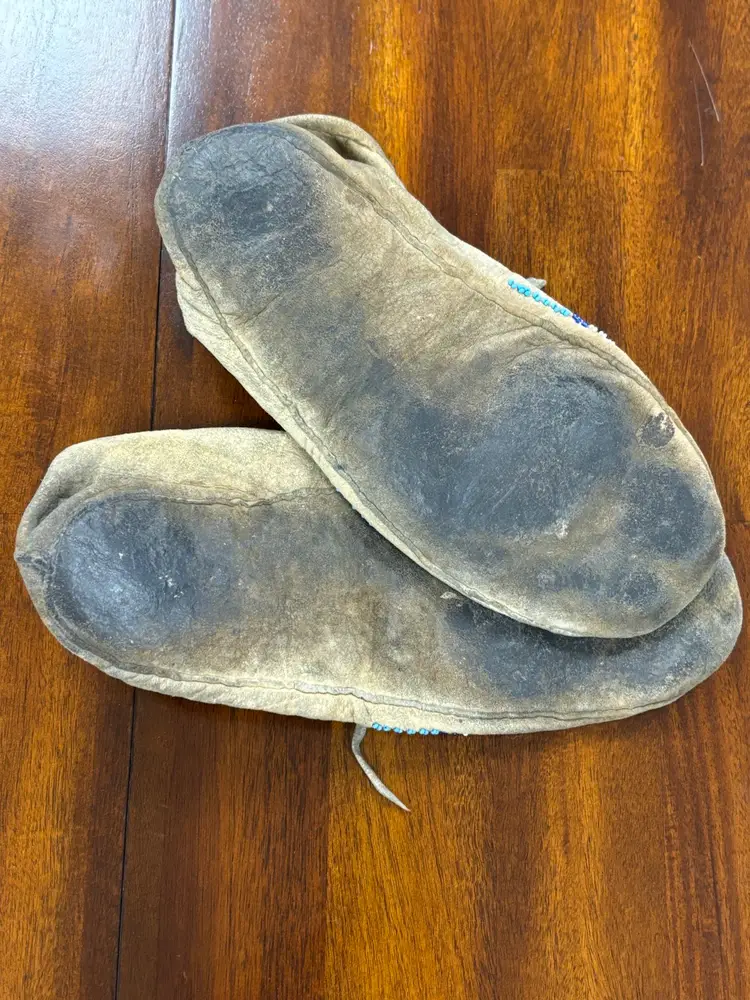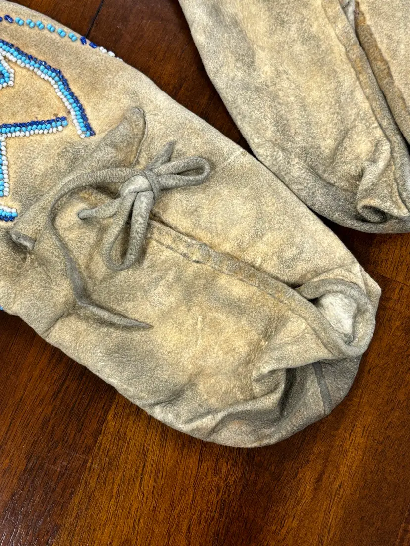 Very Well Loved Beaded Moccasins Genuine and Beautiful Souvenir made in Montana many moons ago Condition best described by photos, no rips or tears.
