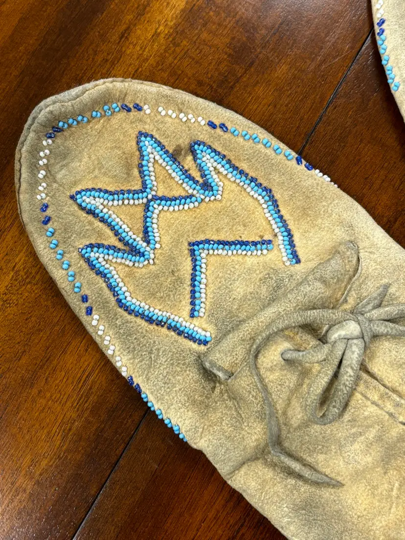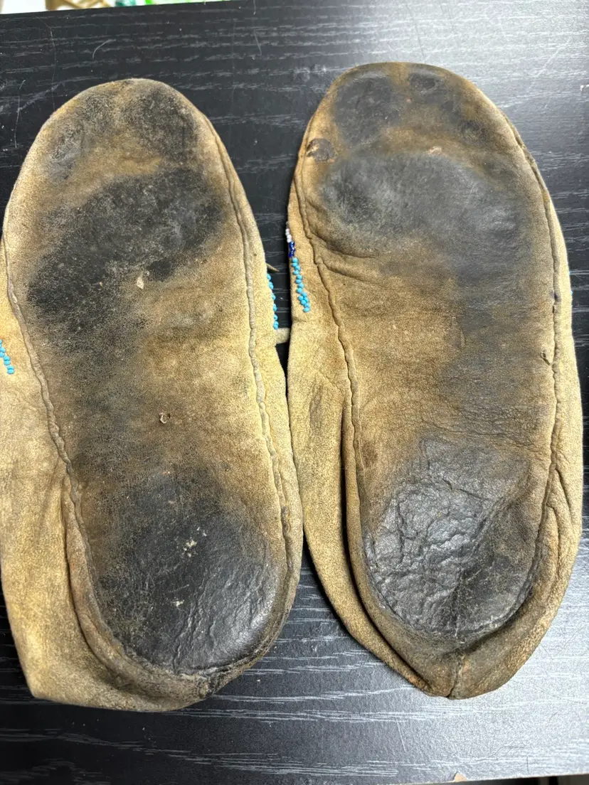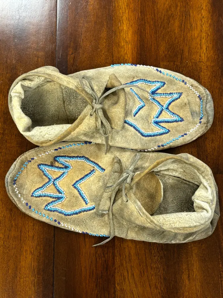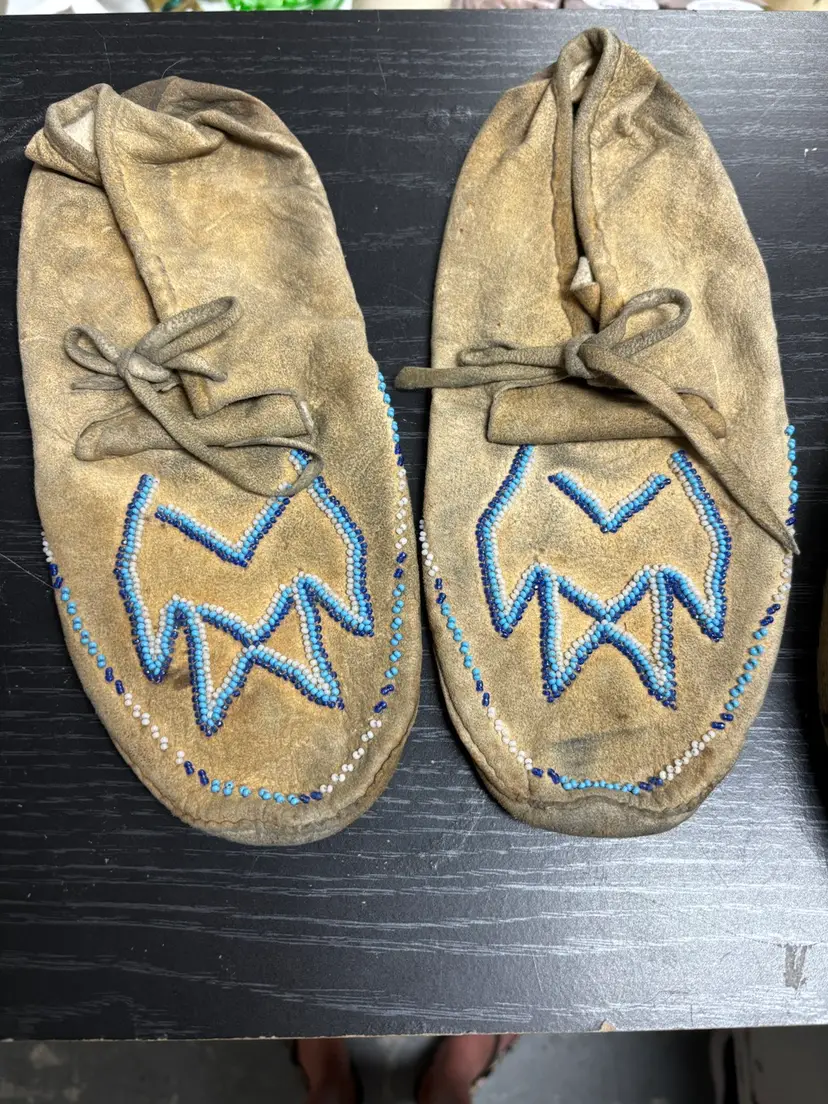 Very Well Loved Beaded Moccasins Genuine and Beautiful Souvenir made in Montana many moons ago Condition best described by photos, no rips or tears.