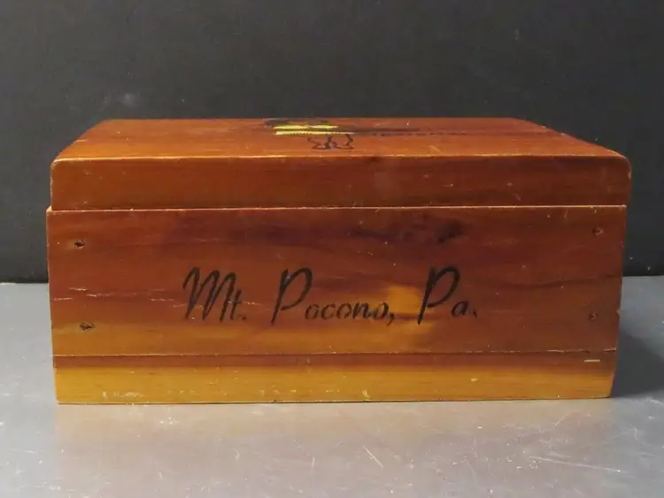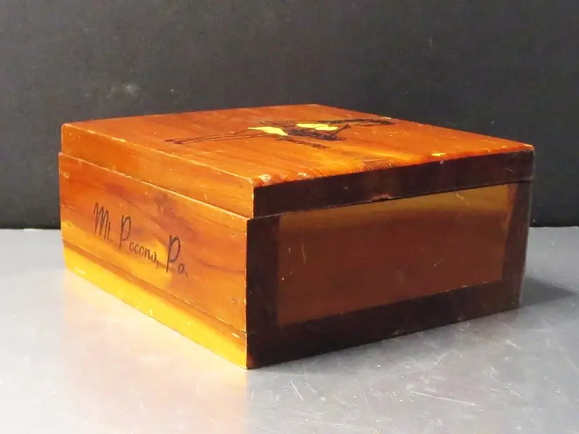 Most likely 1940s to 1960s, hand painted wooden cigarette souvenir box from the Poco Mtns of Pa.