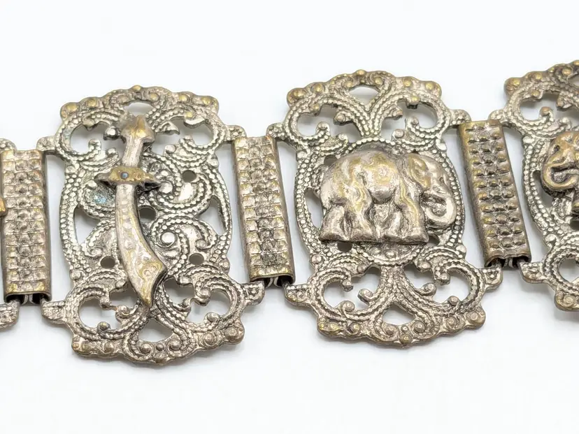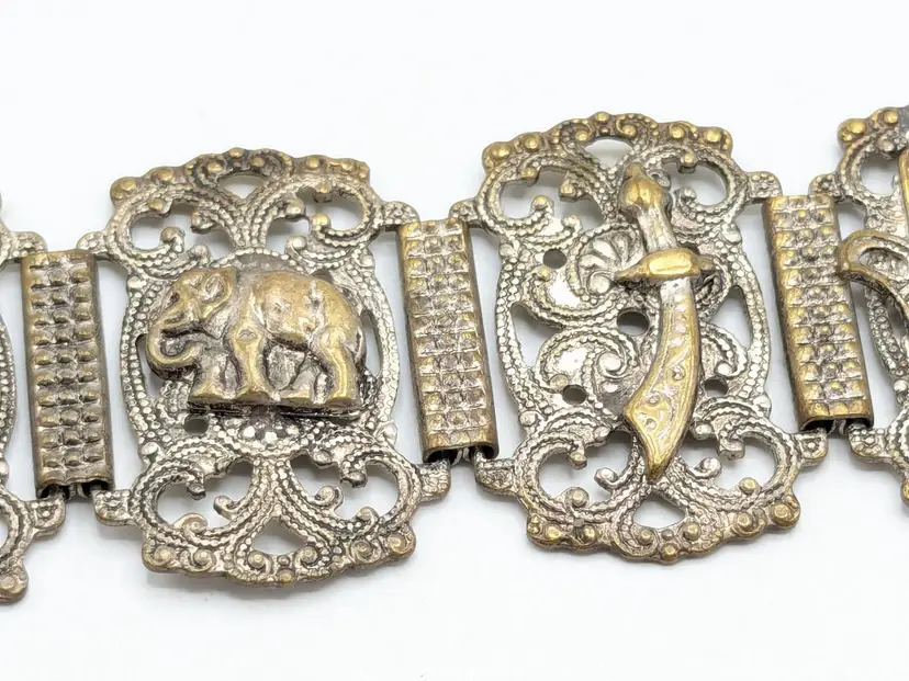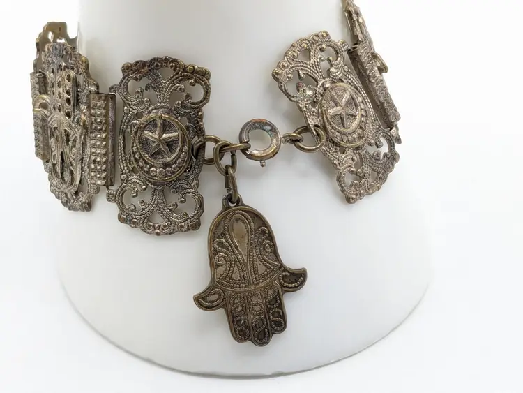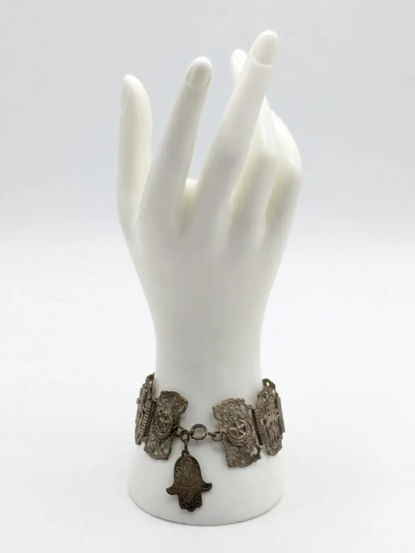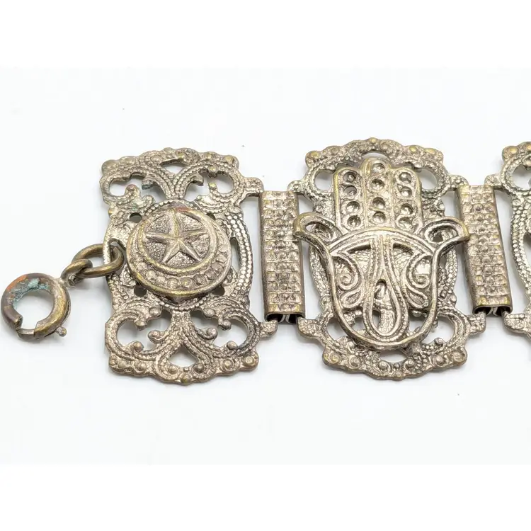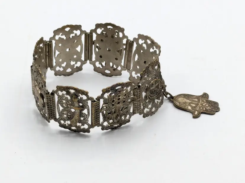 Good condition. Beautiful vintage bracelet featuring eight intricate filigree panels with elephant motifs, scimitars, crescent moon with star and Hamsa hand. Perfect for adding a touch of exotic charm to your jewelry collection. Morrocco souvenir. Size 7 1/4". (EN2)