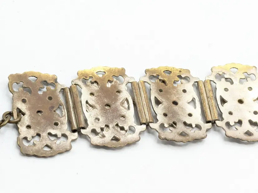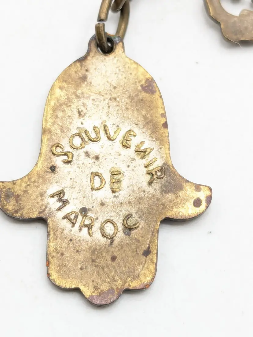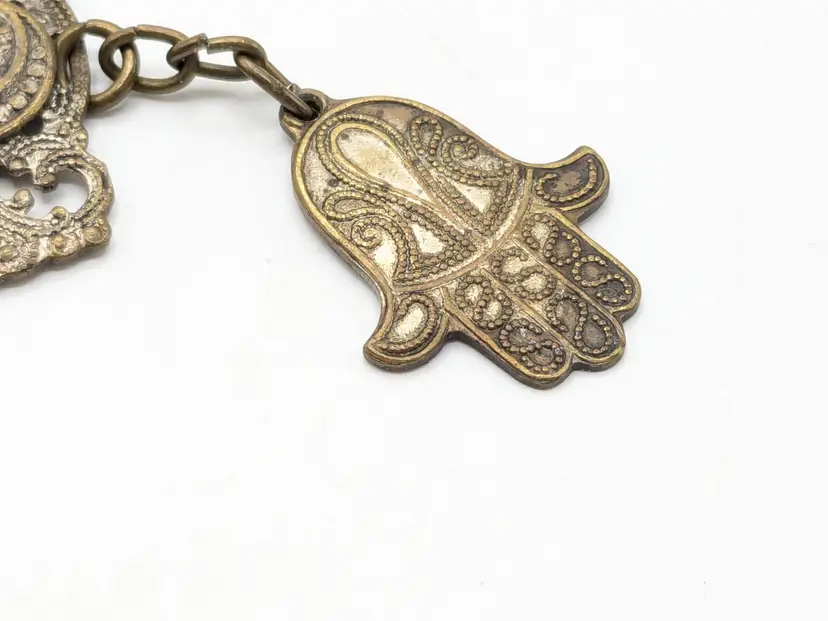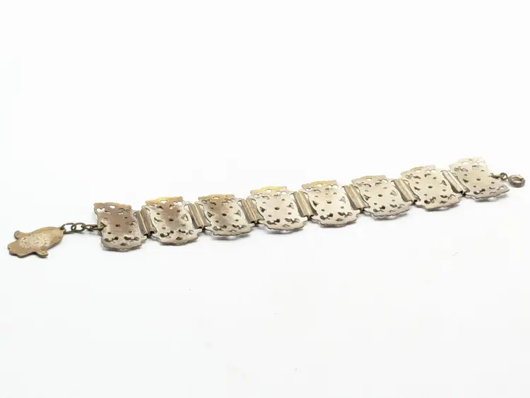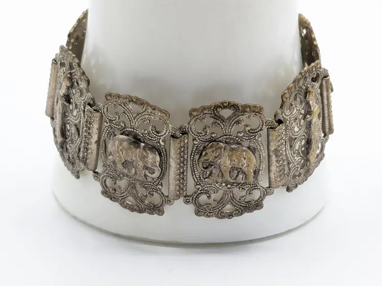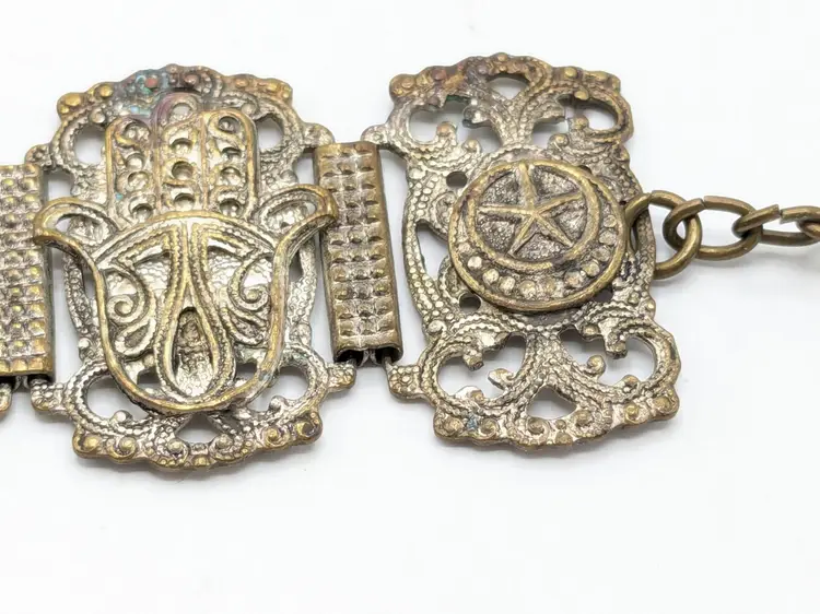 Good condition. Beautiful vintage bracelet featuring eight intricate filigree panels with elephant motifs, scimitars, crescent moon with star and Hamsa hand. Perfect for adding a touch of exotic charm to your jewelry collection. Morrocco souvenir. Size 7 1/4". (EN2)