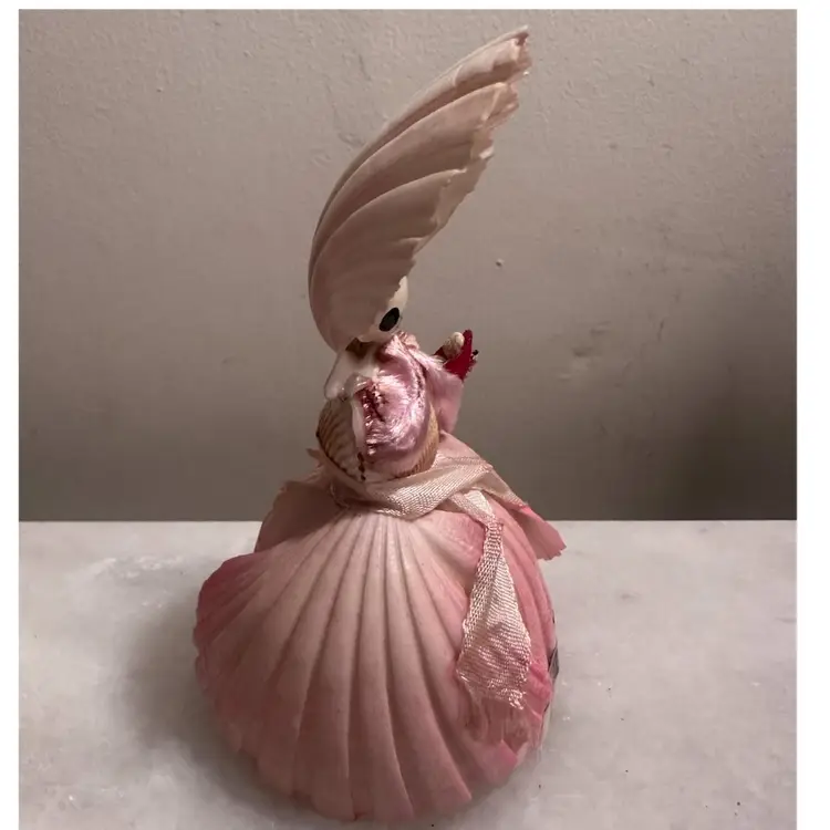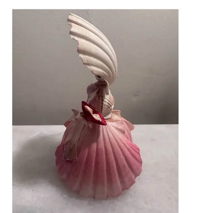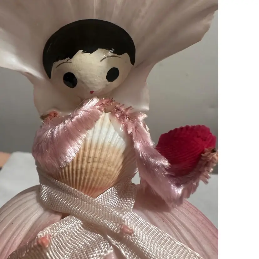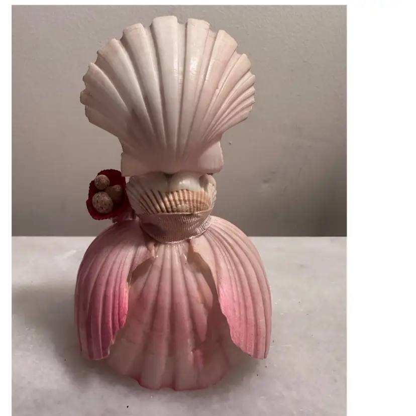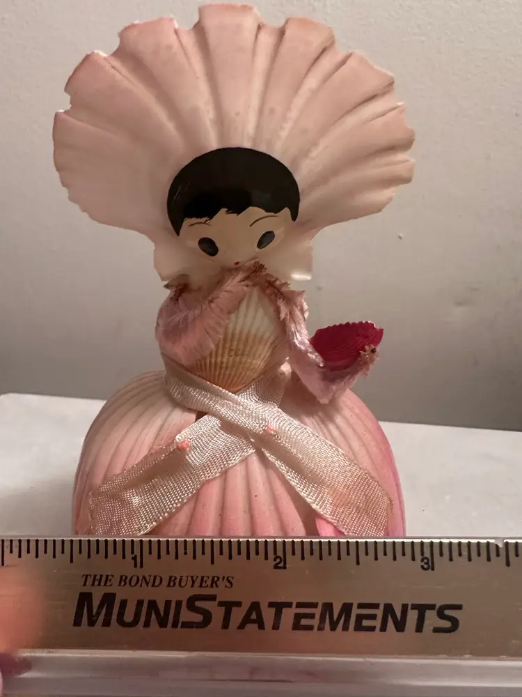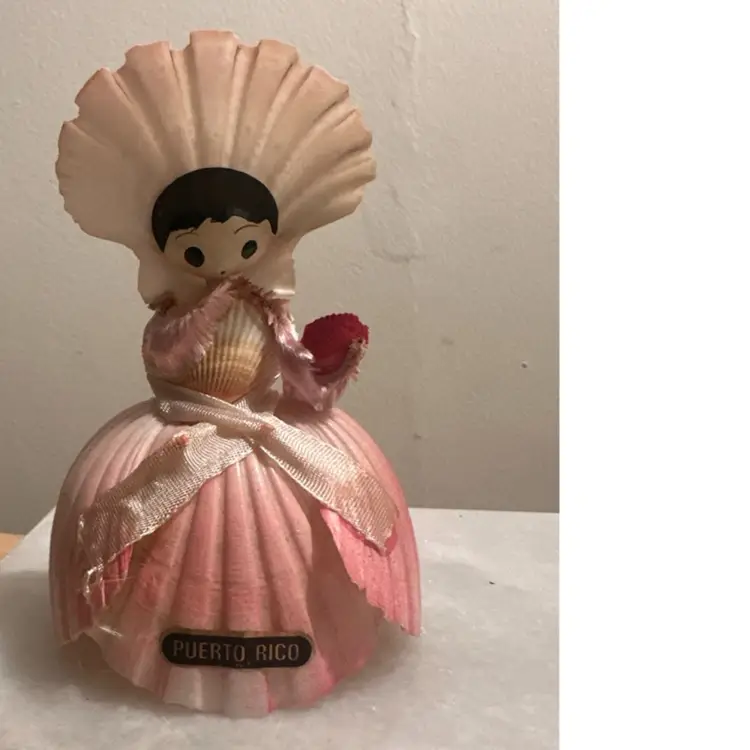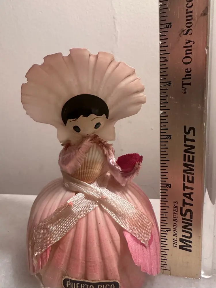 This adorable little vintage doll made out of seashells with a souvenir from Puerto Rico. Puerto Rico is a sticker if you’d like to remove it she measures just under 5 inches high and about 3 inches wide.