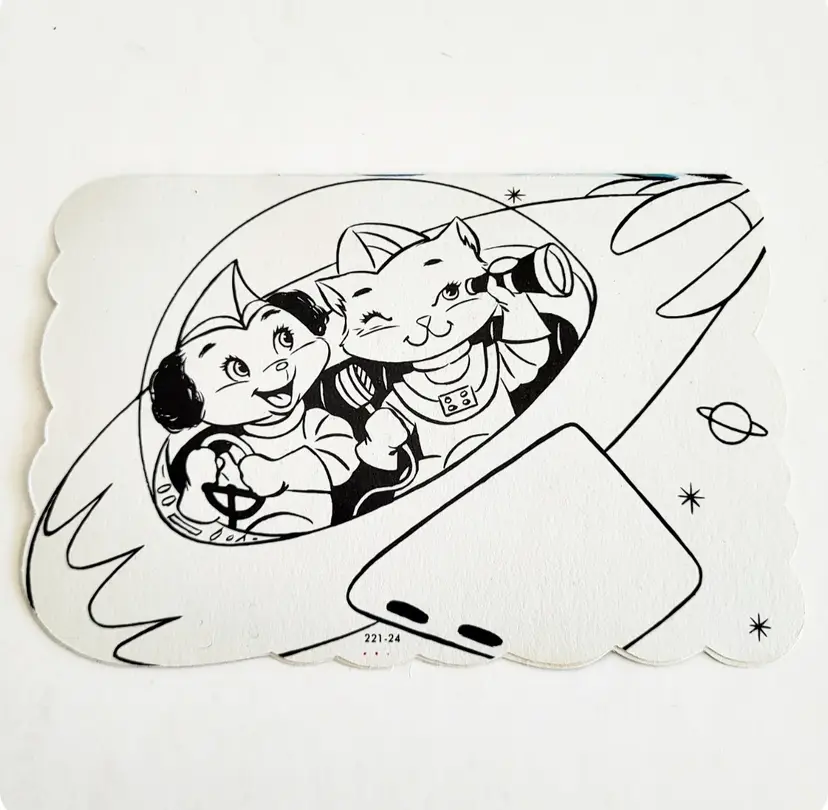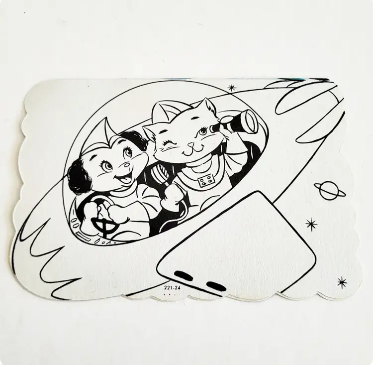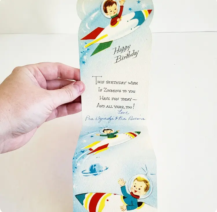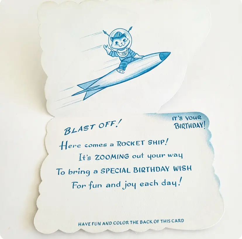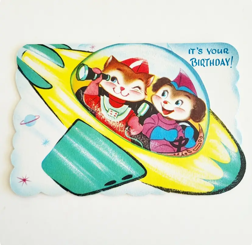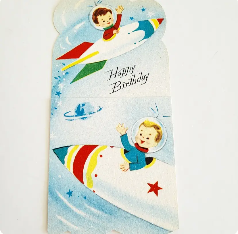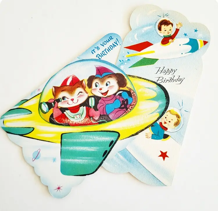 Pair of vintage space theme birthday greeting cards. Scroll for details Dog and cat in space ship card has not been used- opens up for greeting, coloring page on back of card. Measures 6 in x 4 in. Boys in space ship card has been used/signed. Pulls open to reveal greeting and another image. Plain on reverse. Measures 7in x 3.5 in flat.