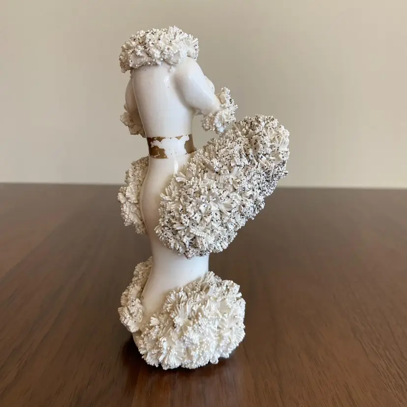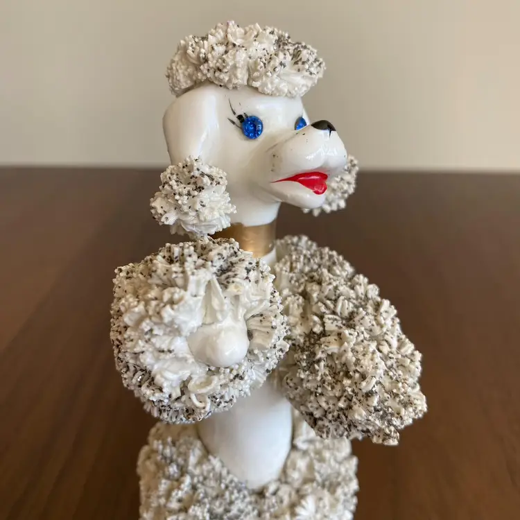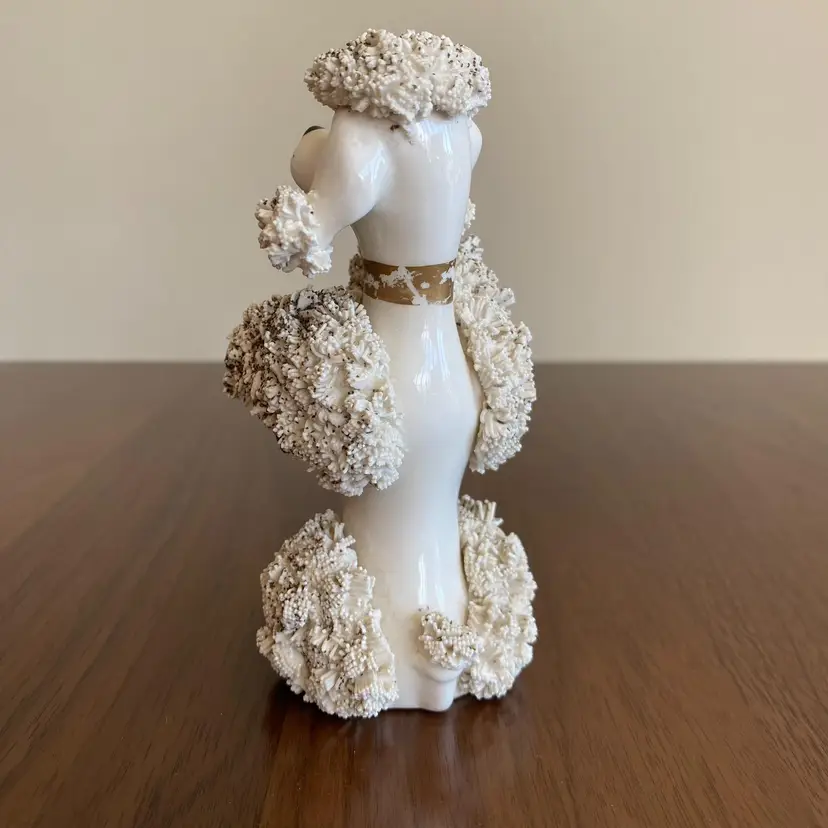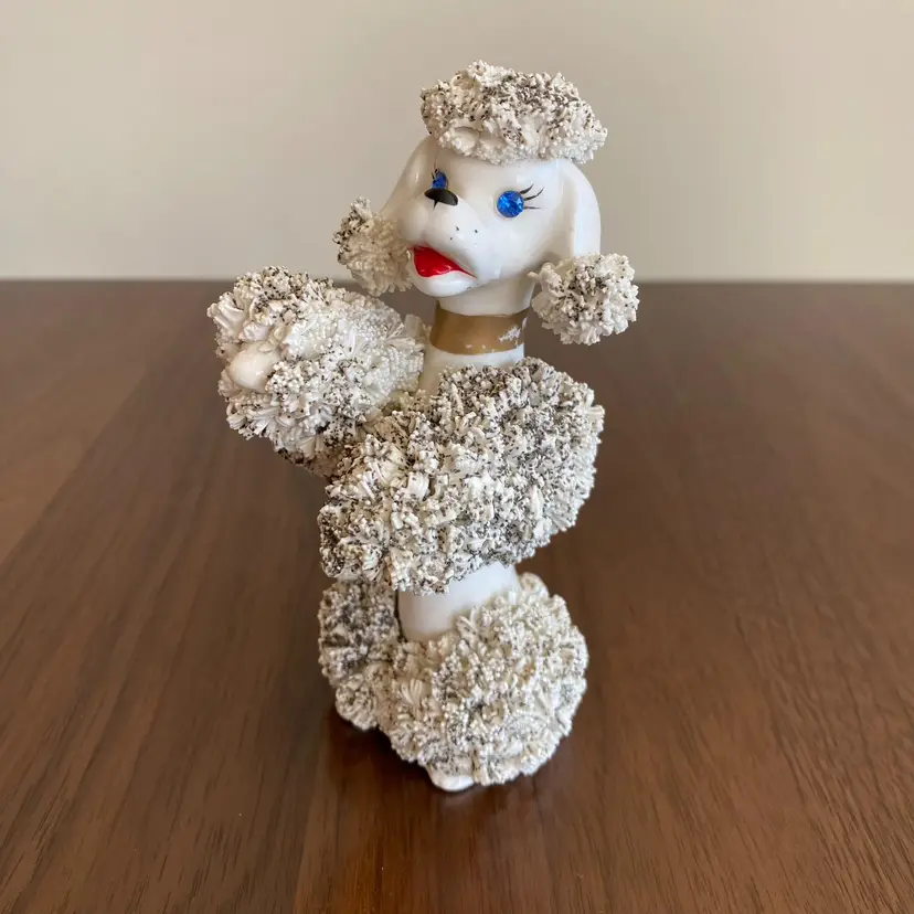 Vintage spaghetti French Poodle figurine. Was marked on bottom, but no longer legible. I expect it was from Japan. Stands about 5.25 inches tall. Base is 2.75 by 2.5 inches wide. In very good vintage condition. No chips or cracks from what I can see, thought there is some paint missing from collar and whiskers/eyelashes.
