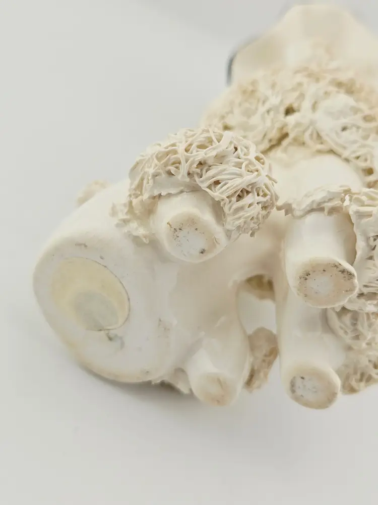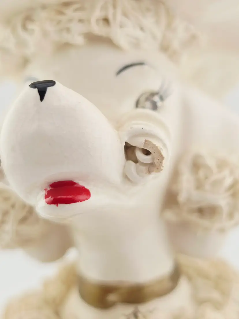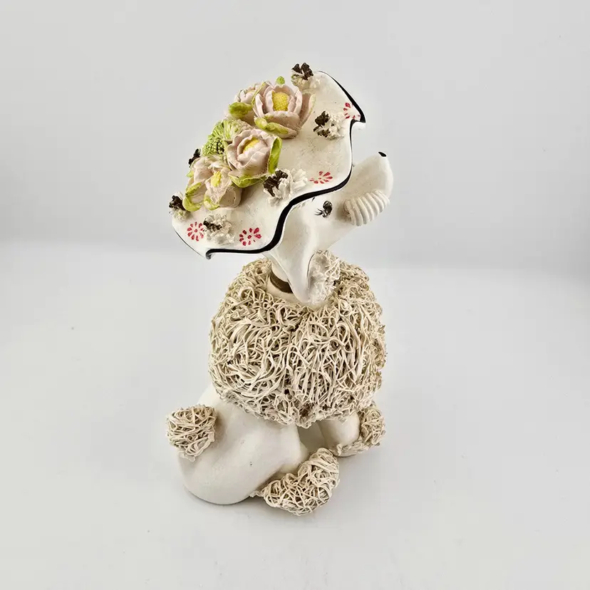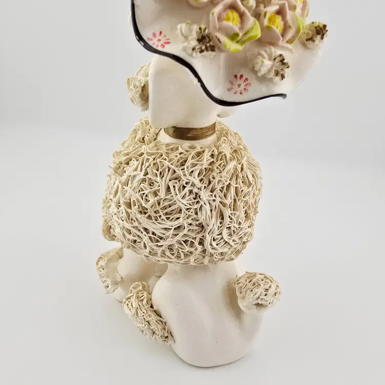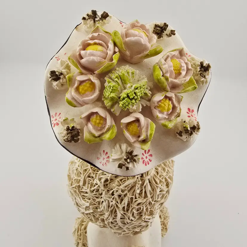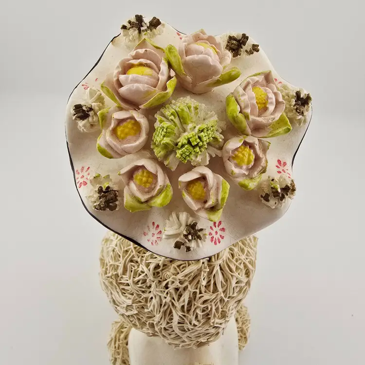Has some wear and small areas of chipping as seen. Florals on hat are all in good condtion! 6 inches tall.