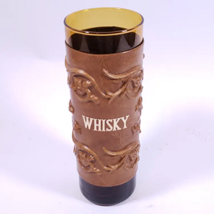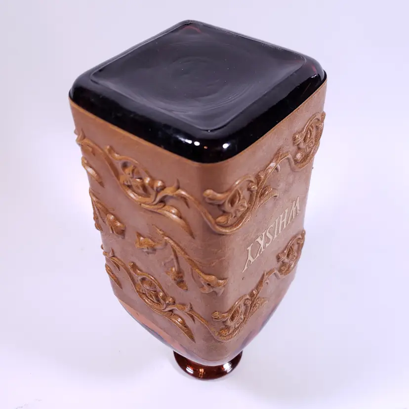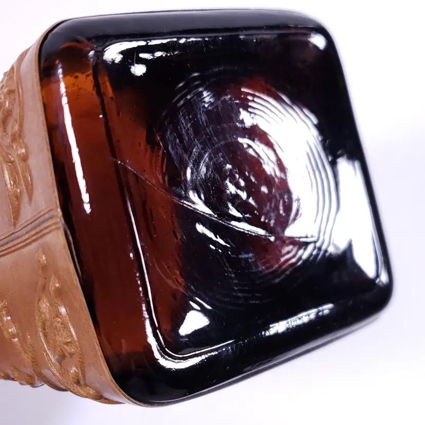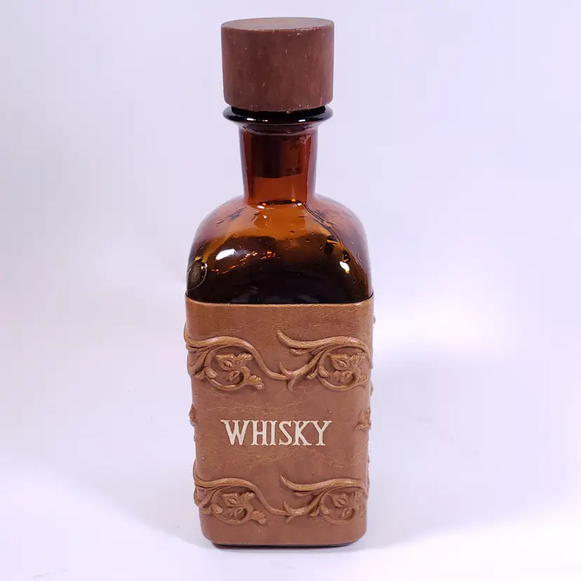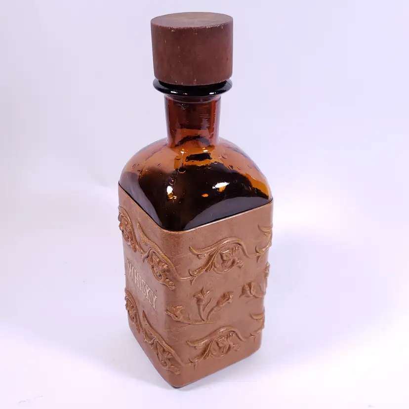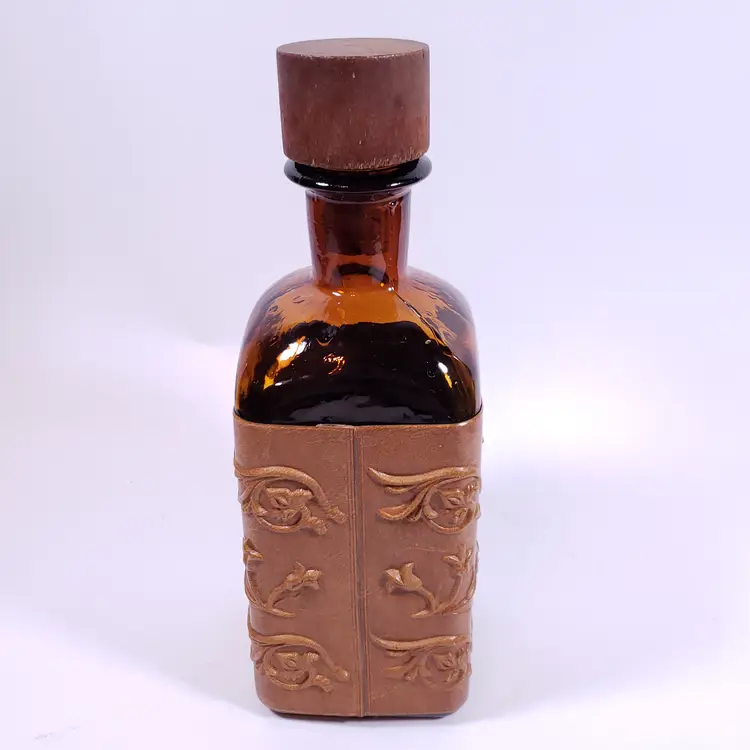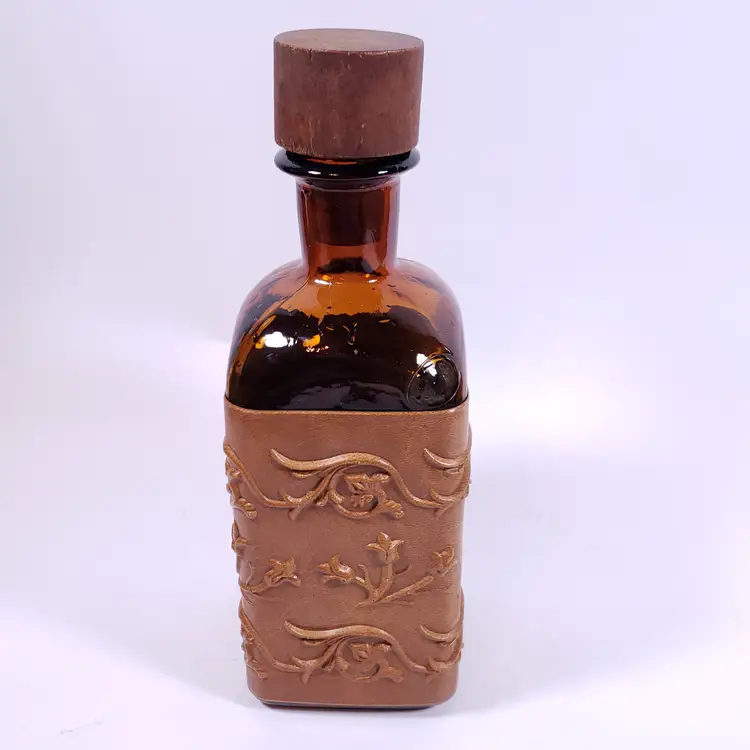 Vintage Spanish Floral Leather Sleeve Amber Gold Bar WHISKY DECANTER GLASS SET