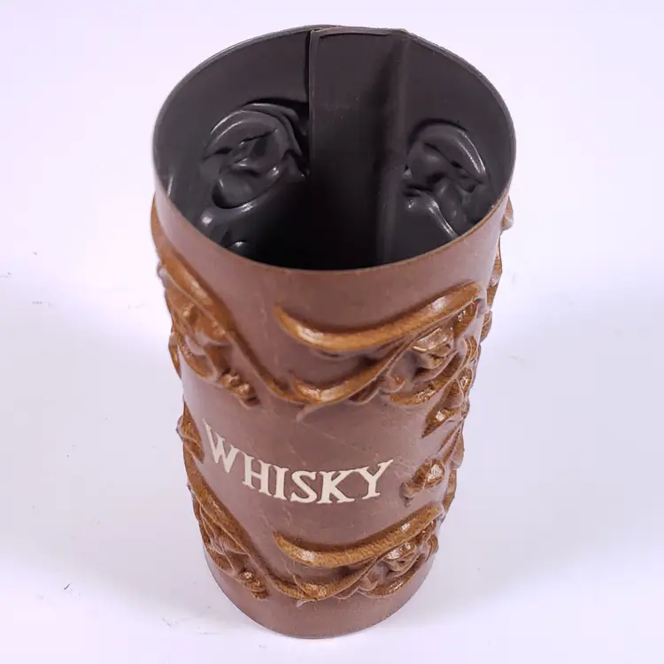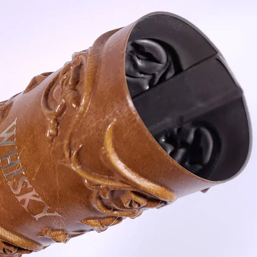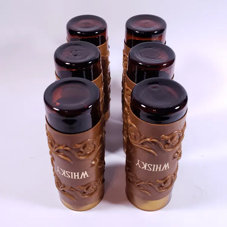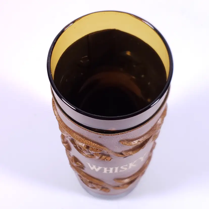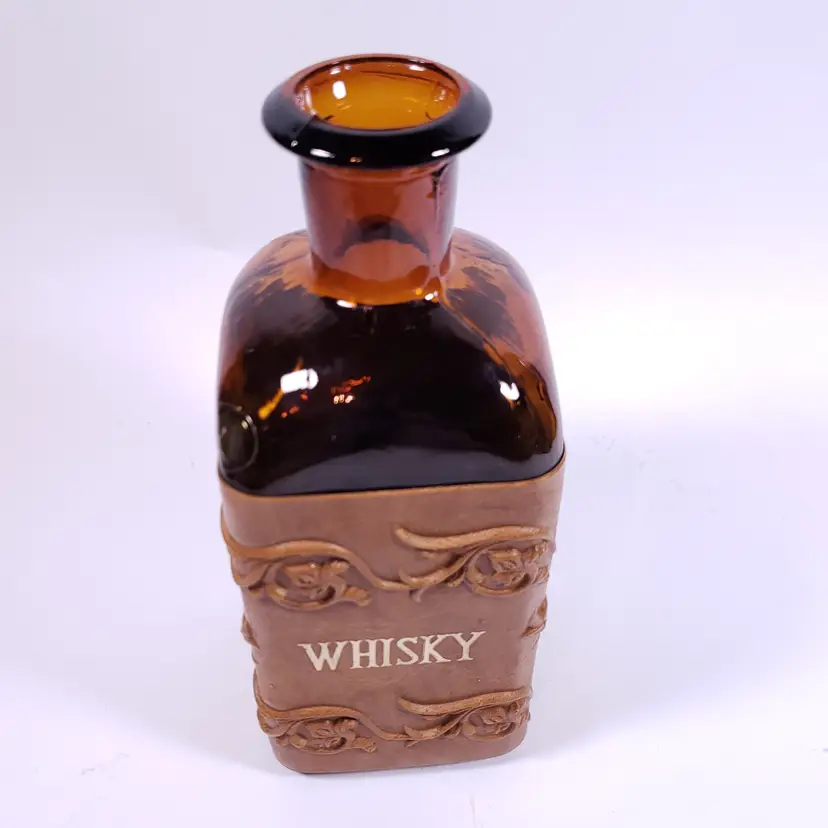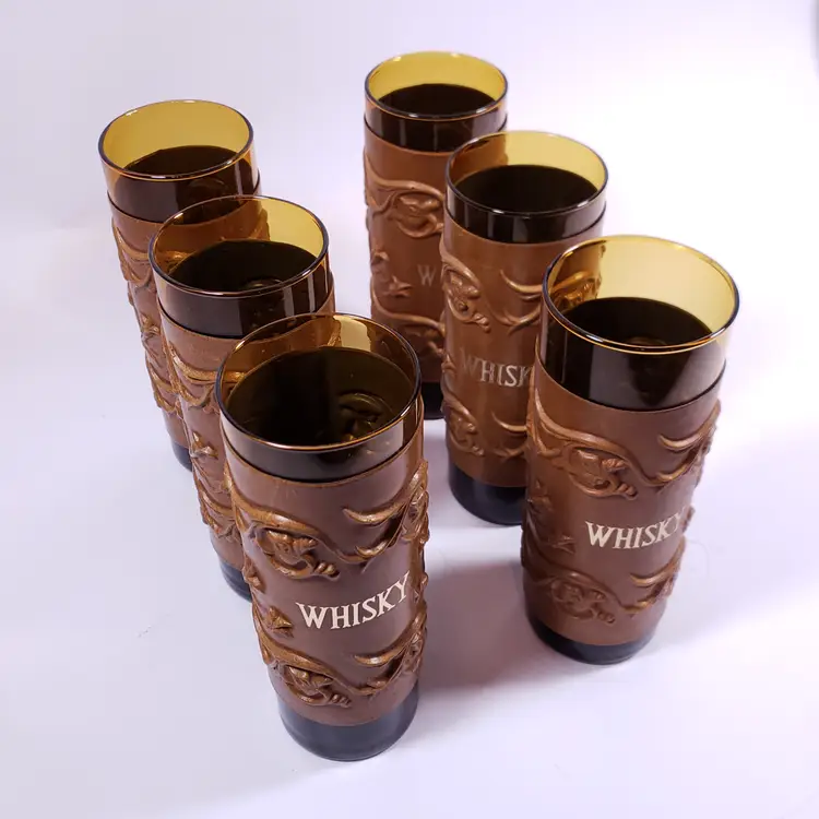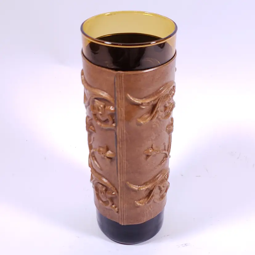 Vintage Spanish Floral Leather Sleeve Amber Gold Bar WHISKY DECANTER GLASS SET