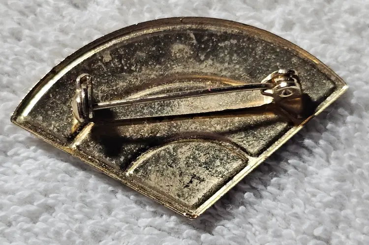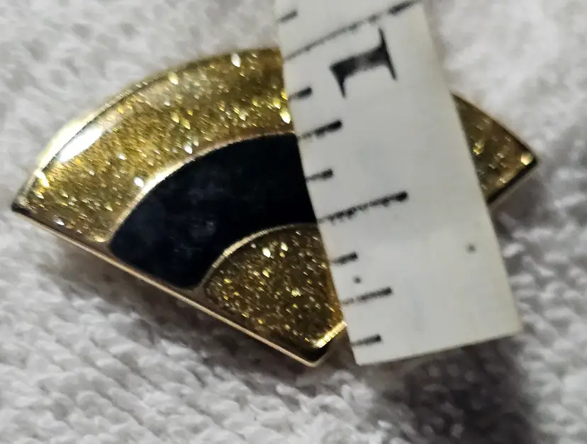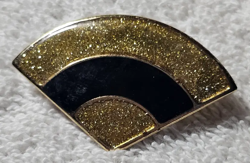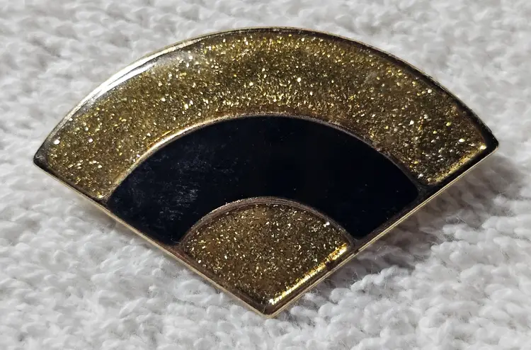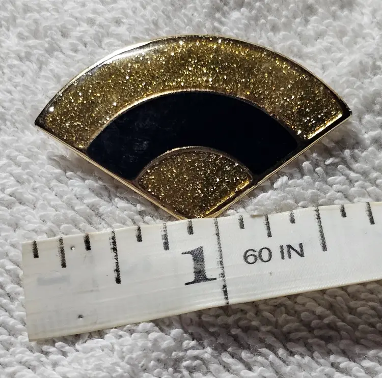 This Vintage Sparkle Enamel Art Deco Fan Brooch Pin in Gold Tone with Black enamel is a stunning piece of vintage jewelry perfect for women who appreciate unique and classic style. The black enamel and gold tone metal create a striking contrast, while the Art Deco theme adds a touch of elegance. This brooch is a statement piece that can be worn on a lapel, collar, or even as a scarf pin, adding a touch of vintage flair to any outfit.