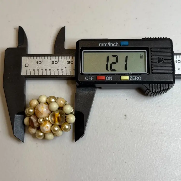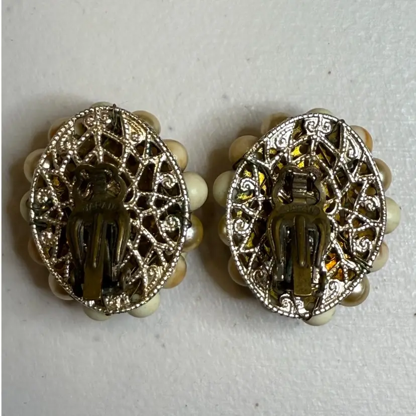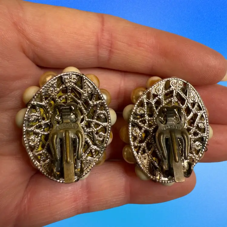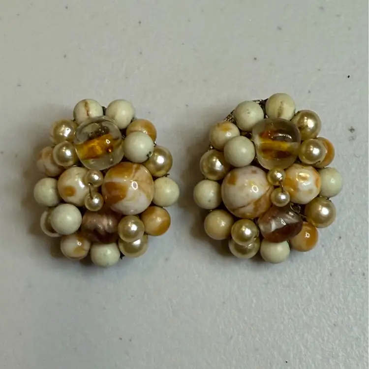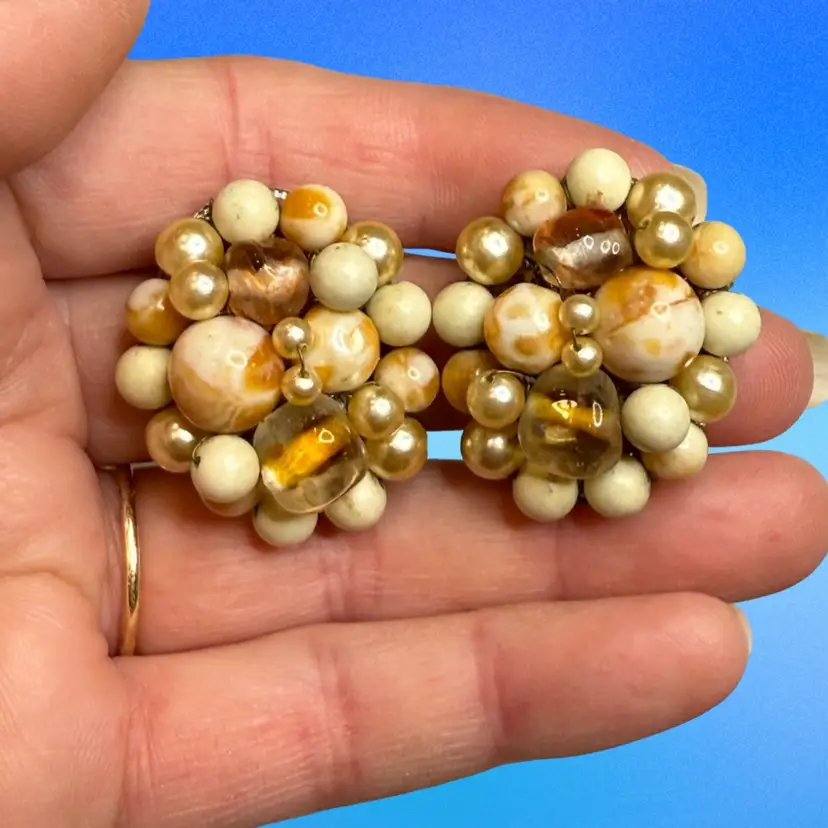 Pretty MCM speckled gold & amber faux pearl and glass bead earrings are elegant and pretty. They measure 1.21” in length and are a nice size. The warm honey and cream tones complement each other nicely and the brass filigree backs are lovely. Beads are individually wired to filigree backs and earrings are in great vintage condition. Clip backs open freely and lock securely in place. Stamped Japan on reverse side of clip back.