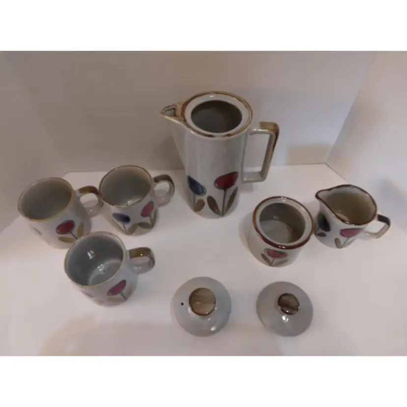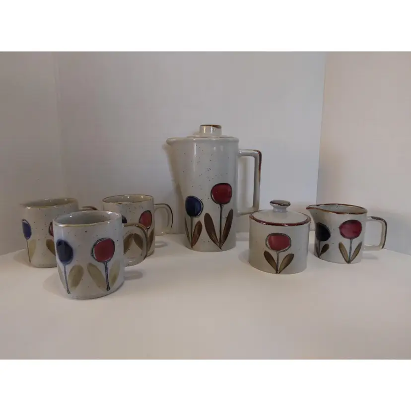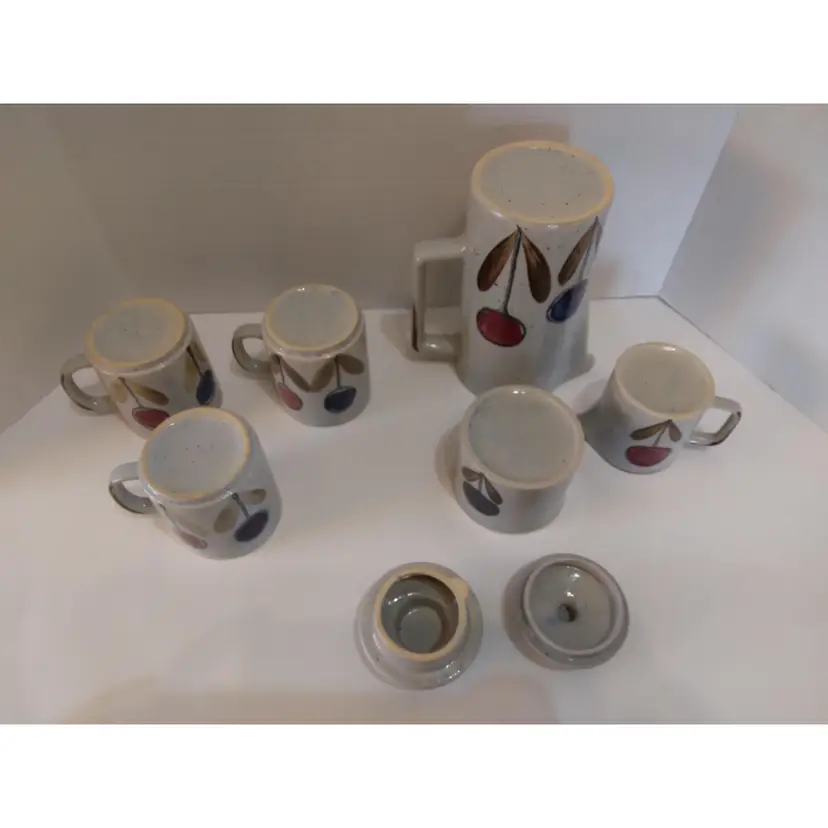 Vintage Speckled Stoneware Hand Painted Tea Pot Mugs Sugar Creamer Set Japan. This is a grand little set! The tea pot with lid is approx. 8 inches tall and 3.5 inches in diameter at the base. The 3 mugs are approx. 3.5 inches tall and 3 inches tall at the rim and they hold approx. 8 ounces. The sugar with lid is approx. 3 3/4 inches tall and 3 1/3 inches in diameter. The creamer is approx. 3 inches tall and 2 3/4 inches in diameter. No chips, cracks or crazing. Please see photos. I am a careful and experienced shipper.