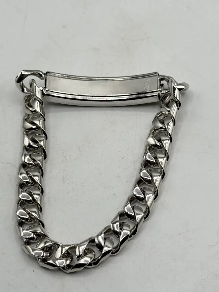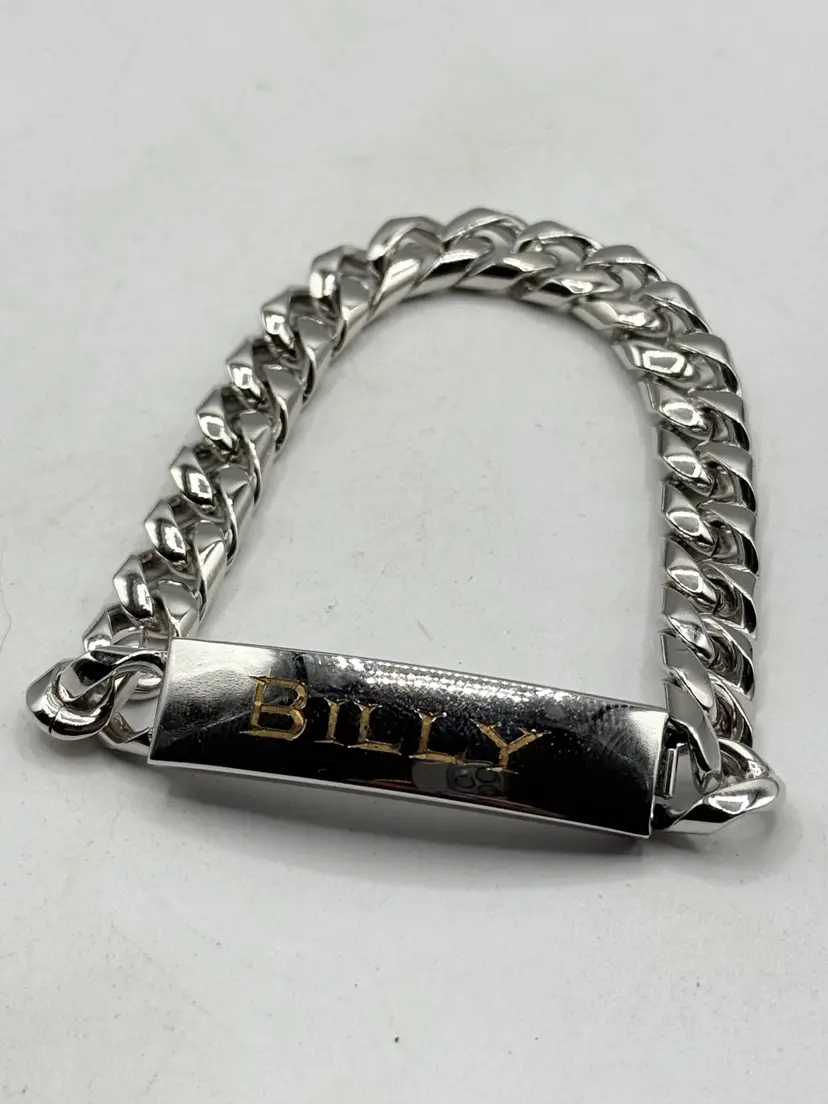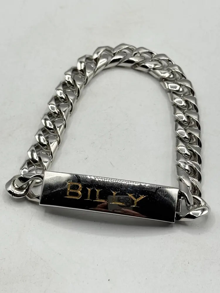 Vintage Speidel silver id name Billy bracelet. Vintage men's bracelet engraved Billy. Signed Speidel USA. Push in clasp. Silver tone chain. MN54FH.