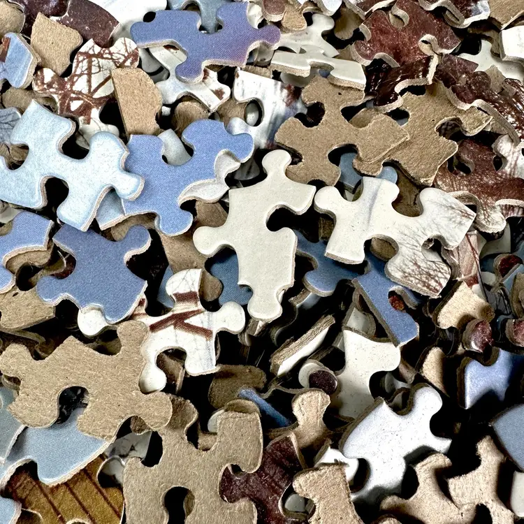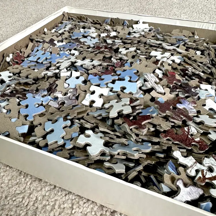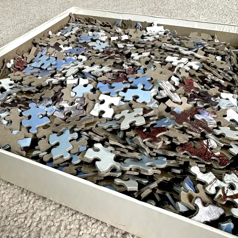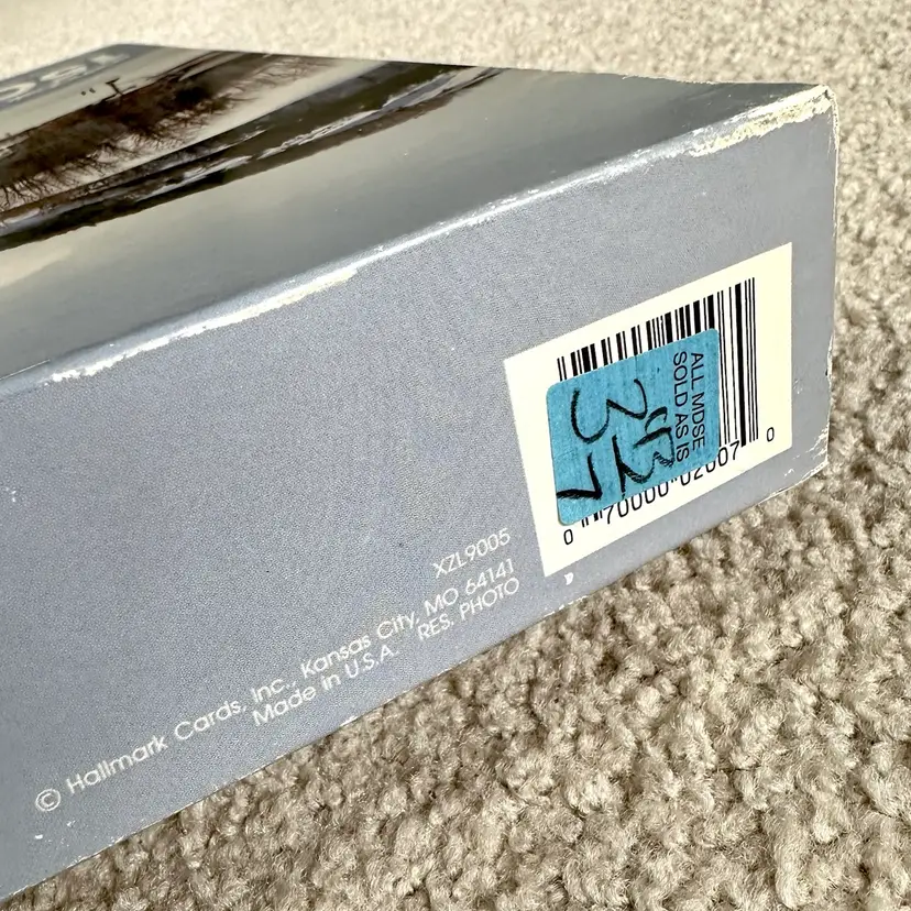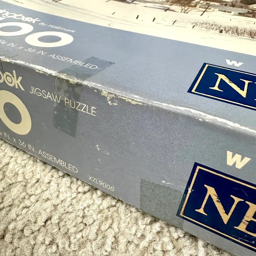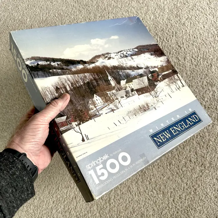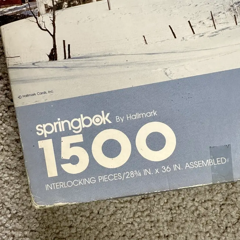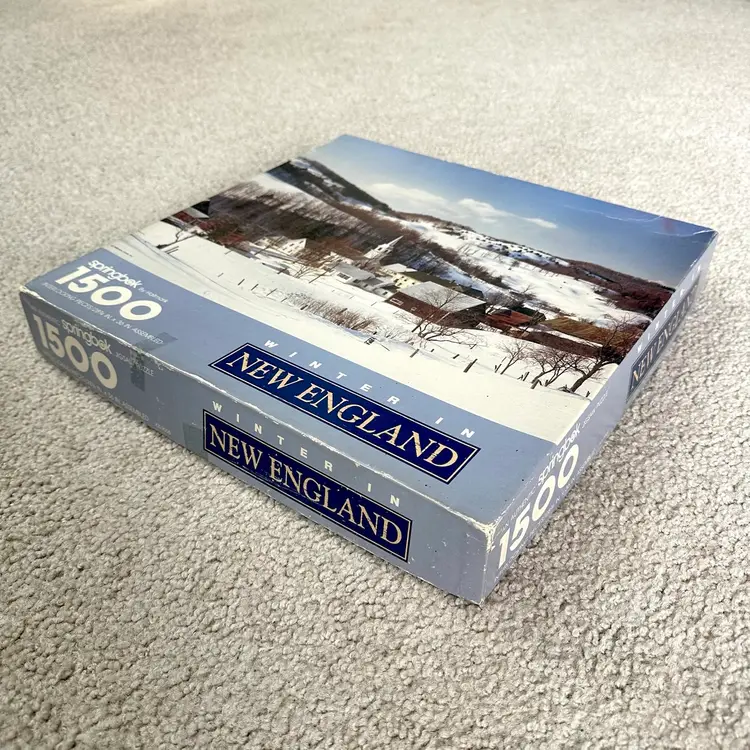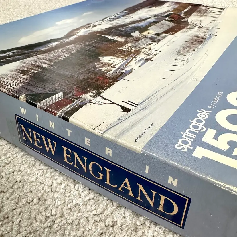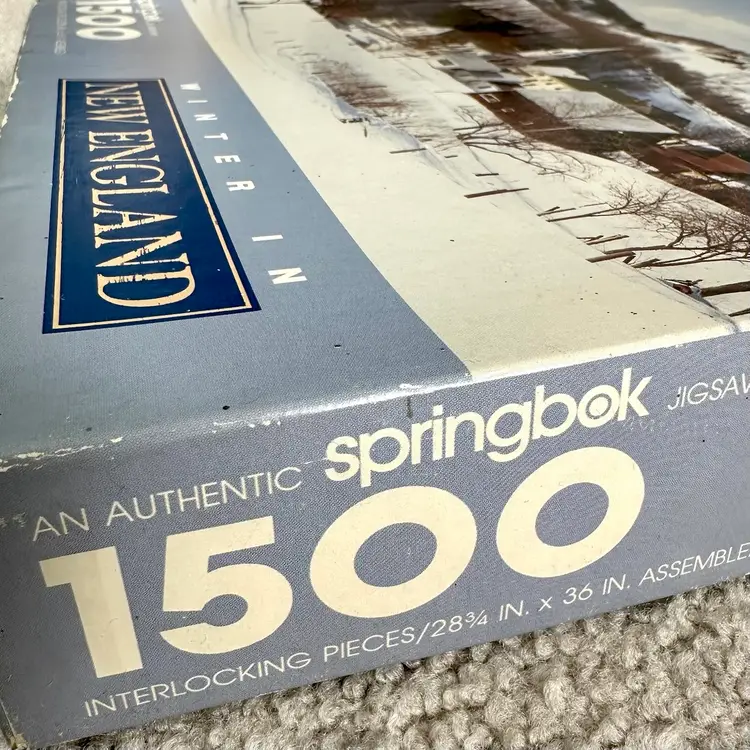 Vintage Springbok by Hallmark WINTER IN NEW ENGLAND 1500 interlocking piece jigsaw puzzle made by Hallmark Cards in USA. Features a serene winter scene of a New England village and countryside. Since most jigsaw puzzles actually have more pieces than the stated amount, this 1500 piece puzzle actually has 1504 total counted pieces and is complete. Puzzle pieces in excellent condition. Box in good condition with some edge-wear, scuffing and minor dents from handling and storage as shown. Ink inscription under lid and dated 1989. Tape as shown for securing lid closed during storage. Finished puzzle measures 28 3/4 x 36”. See pics for more details.