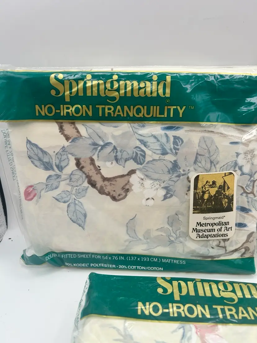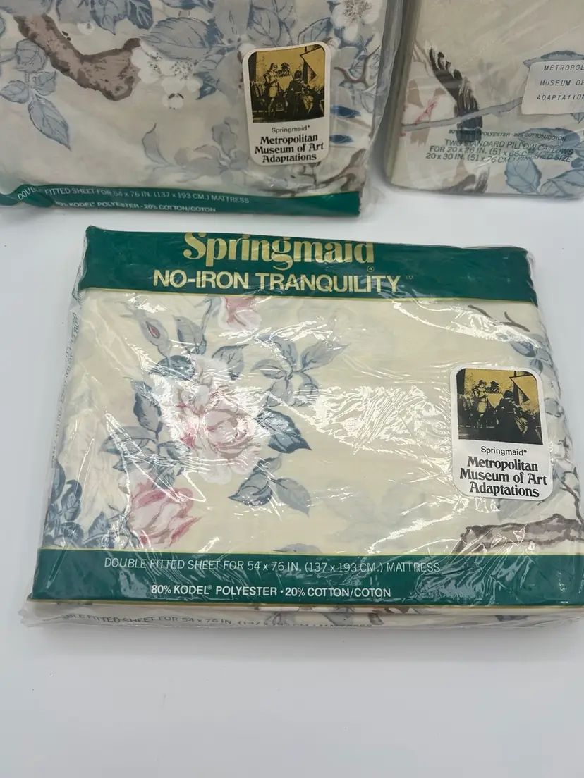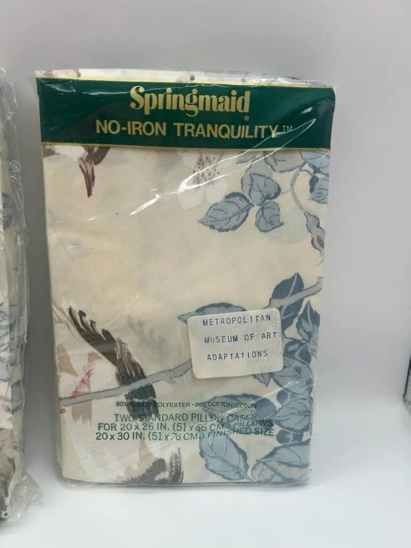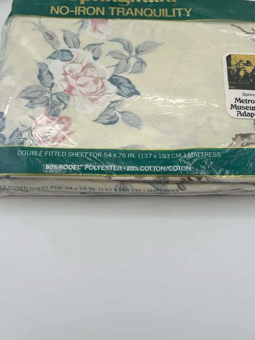 This product is a set of two Vintage Springmaid Wondercale double fitted salon rose florals pillowcases from the 1970s. Made from a percale and polyester blend material, these pillowcases feature a floral pattern in a multicolor design. Perfect for collectors or those looking to add a touch of vintage style to their bed and bath linens, this set includes both a fitted sheet and a flat sheet, making it versatile for use in twin or full-size beds.