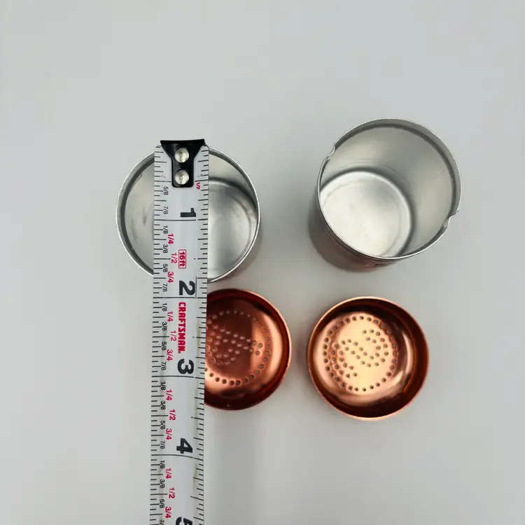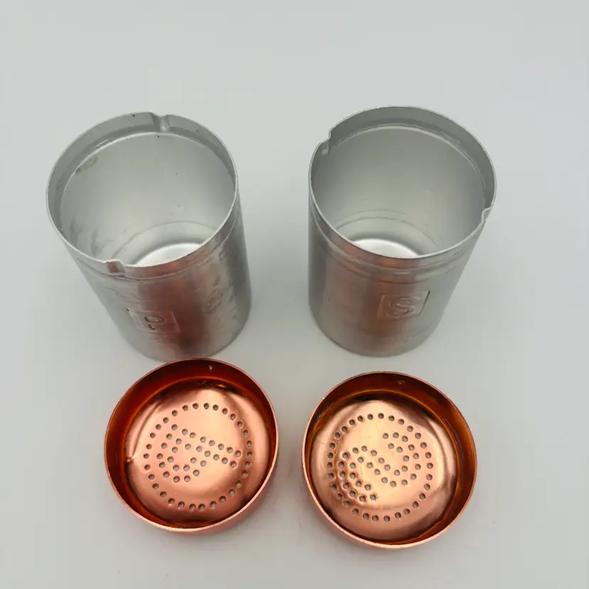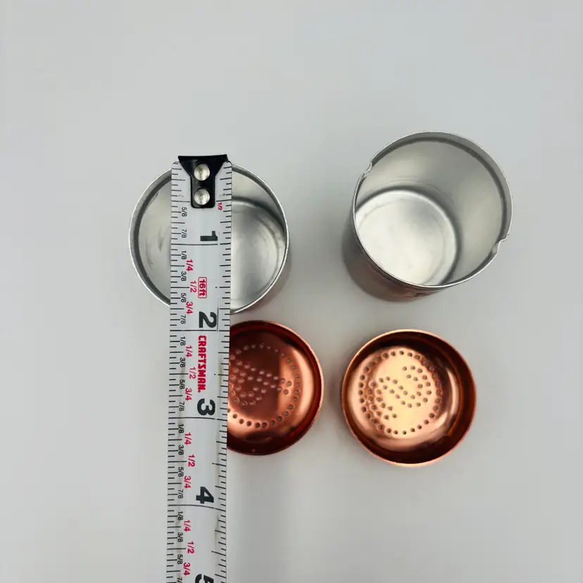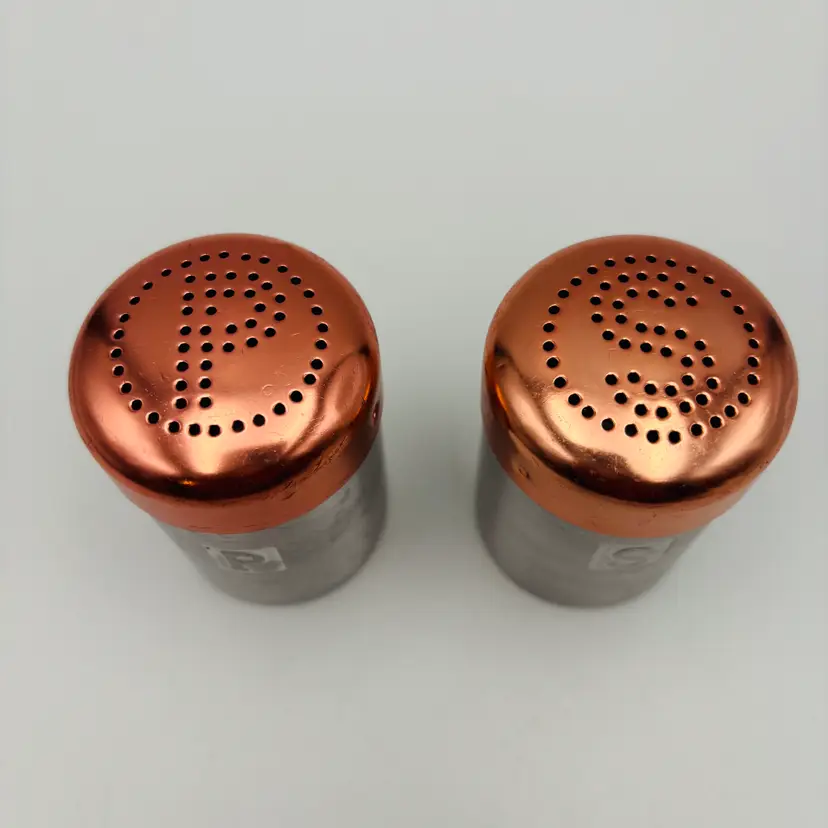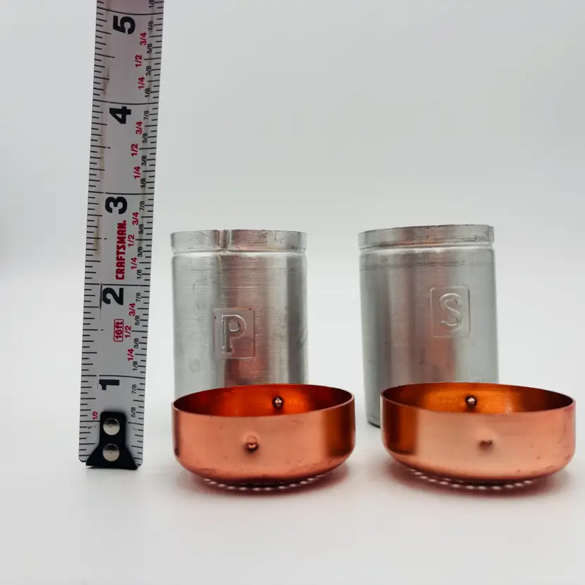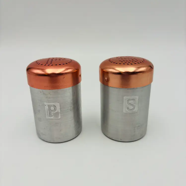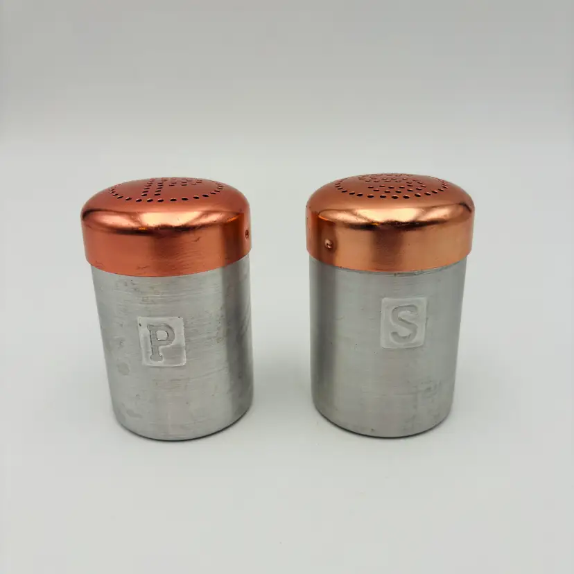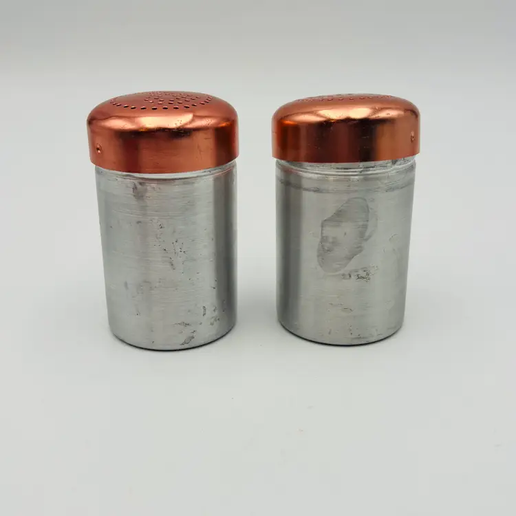 For sale is a Vintage Spun Aluminum Salt And Pepper Shakers Hong Kong Copper Lids