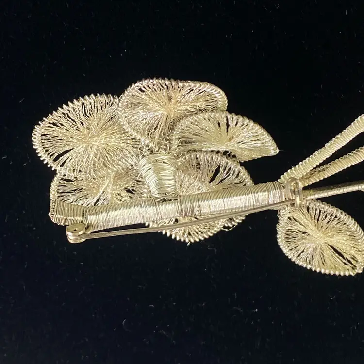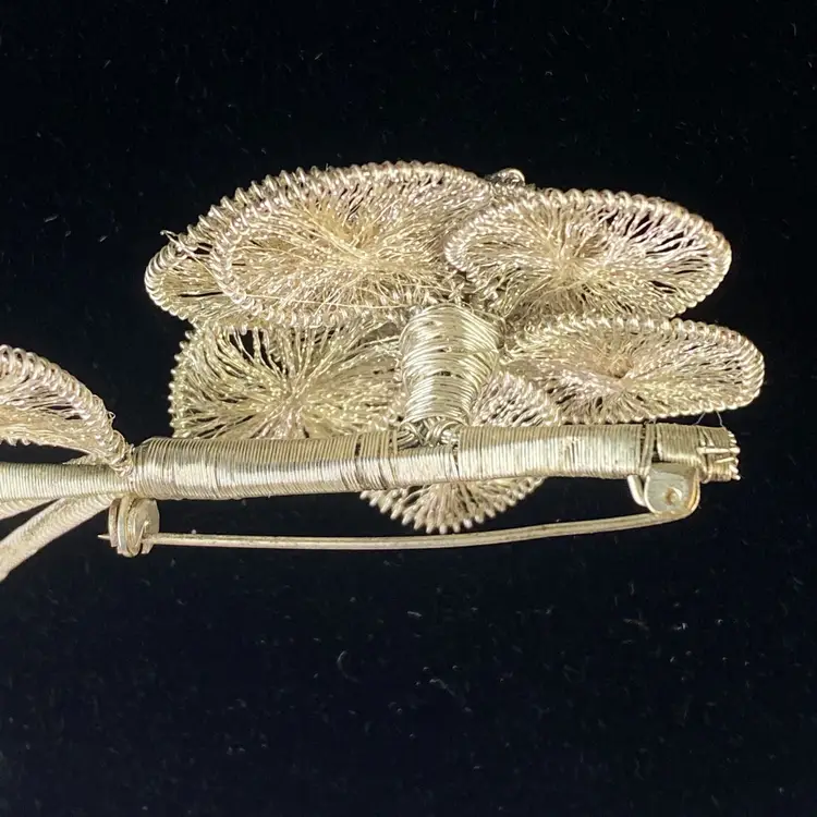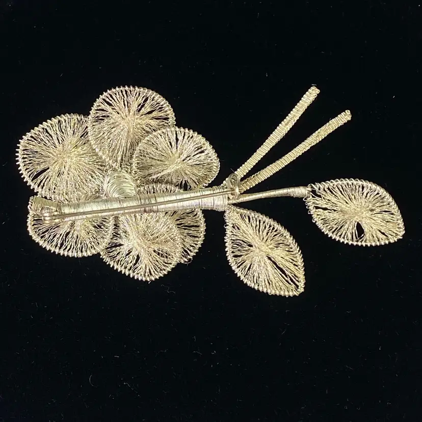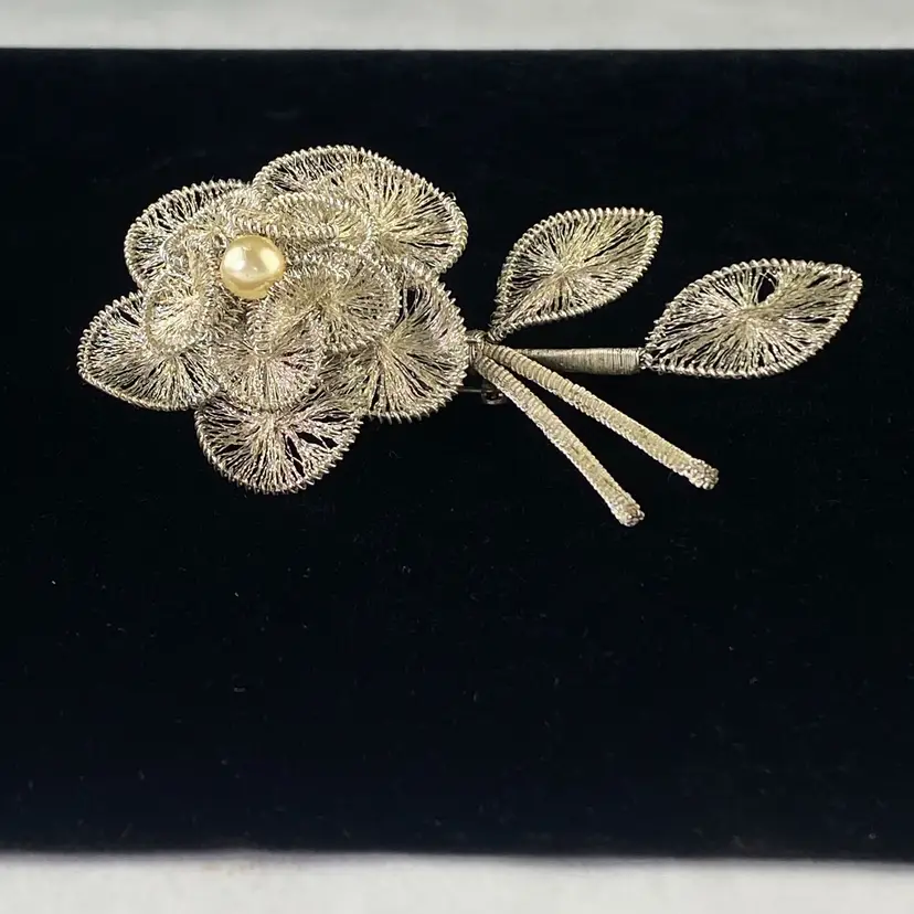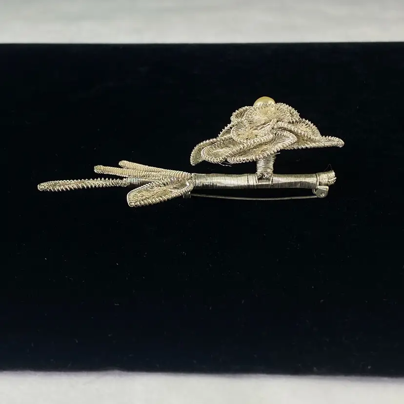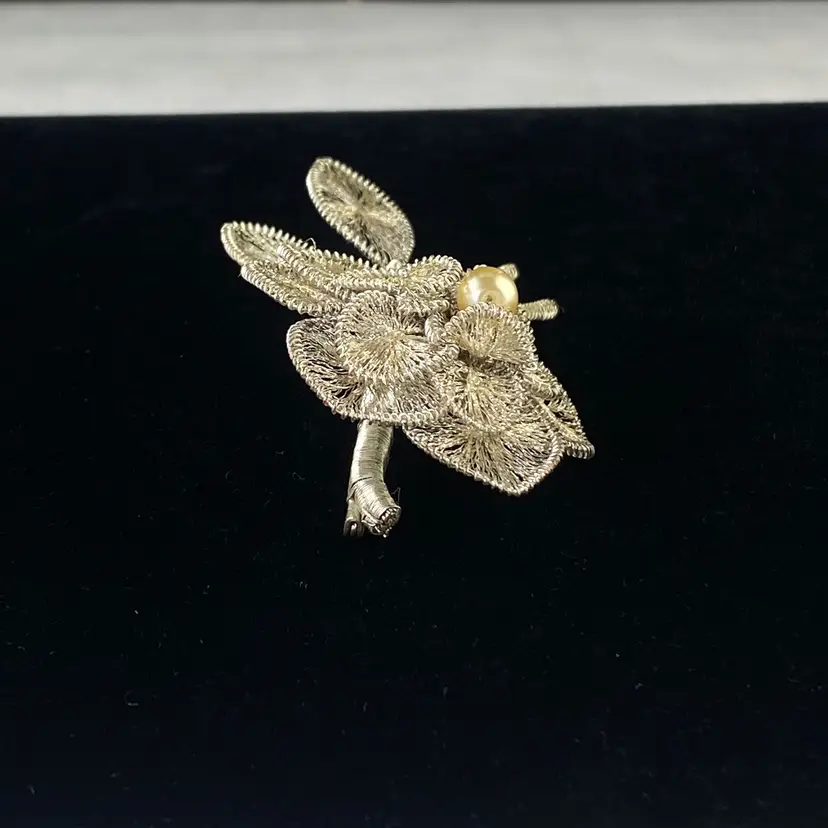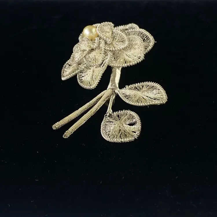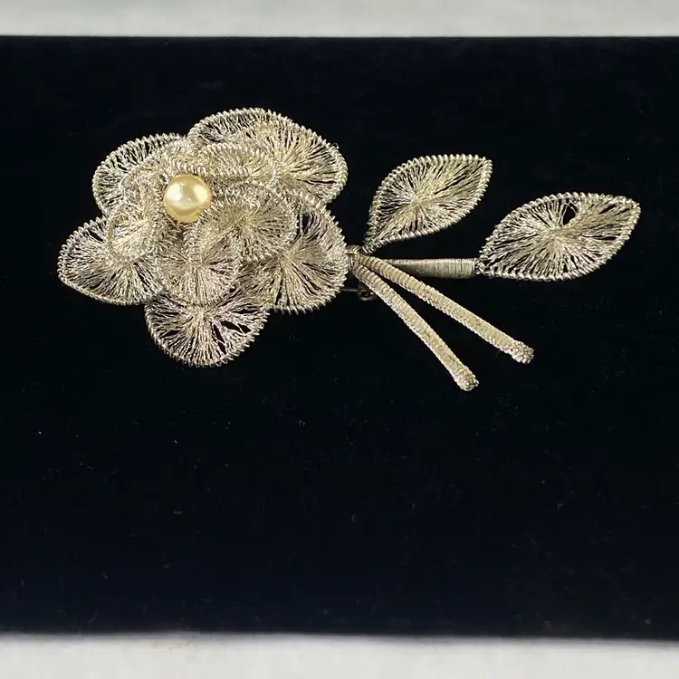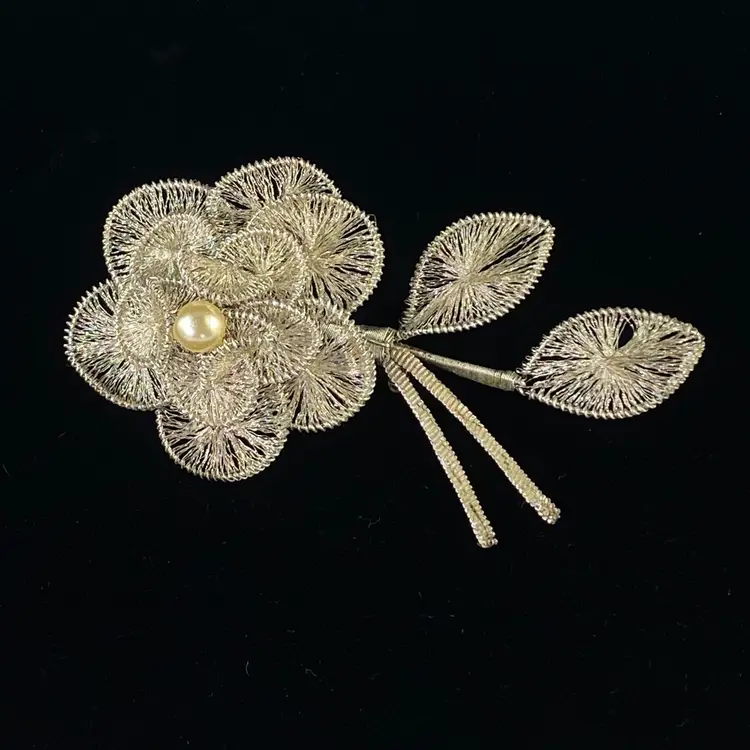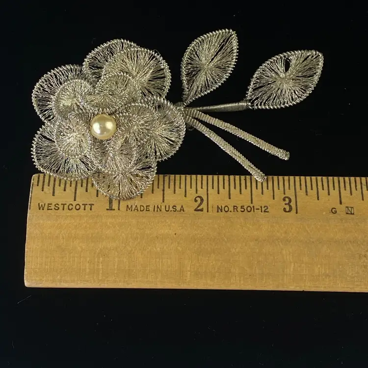 Vintage Spun Wire Silver Tone Flower Brooch Pin With Faux Pearl Accent