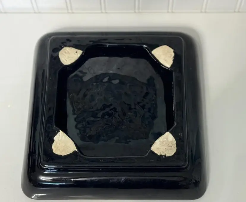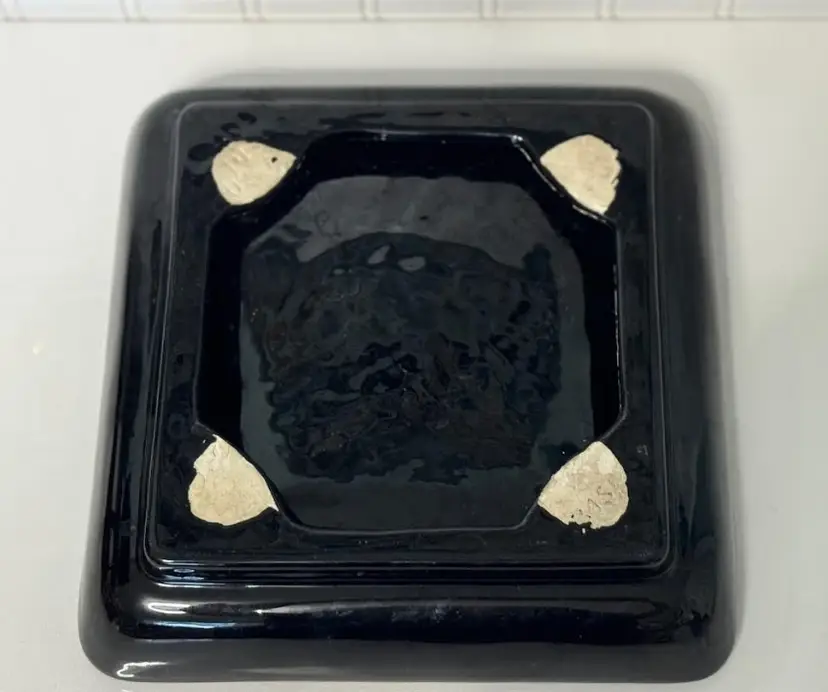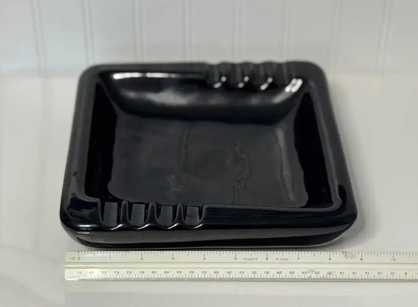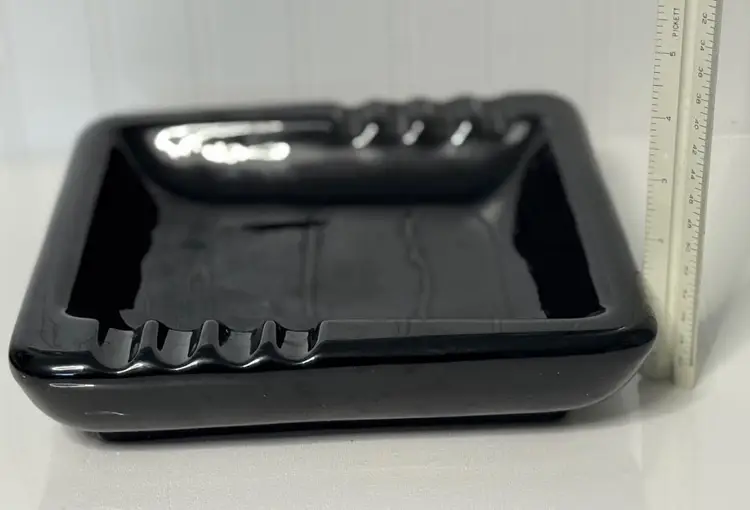 This Vintage Square Black Ceramic Ashtray, measuring 8.5 inches, is a unique and stylish piece of decorative pottery. Made in the U.S., this ashtray features a square shape and a sleek black color, perfect for adding a touch of sophistication to any space.