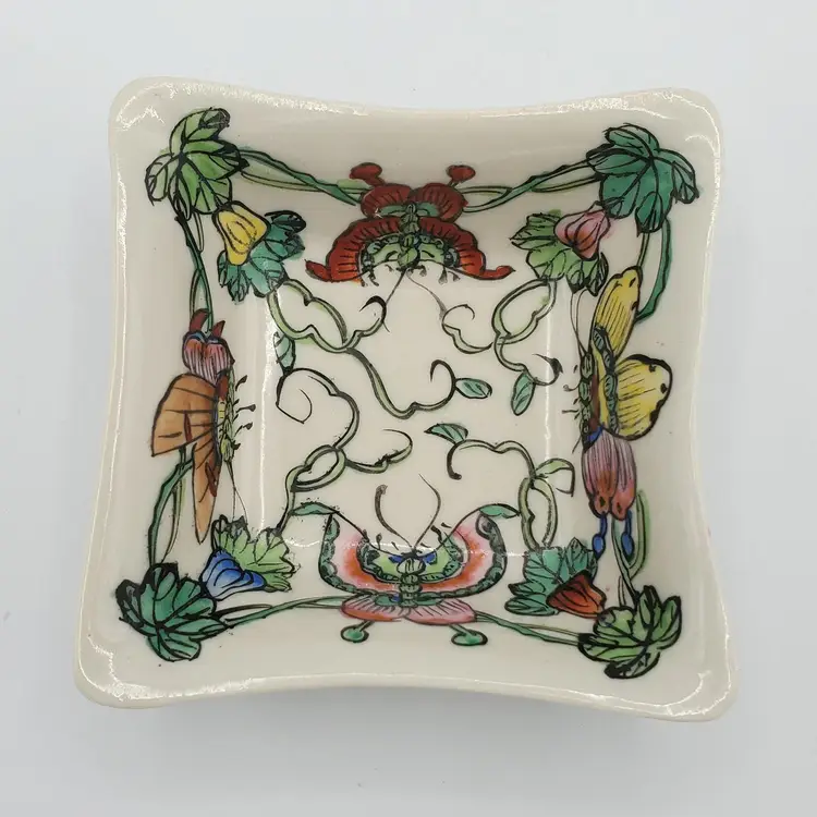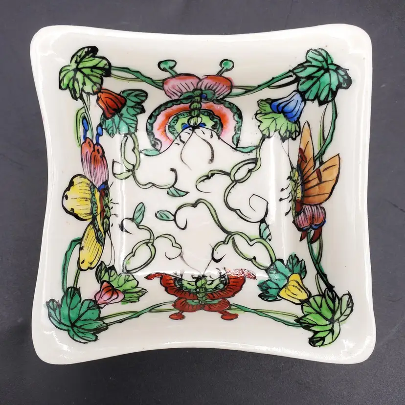 Beautiful vintage square ceramic dish featuring a hand-painted floral & butterfly design. Measures 4" diagonally across. No chips or cracks. Perfect for trinkets or as a decorative piece. Thanks for looking!
