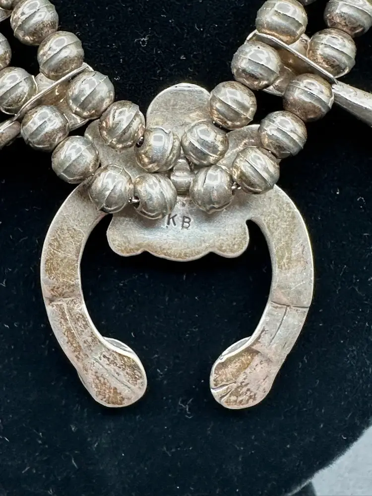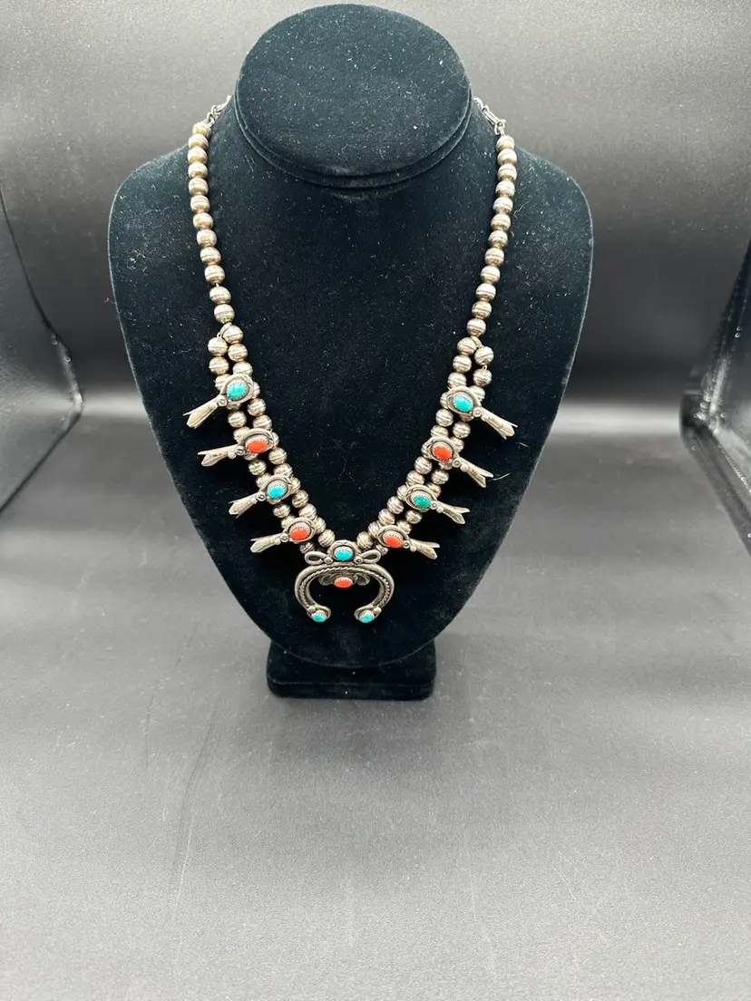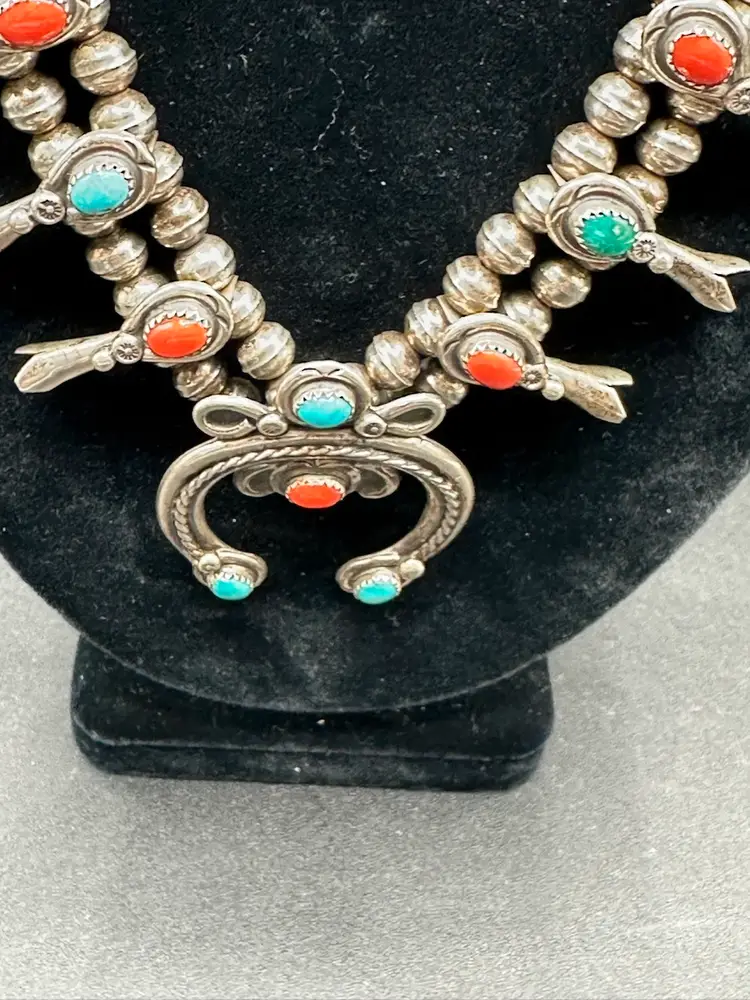 This is a stunning vintage turquoise and coral squash blossom necklace the back is stamped KB a beautiful addition to any collection! Smoke free home.