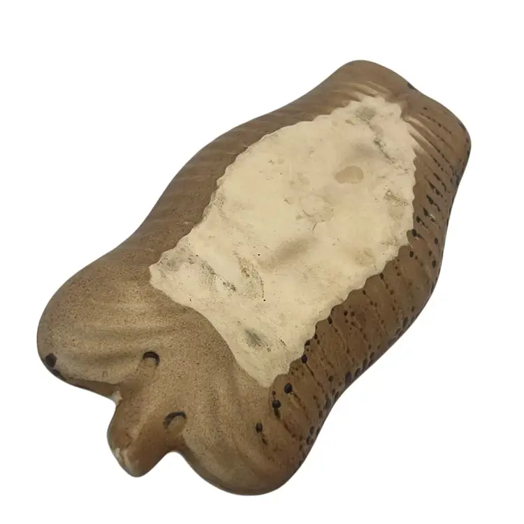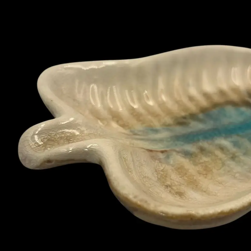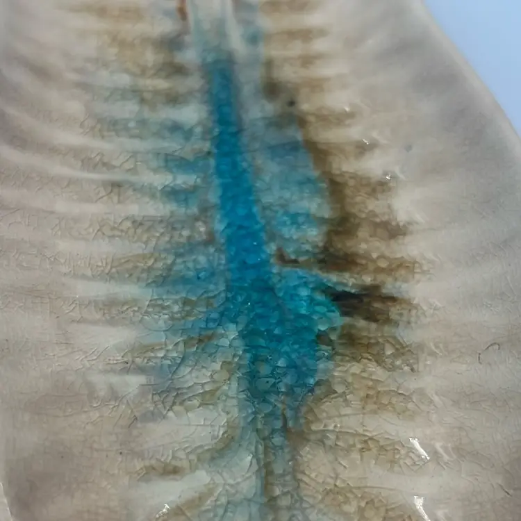 Handmade, no signature. Turquoise and brown crackle glass on sand colored pottery.