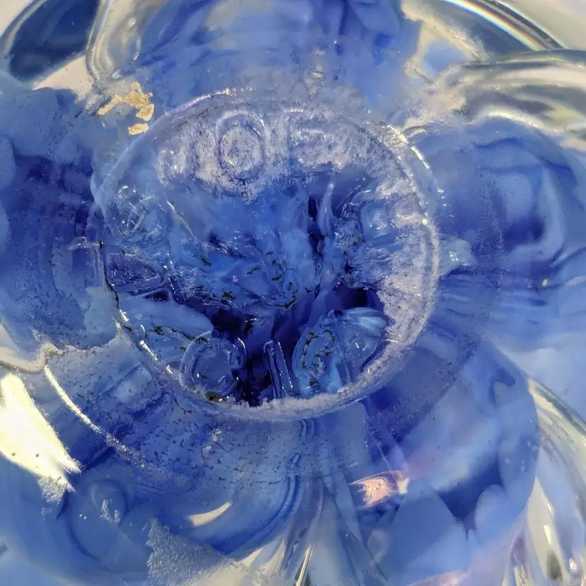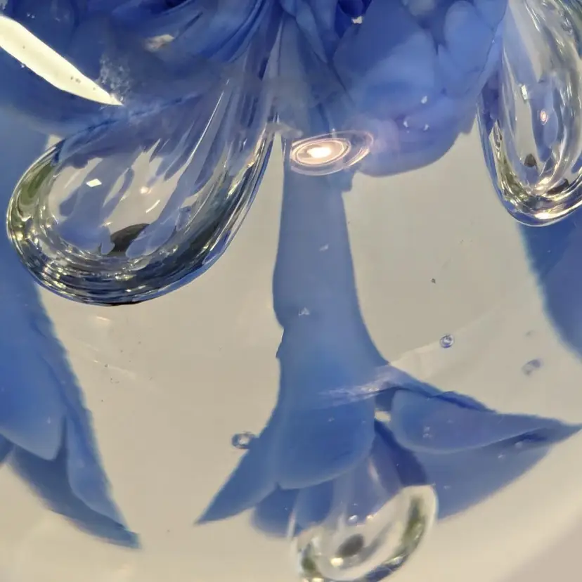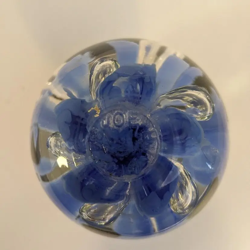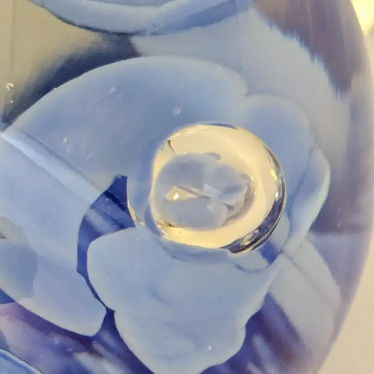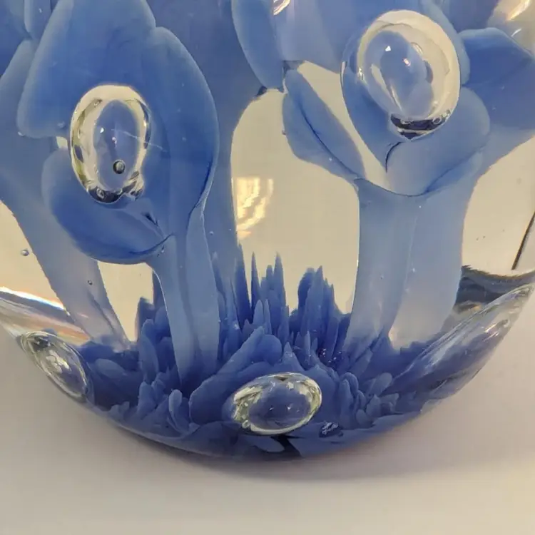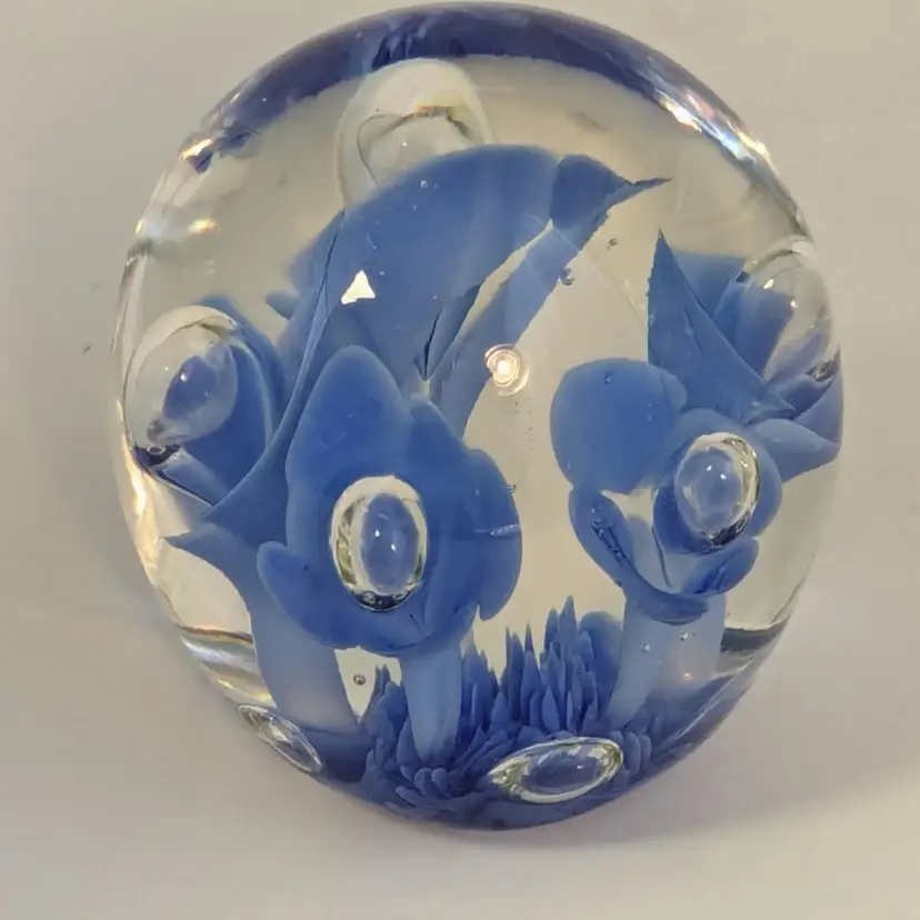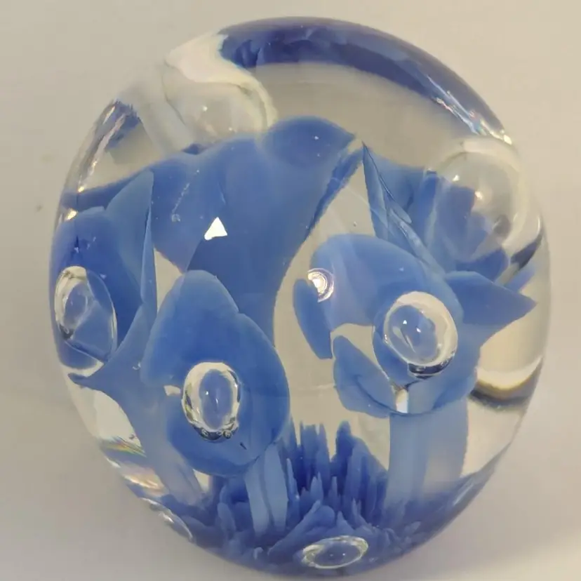 Beautiful glass paperweight featuring light blue flowers. Good condition 3" diameter.