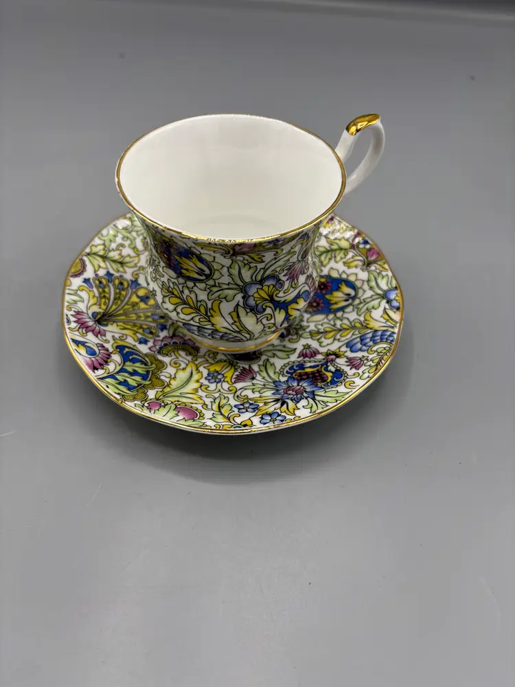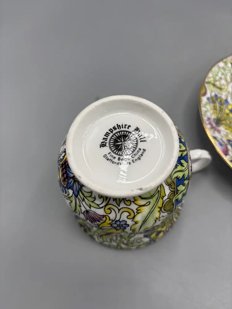 A charming vintage Staffordshire cup and saucer featuring delicate paisley detailing. This classic piece showcases traditional English craftsmanship with its intricate pattern and timeless design. Please note: The cup has a crack, making this ideal for display, decoration, or collectors who appreciate vintage character and authenticity. Measurements: Saucer: 5 3/4 inches Cup: 4 x 3 inches A lovely addition to any vintage collection or home décor enthusiast's shelf.