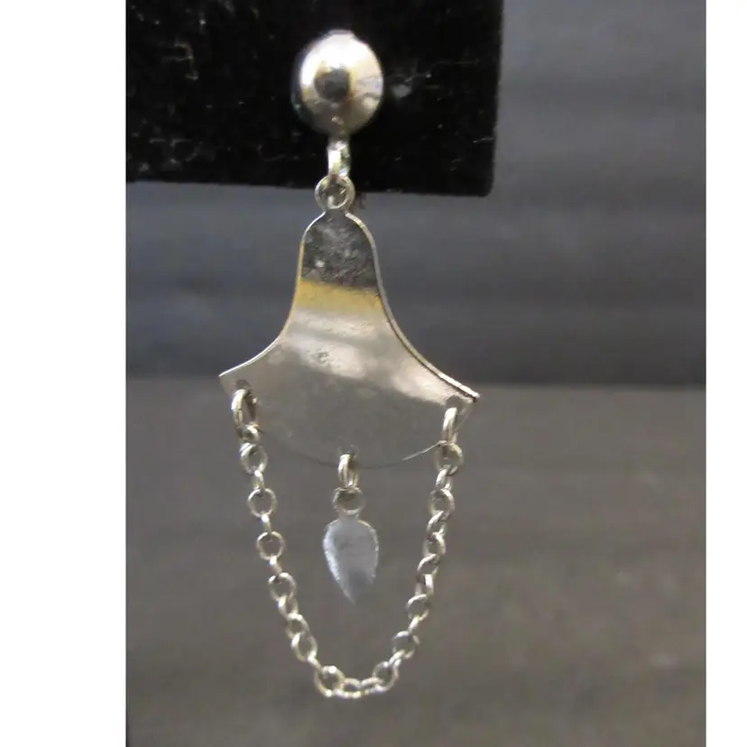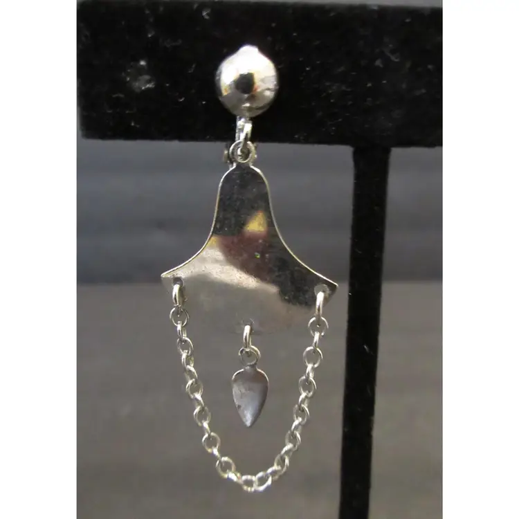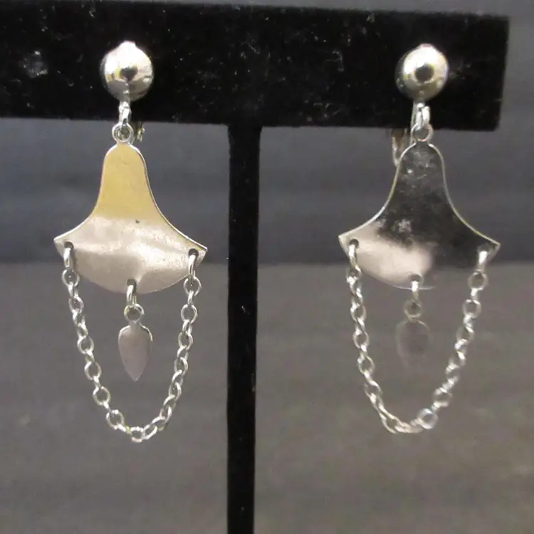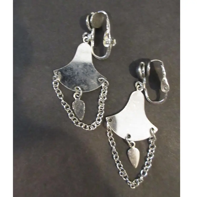 This is a SHINY vintage pair of punched stainless steel dangle earrings. They are shaped like bells with a dangling clapper. Each has a small silver tone chain attached to the bottom for a more dangly effect. These earrings are clip-ons and are about 2 inches long (with the chain).