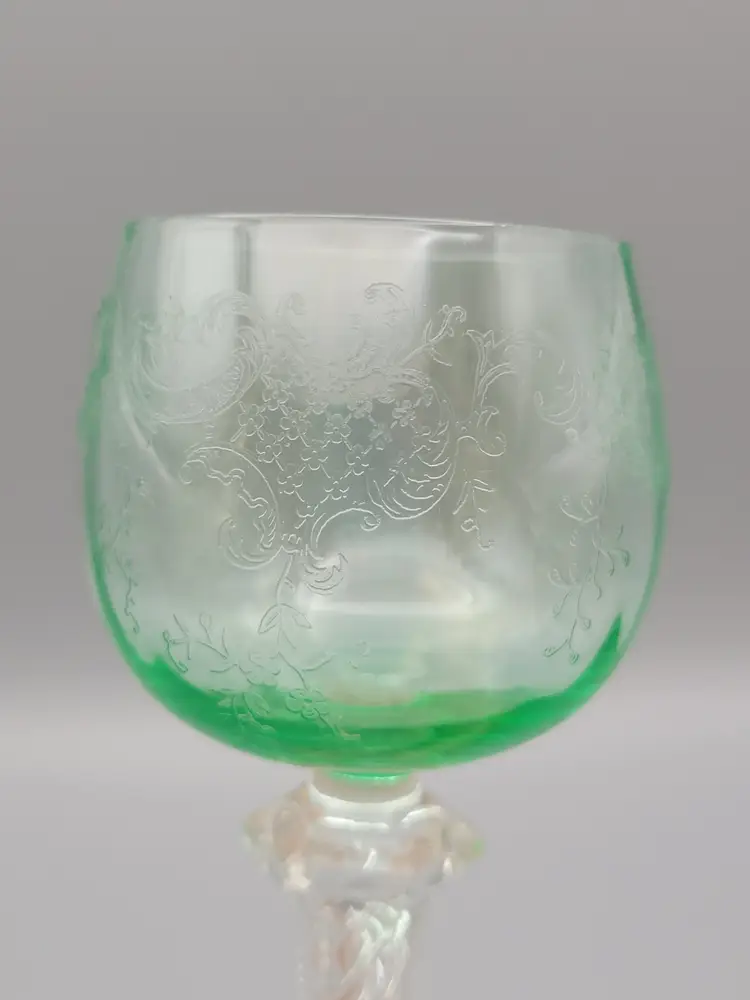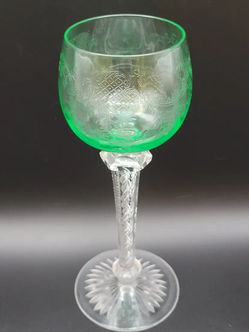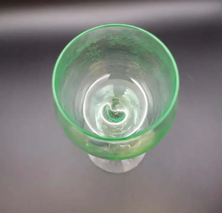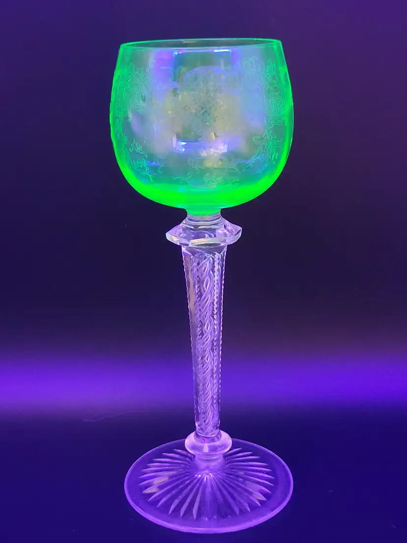 St. Louis art glass goblet with acid etched bowl that has a brilliant UV glow. The stem is air twisted, cut and notched. Measuring approximately 7.25 inches tall, opening is 2.25 inches in diameter, and base is 2.5 inches in diameter. In excellent condition, no chips or cracks. Surface wear on the bottom showing it's age. Thank you for looking and have a great day!