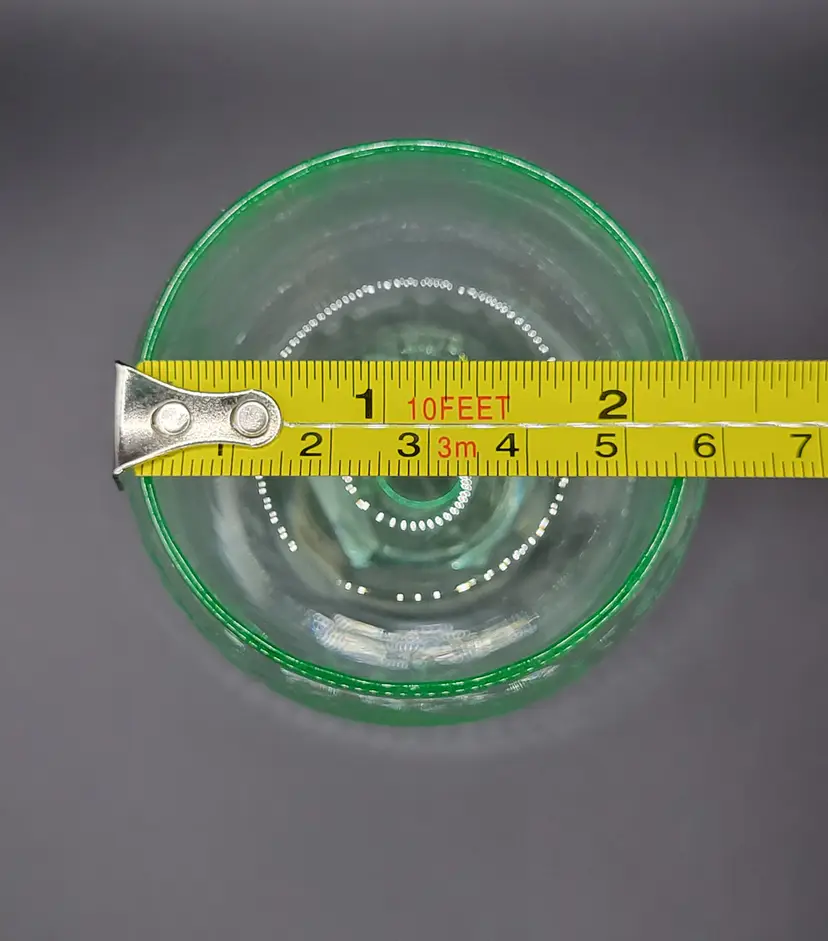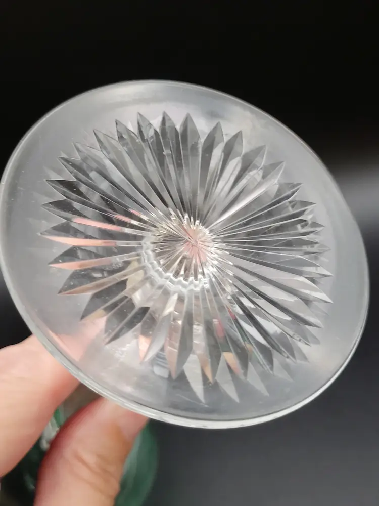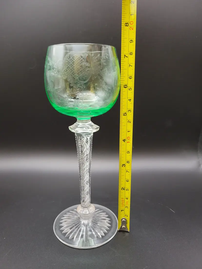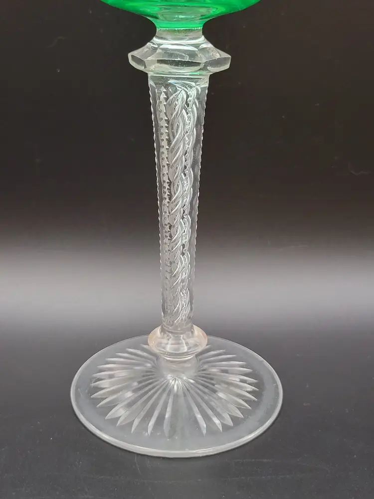St. Louis art glass goblet with acid etched bowl that has a brilliant UV glow. The stem is air twisted, cut and notched. Measuring approximately 7.25 inches tall, opening is 2.25 inches in diameter, and base is 2.5 inches in diameter. In excellent condition, no chips or cracks. Surface wear on the bottom showing it's age. Thank you for looking and have a great day!
