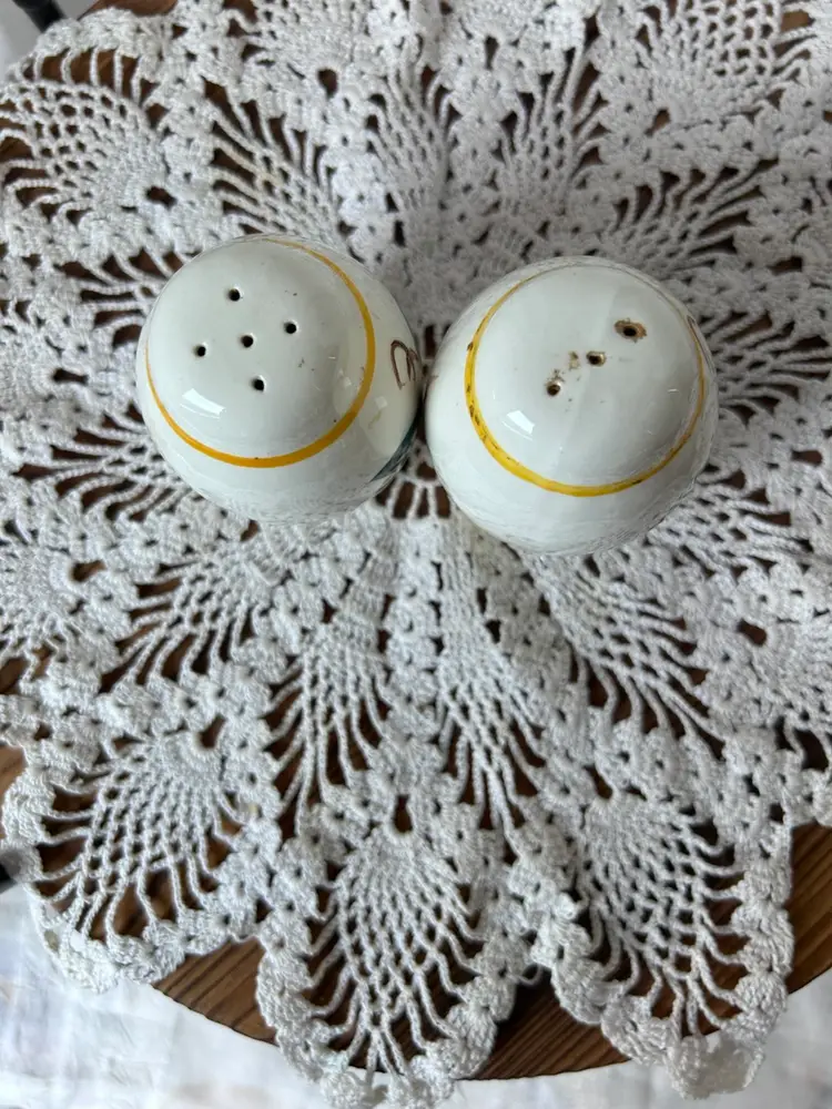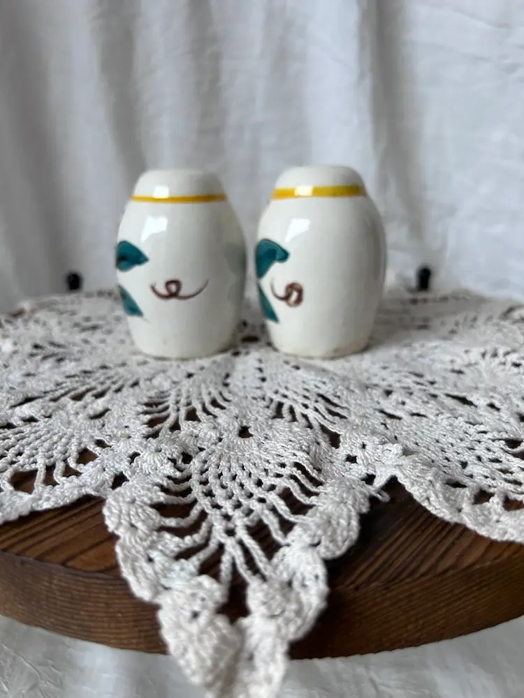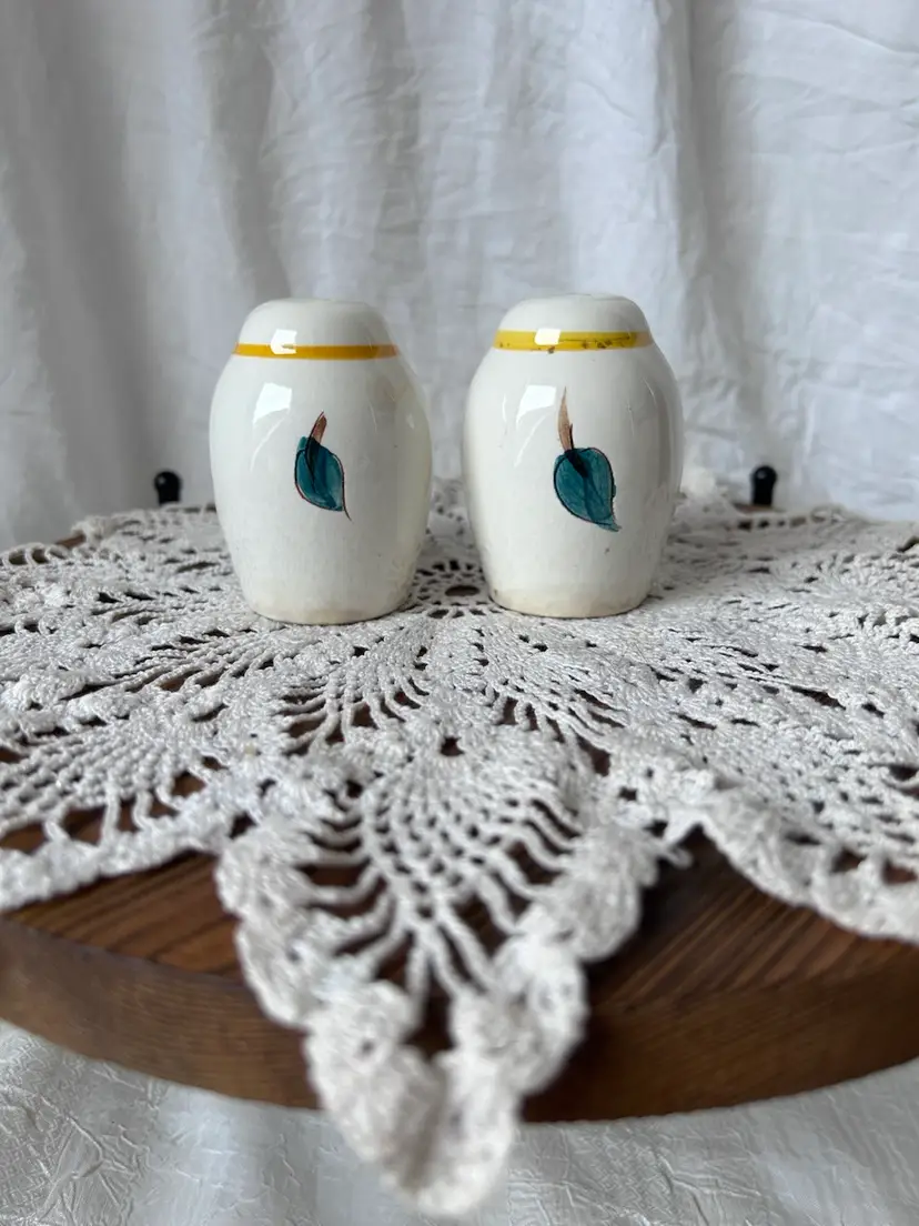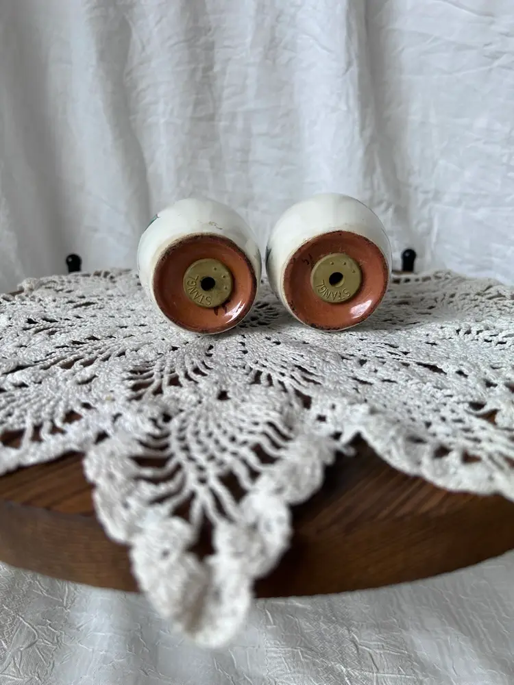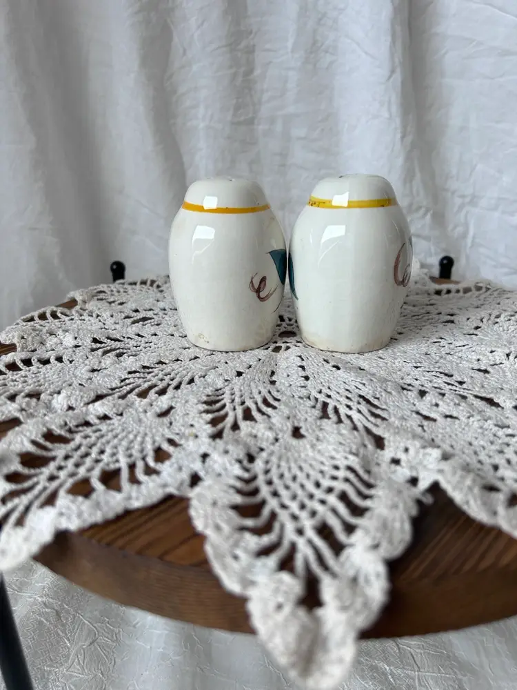 The shakers are part of the “Fruit” pattern by STANGL which was first introduced in 1942. There is some small areas of discoloration to the bottom of each shaker but no other flaws. They measure 3” tall by 2” wide. Their original cork stoppers are included. I have other STANGL items listed.