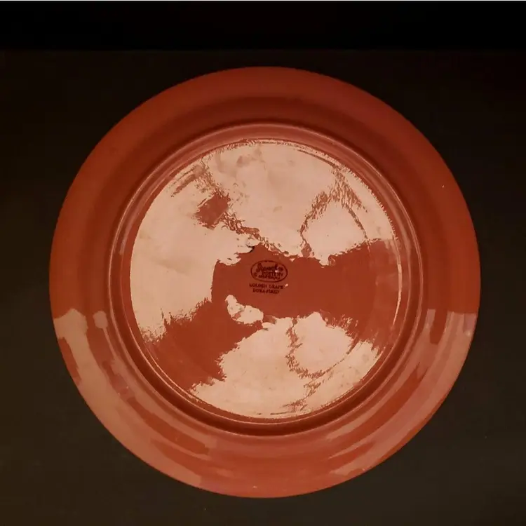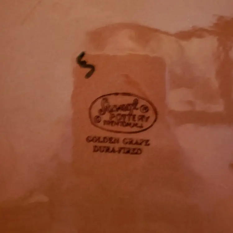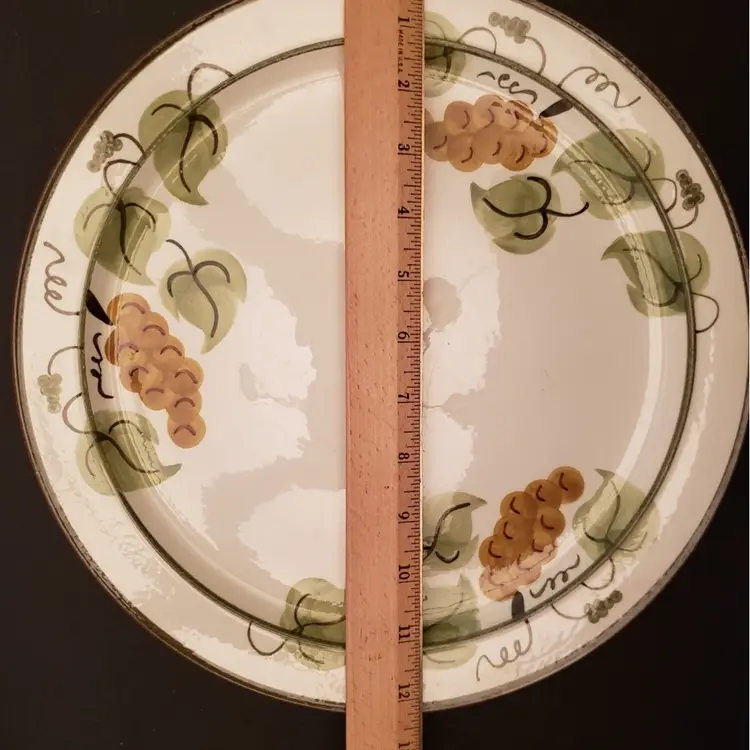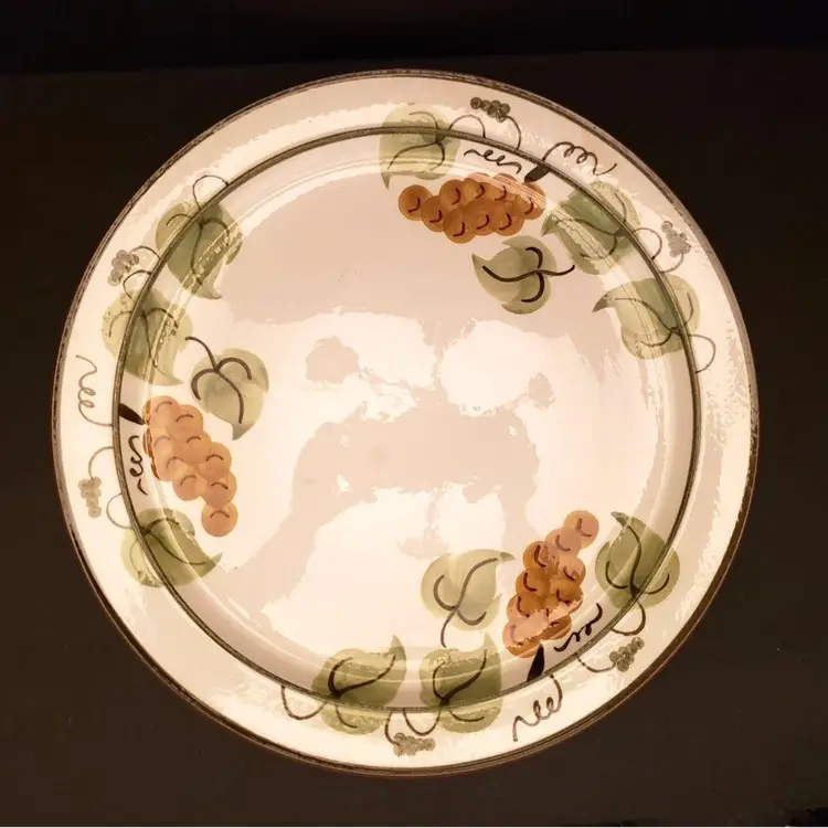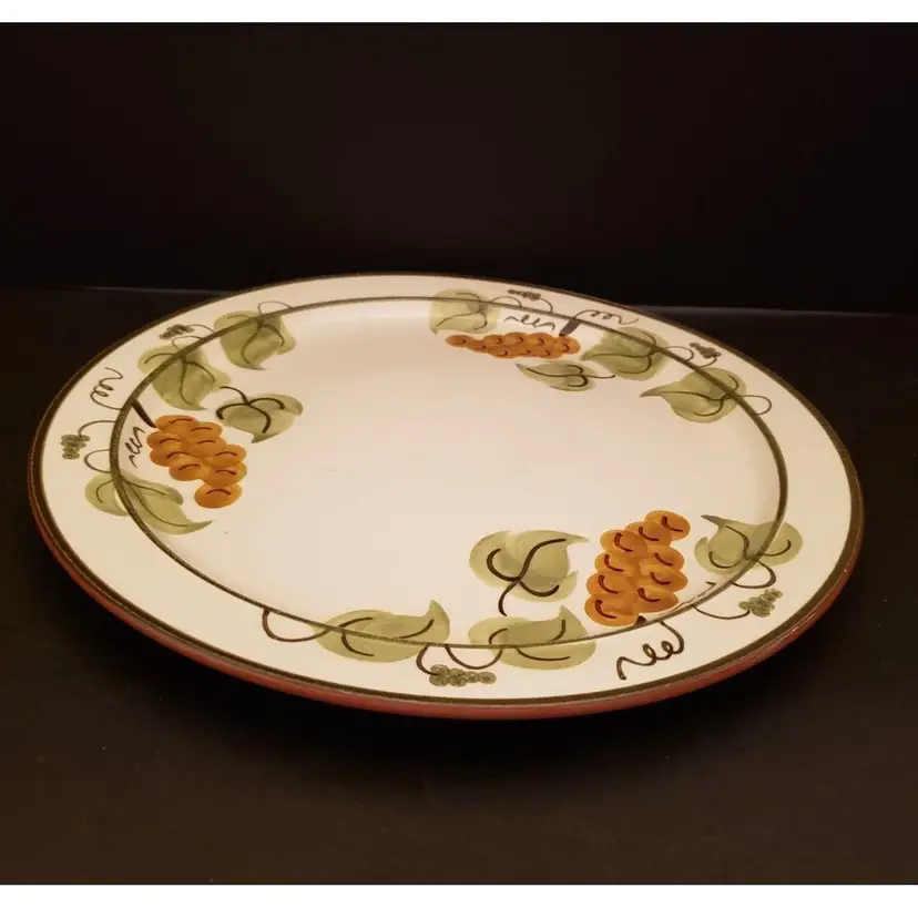 Vintage Golden Grapes Pattern Maker: Stangl Pottery Material: Ceramic Pottery Origin: Trenton, New Jersey, USA Color: Brown cream gold yellowish green Description: Stangl Pottery large round platter in the Golden Grapes pattern. Hand painted grapes, grape leaves and vines in the pattern. The colors are Reddish-brown, cream, gold, yellowish green. Made in Trenton, New Jersey, USA. This pattern was produced only during the years 1963 - 1978 and is no longer being made, retired.